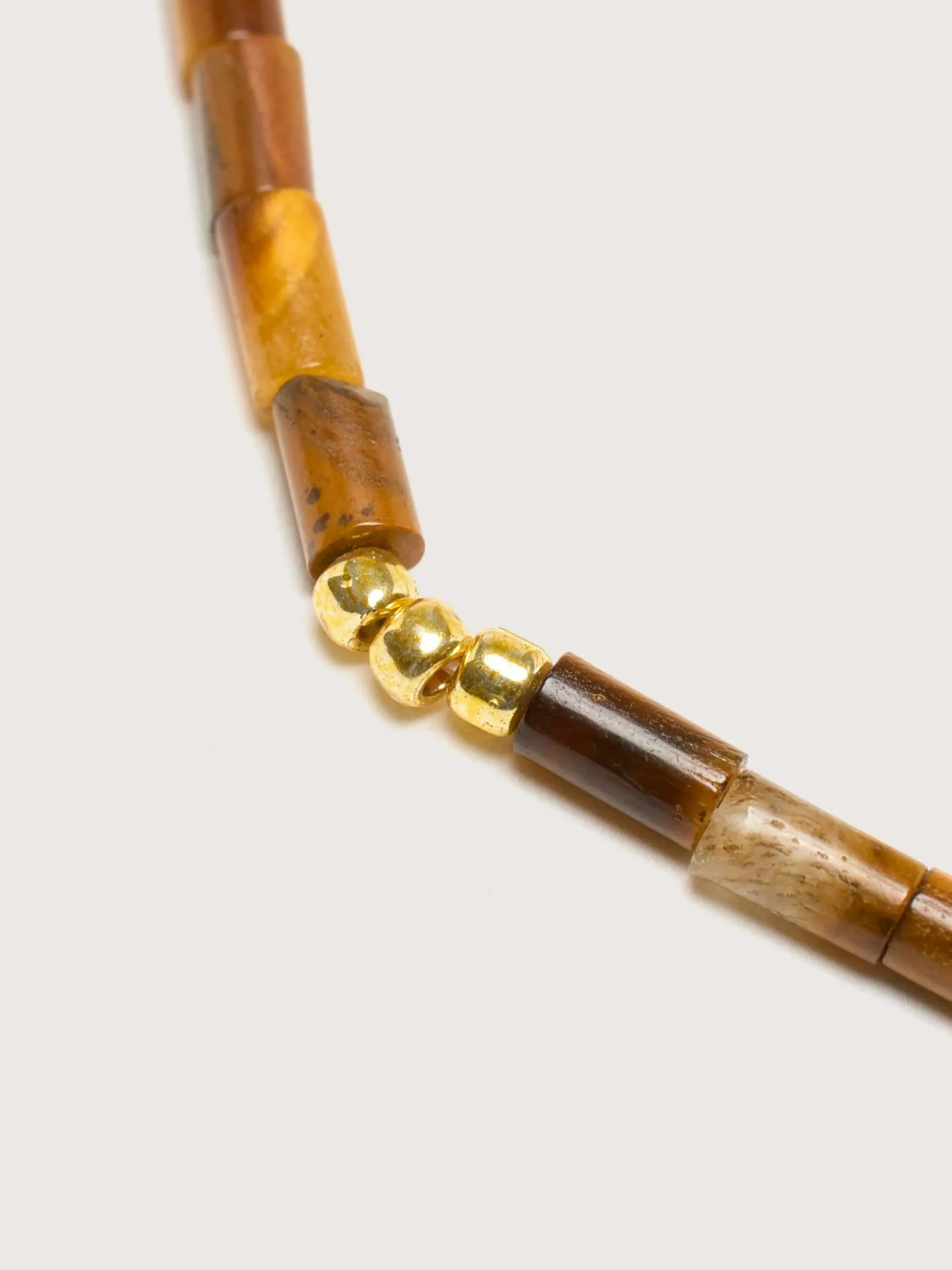 Le bracelet Sun Stalker d’Anni Lu est composé de pierres Œil de Tigre et de perles de verre, et de laiton plaqué or 18 carats.