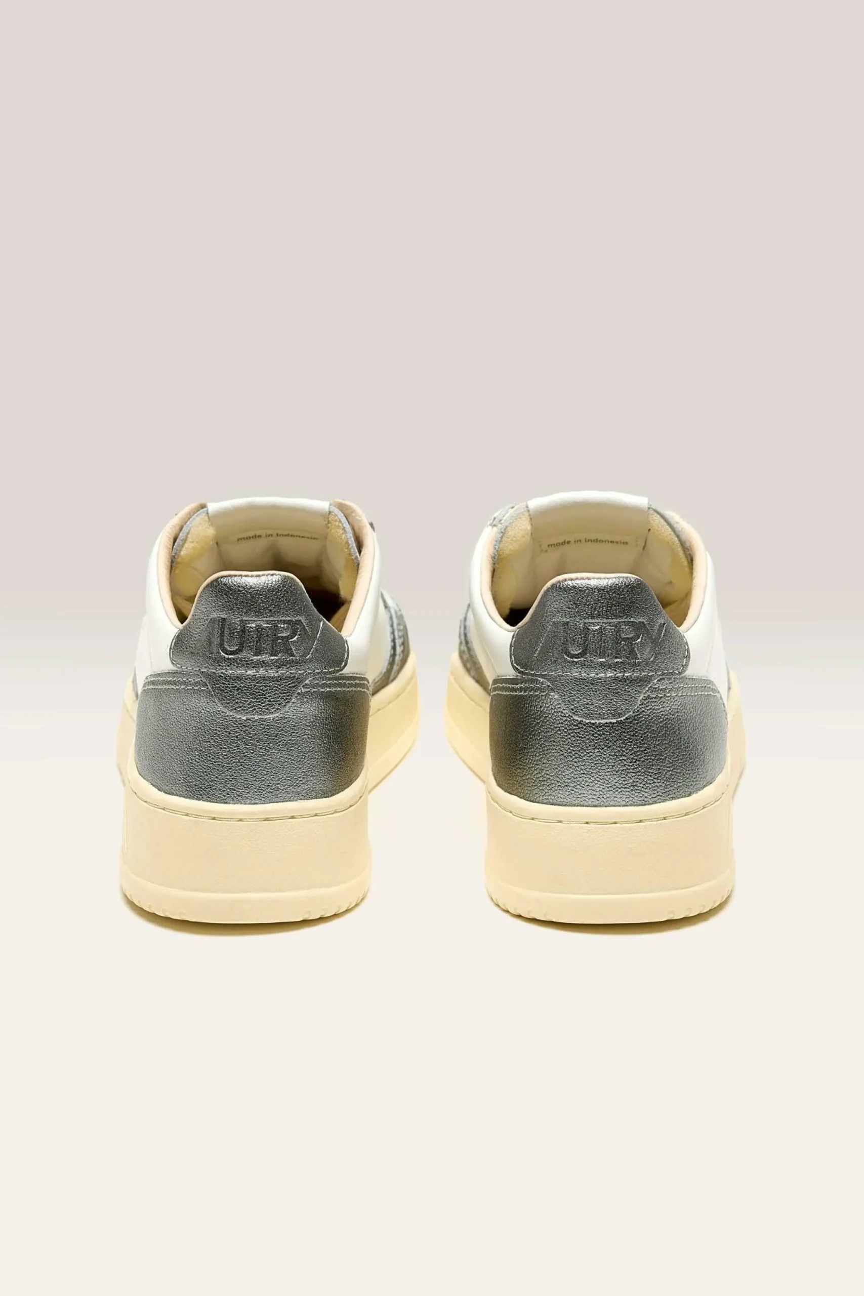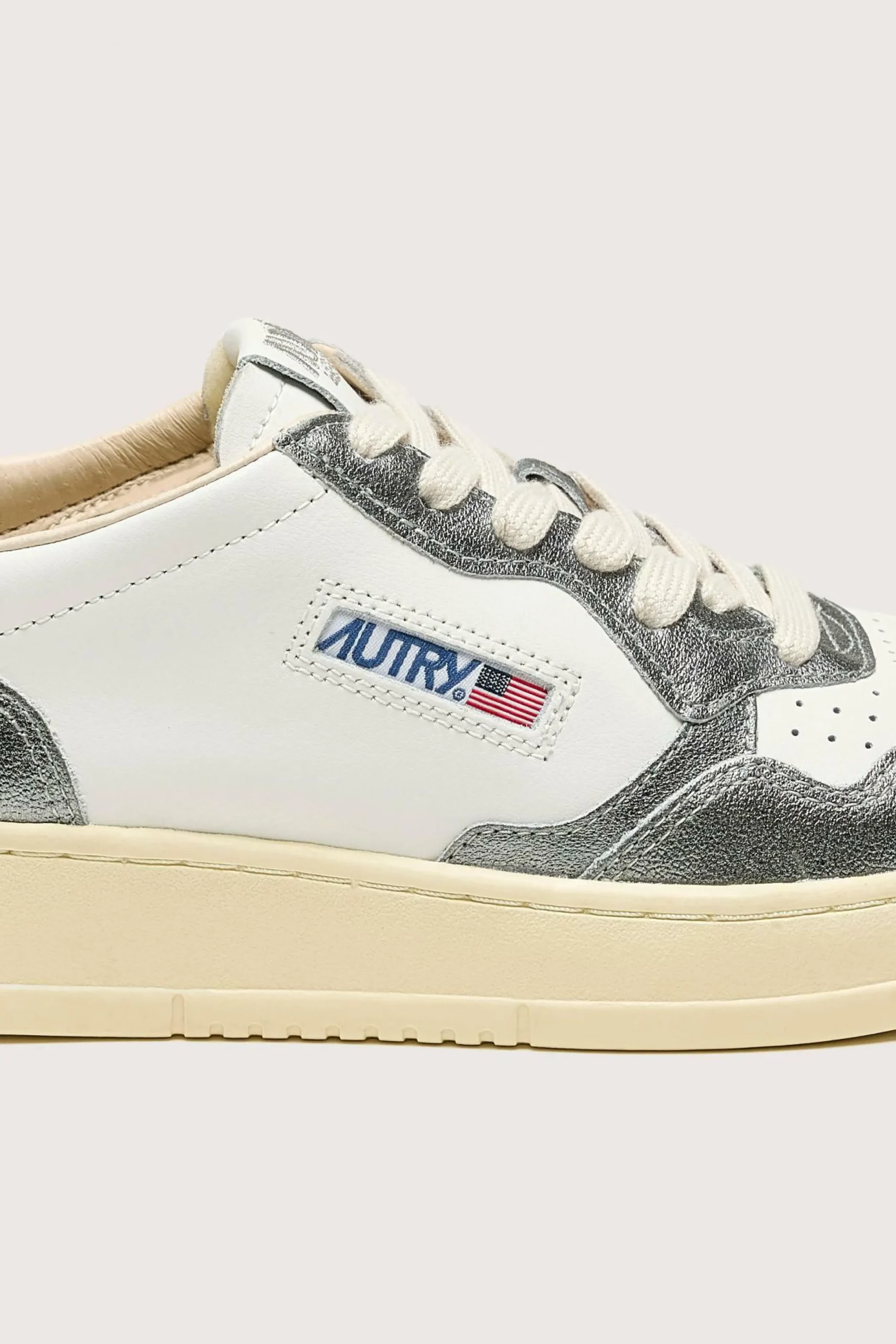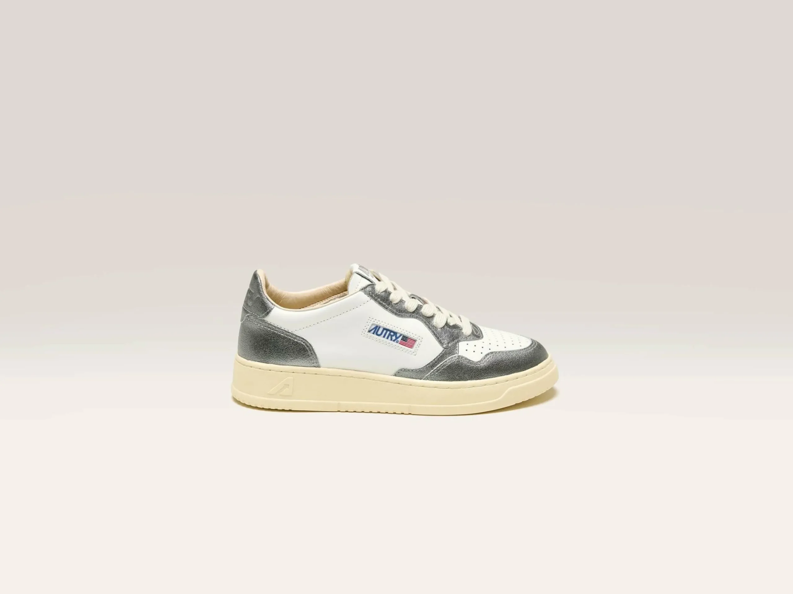 Les sneakers Autry Medalist Low Bicolor présentent une tige en cuir souple blanc et gris acier avec un bout perforé.