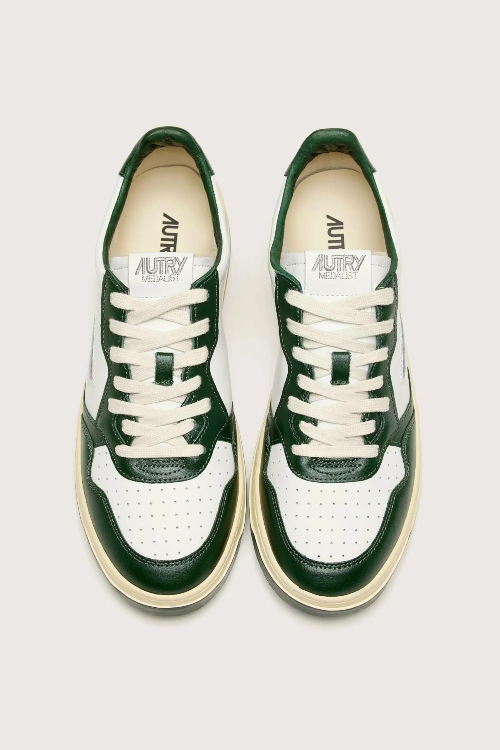 La sneakers Autry Medalist Low Bicolor présente une tige en cuir souple blanc et vert avec un bout perforé.