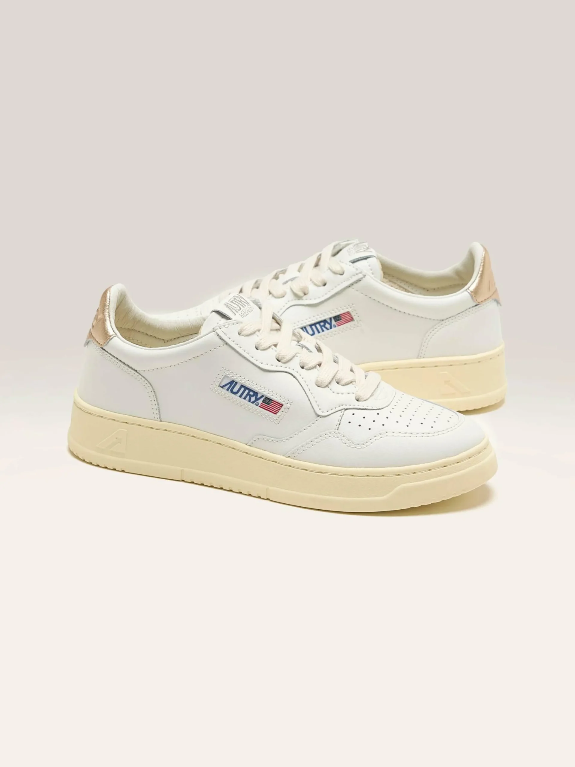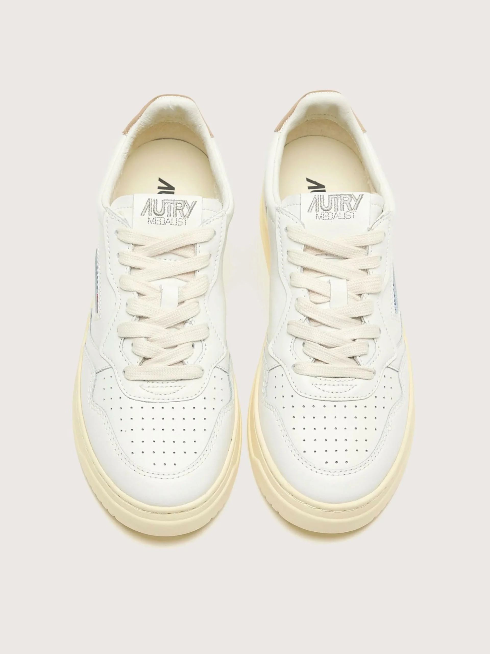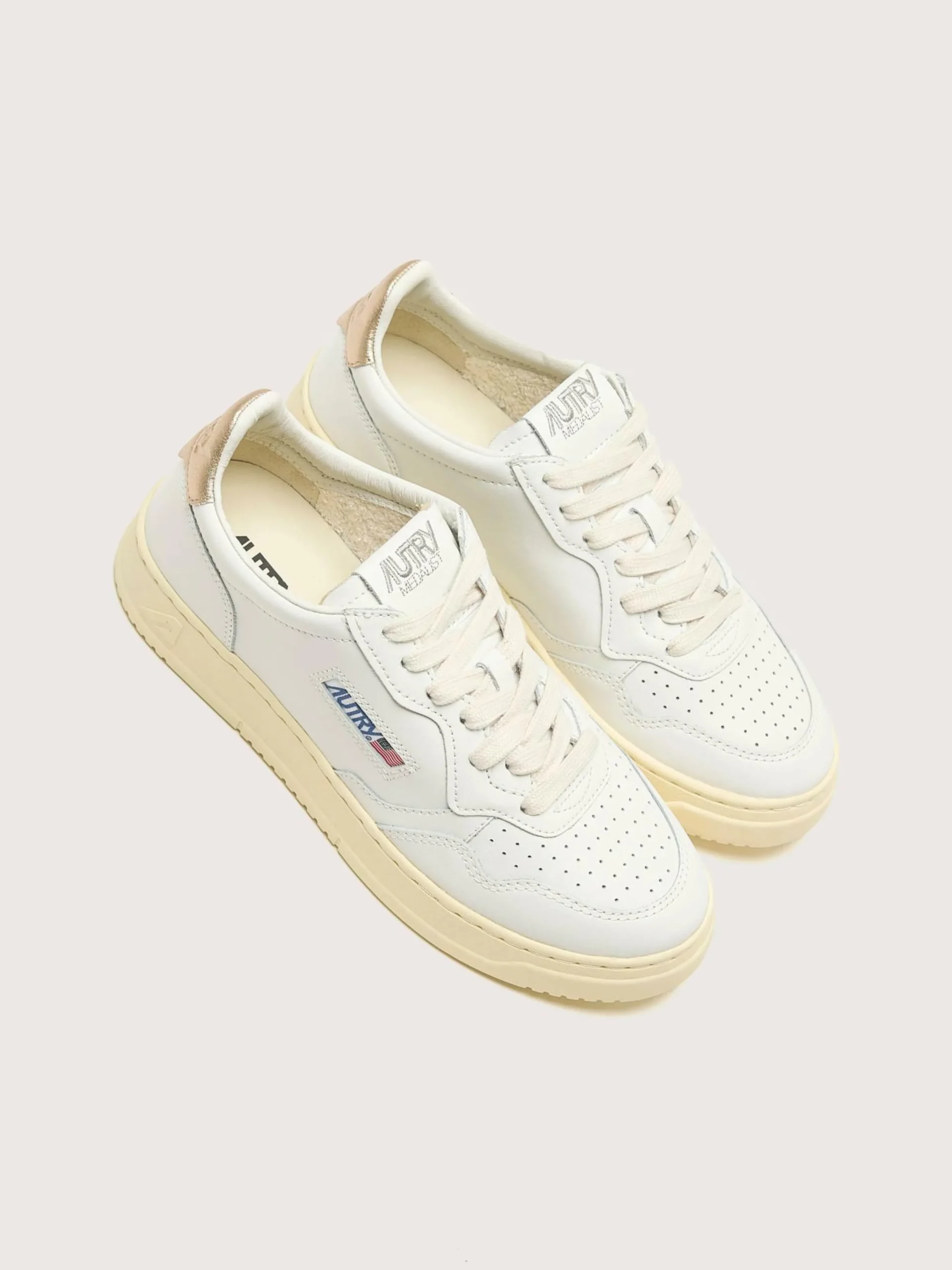 Les sneakers Autry Medalist Low présentent une silhouette sportive en cuir blanc avec une languette de talon en cuir doré.