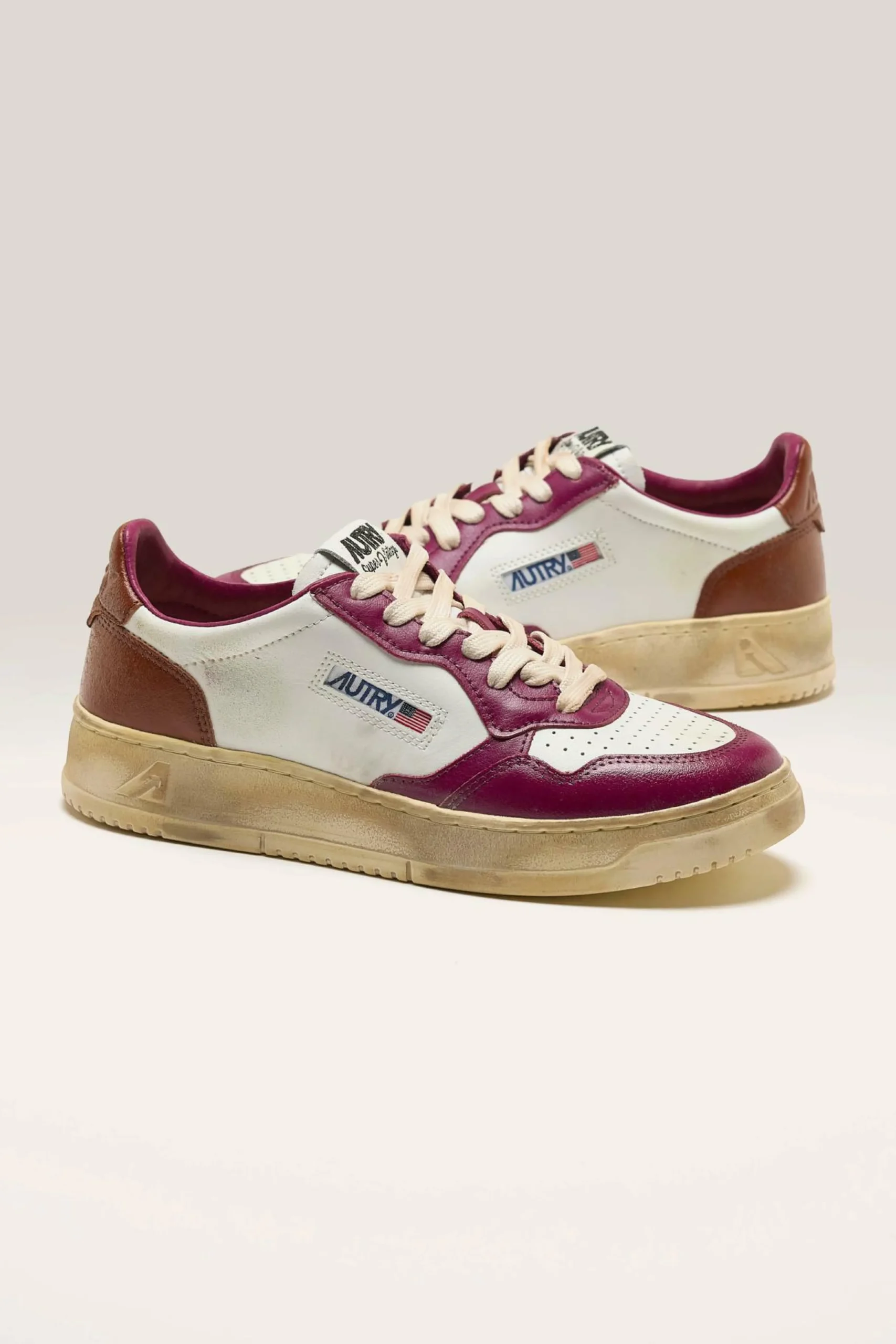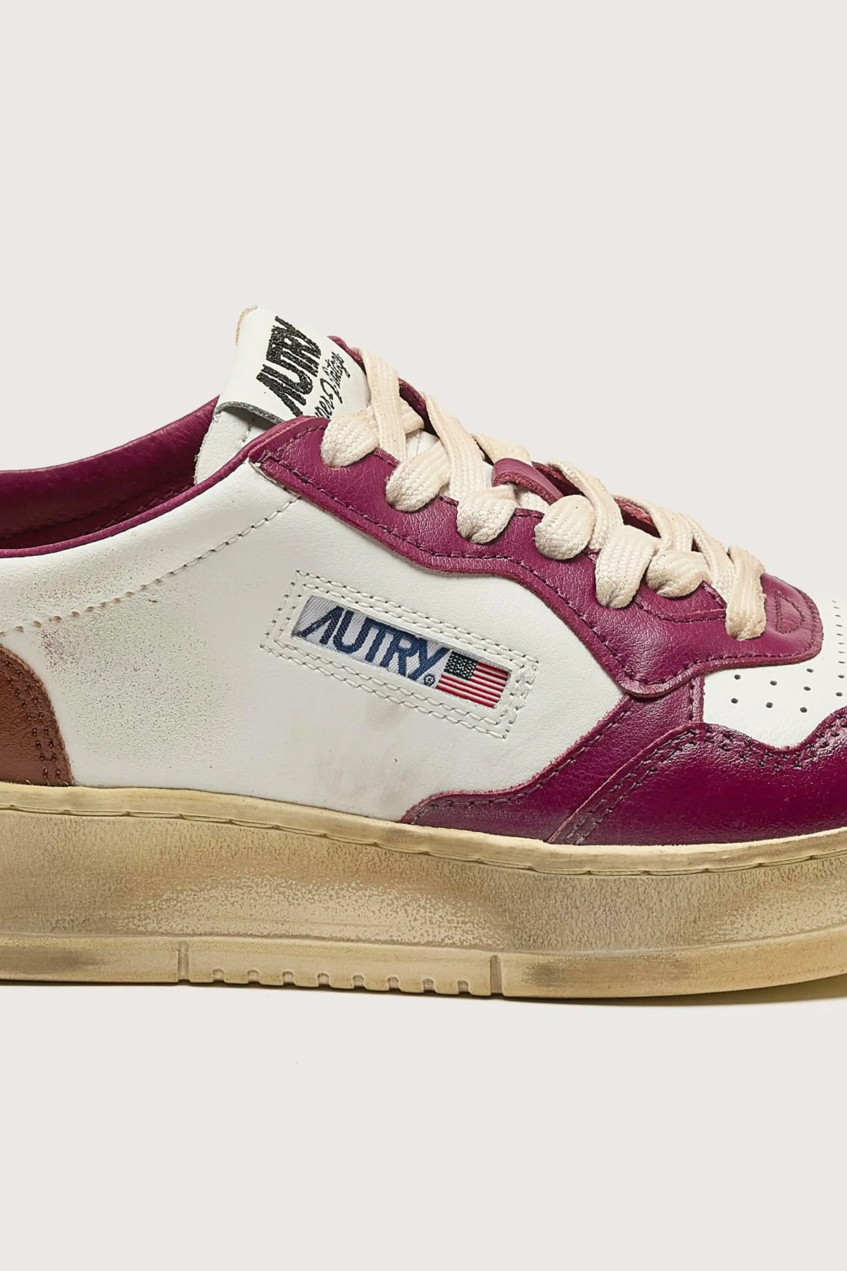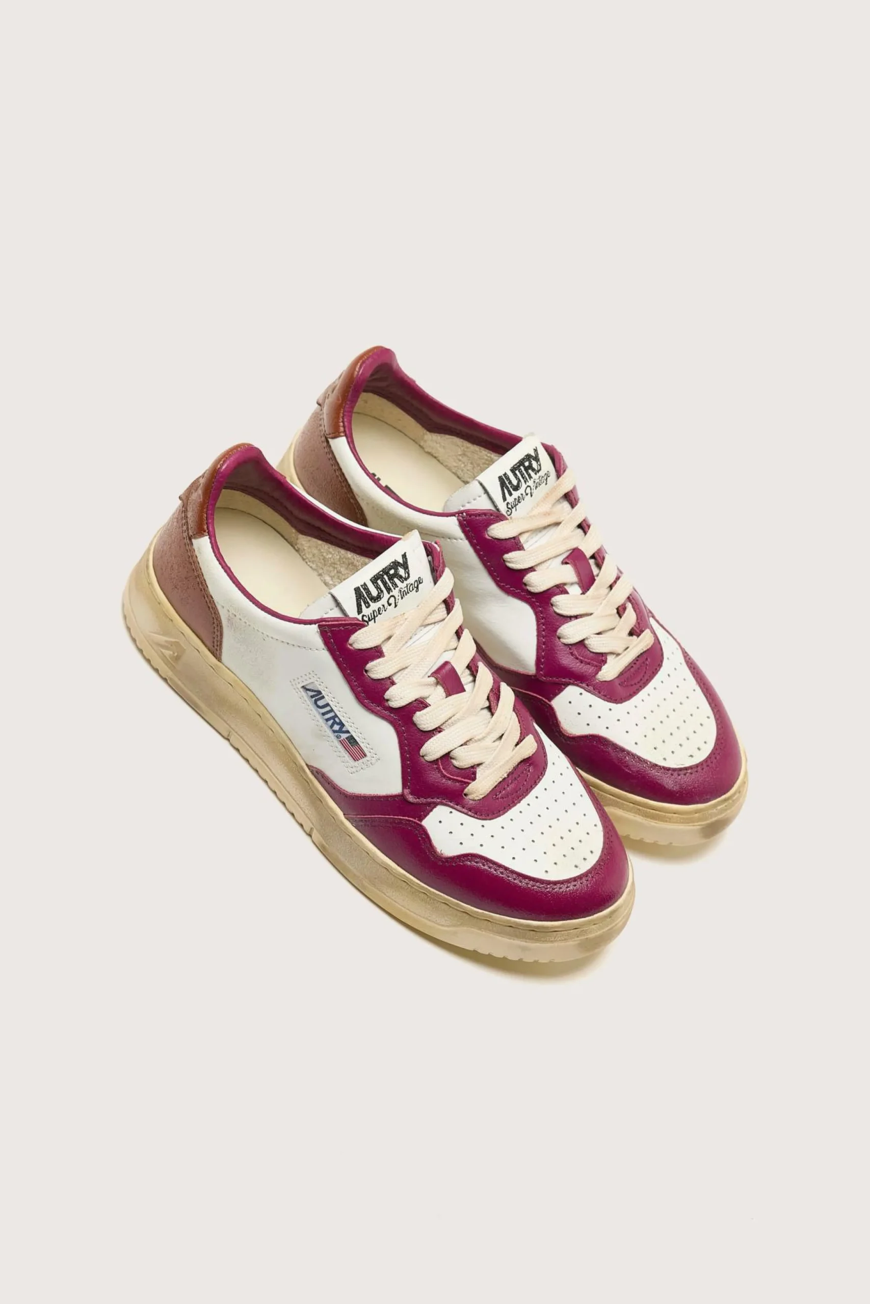 Les sneakers Autry Medalist Low Super Vintage présentent une tige en cuir et en suède blanc, avec un traitement artisanal dans des tons violets et marrons.
