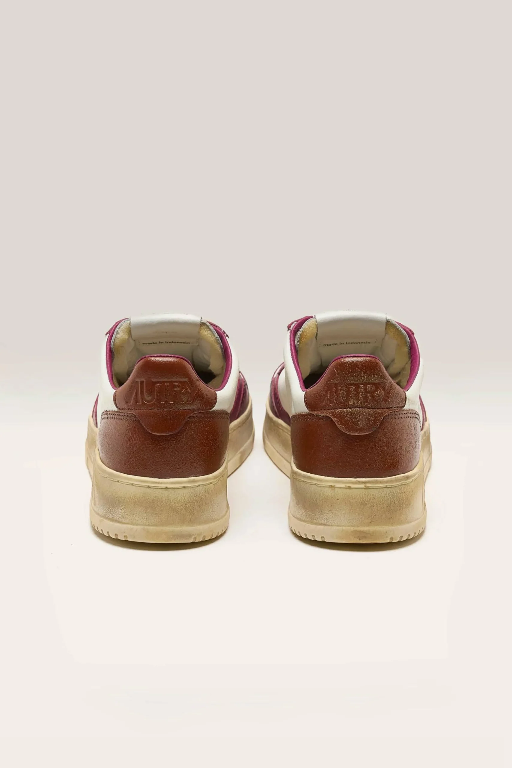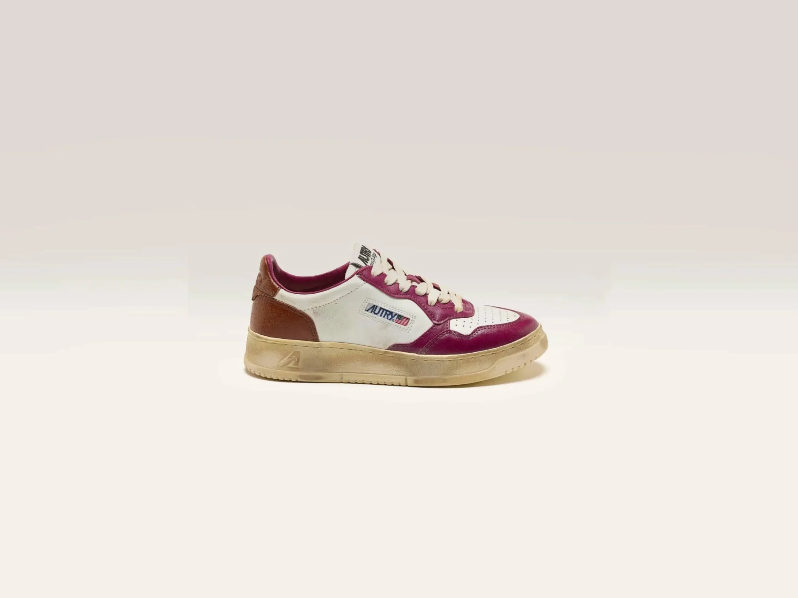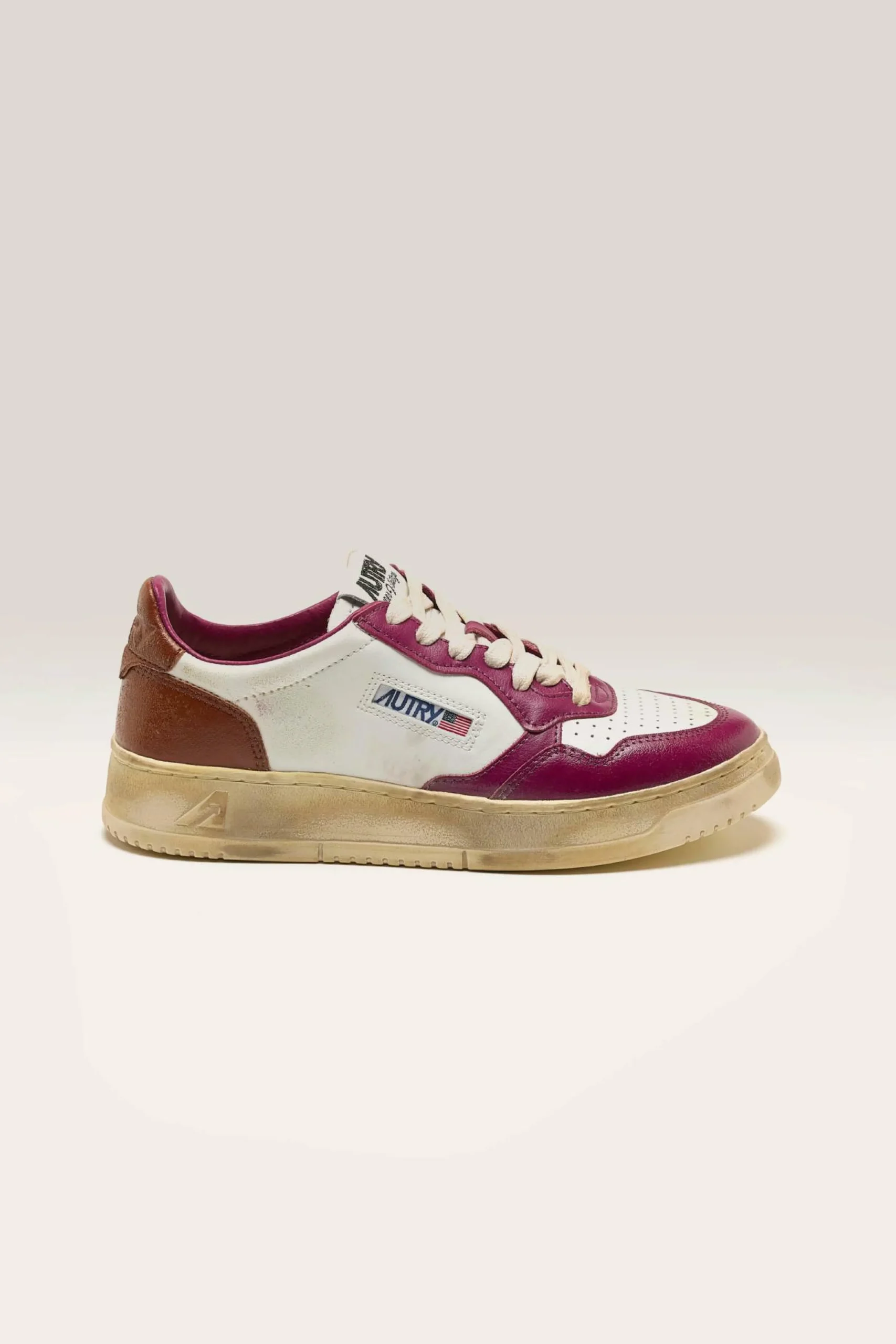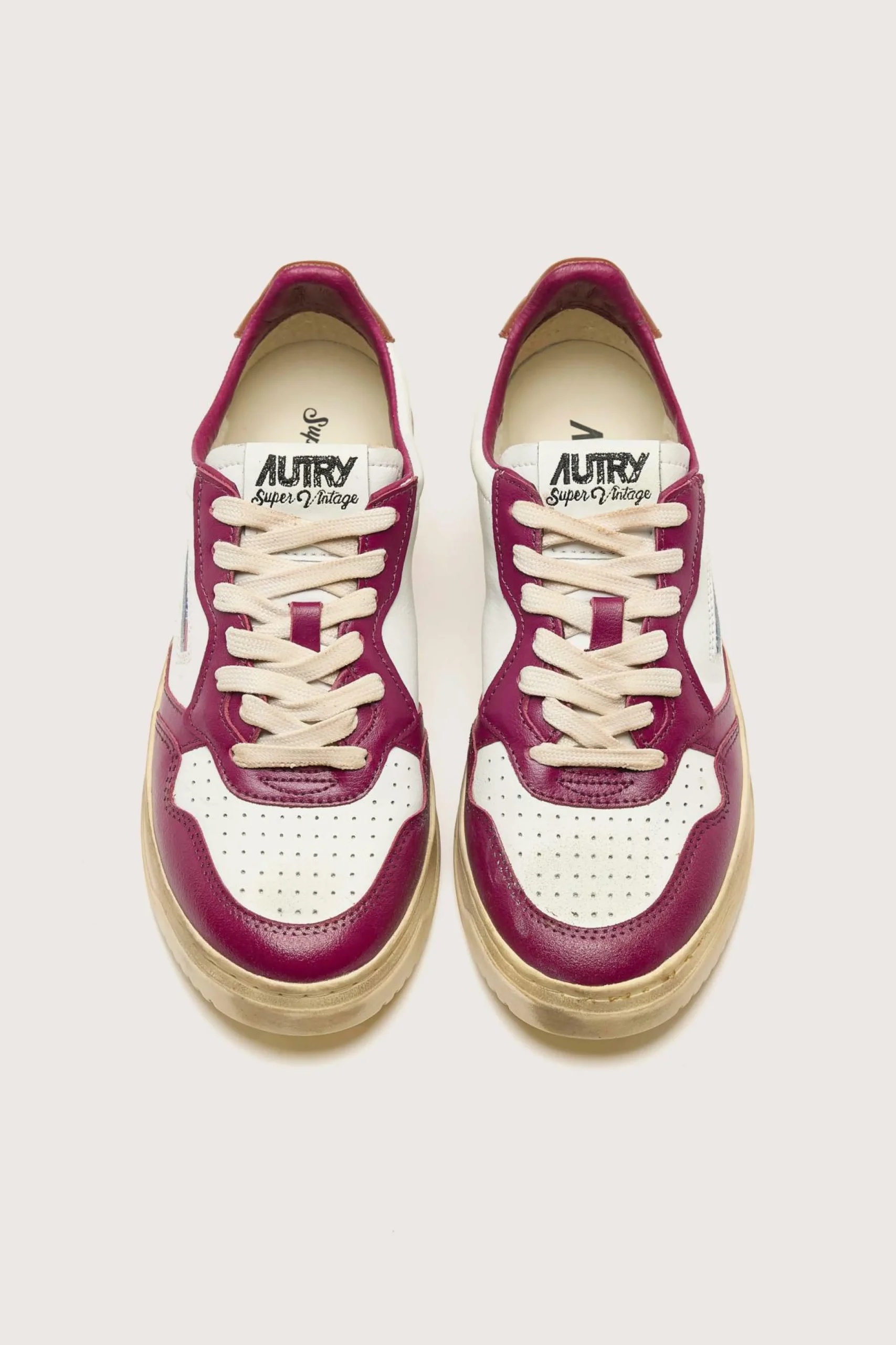 Les sneakers Autry Medalist Low Super Vintage présentent une tige en cuir et en suède blanc, avec un traitement artisanal dans des tons violets et marrons.