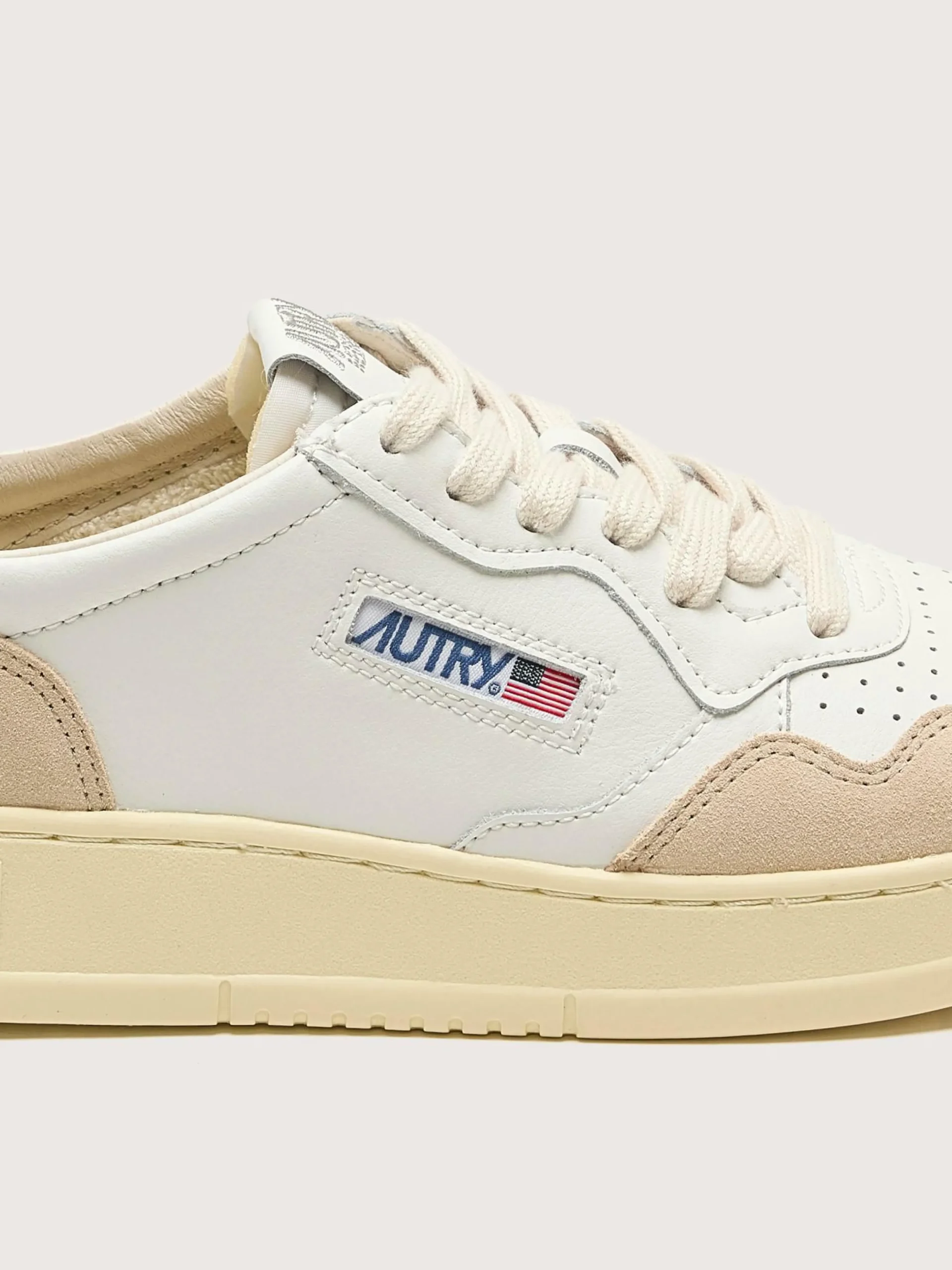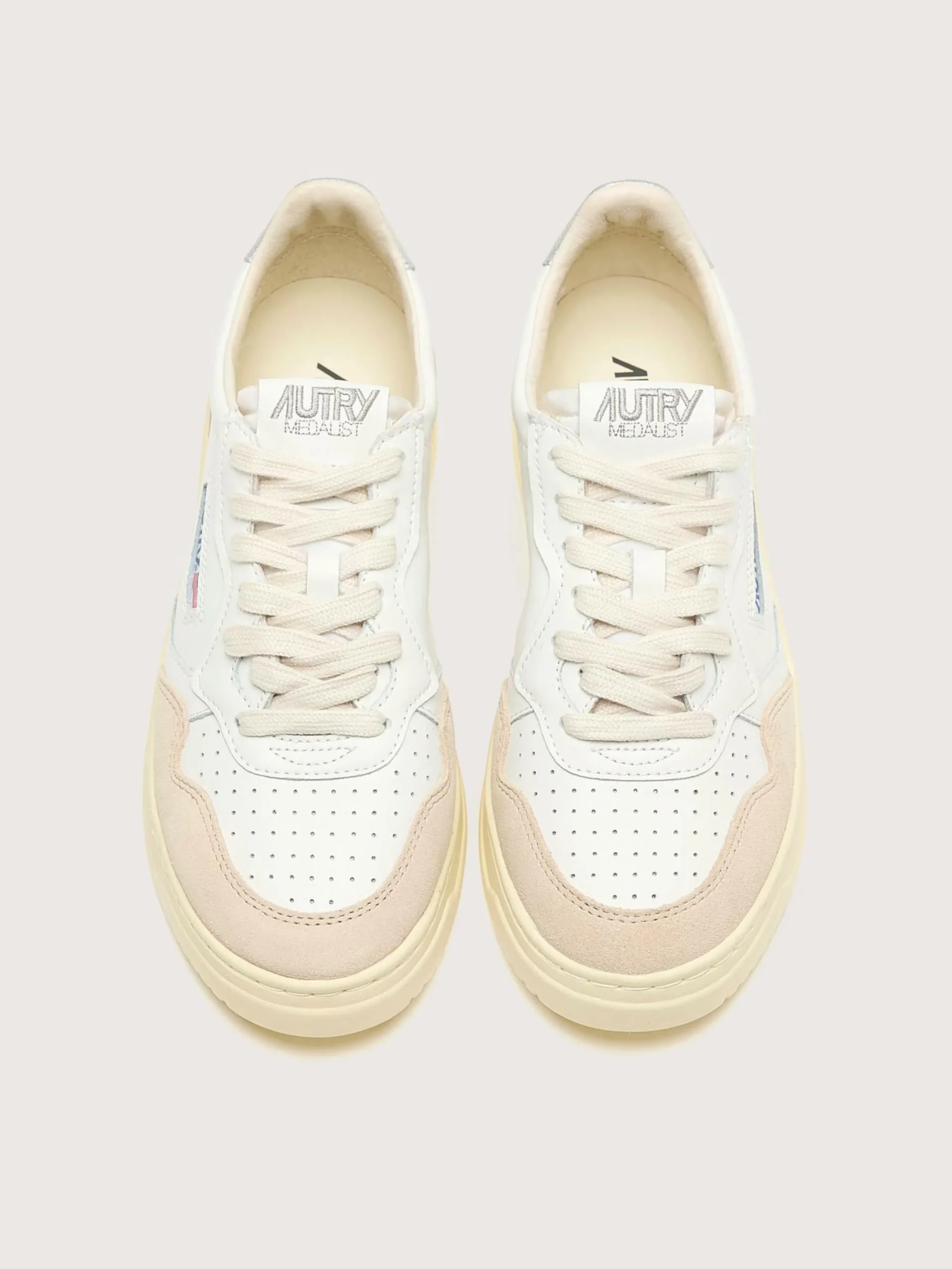 Les sneakers Autry Medalist Low présentent une tige en cuir blanc souple avec des empiècements en suède, un bout perforé et une languette de talon en cuir argenté.