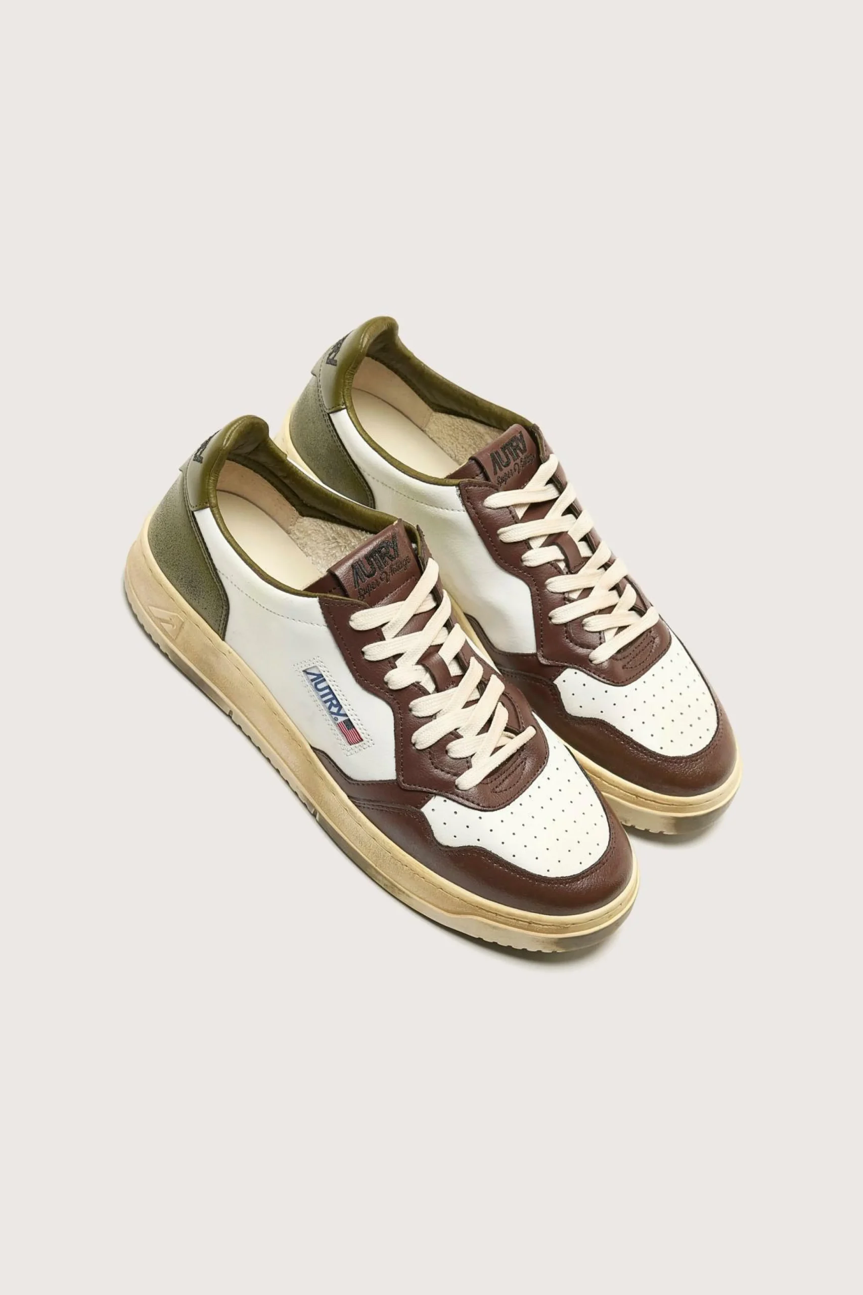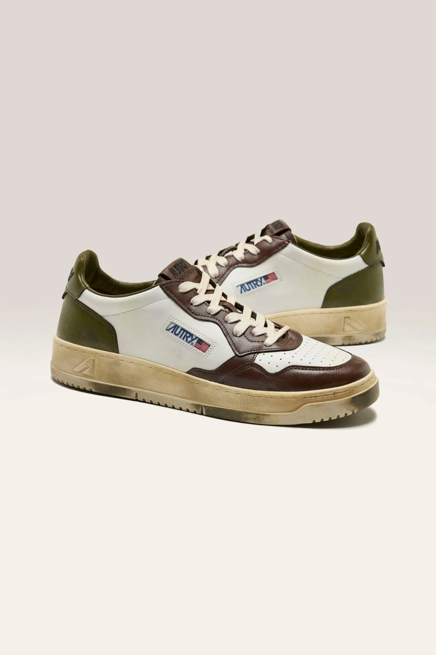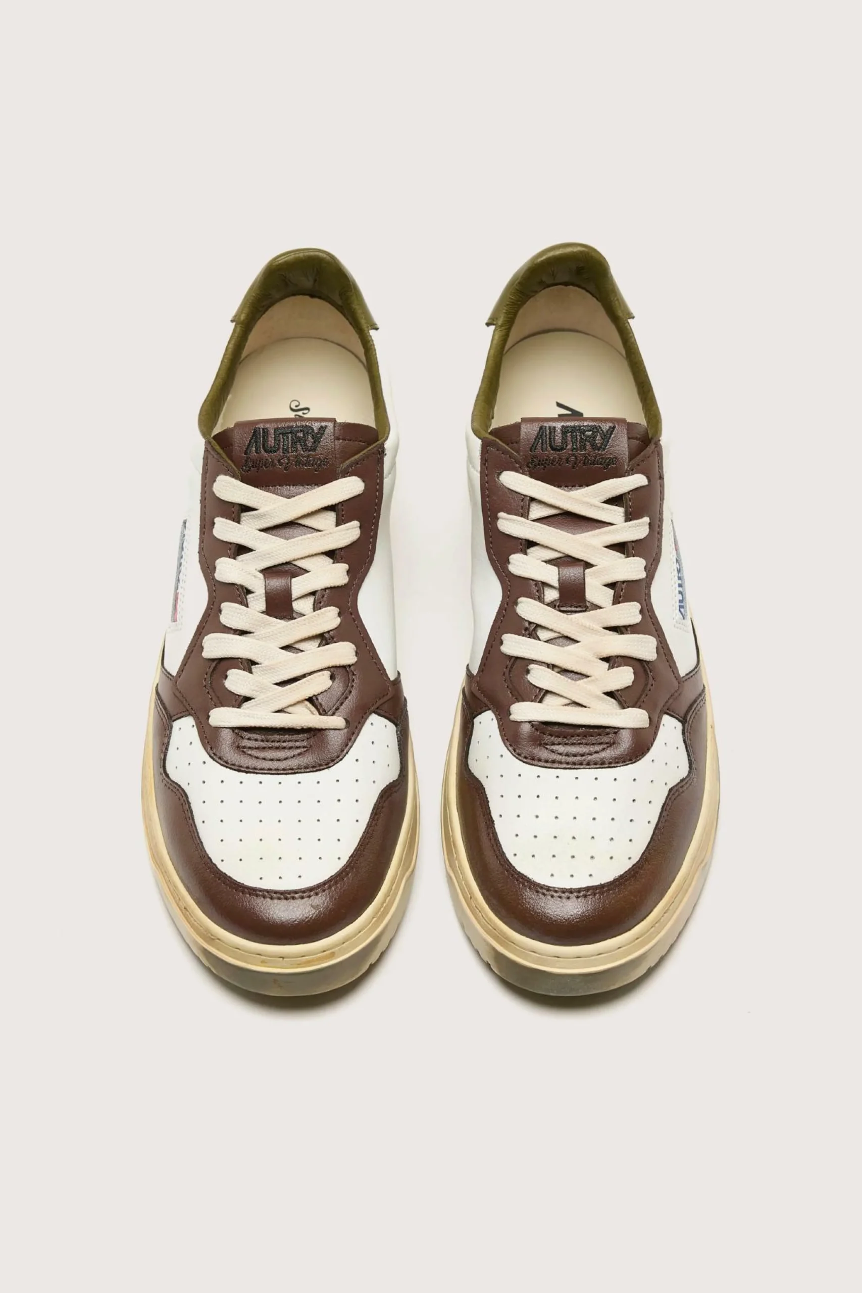 Les sneakers Autry Medalist Low Super Vintage présentent une tige en cuir avec un traitement artisanal dans les tons vert khaki et marron.