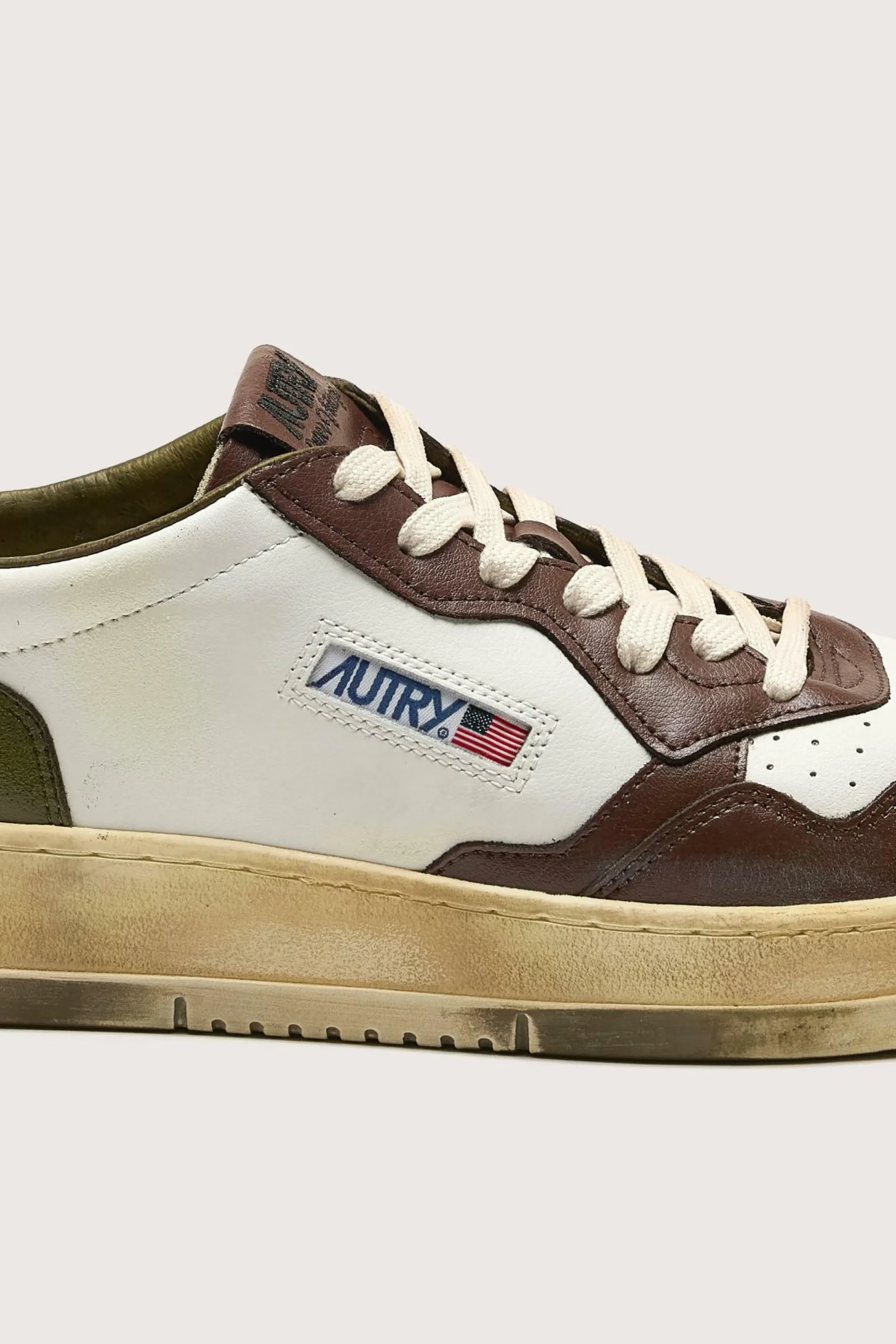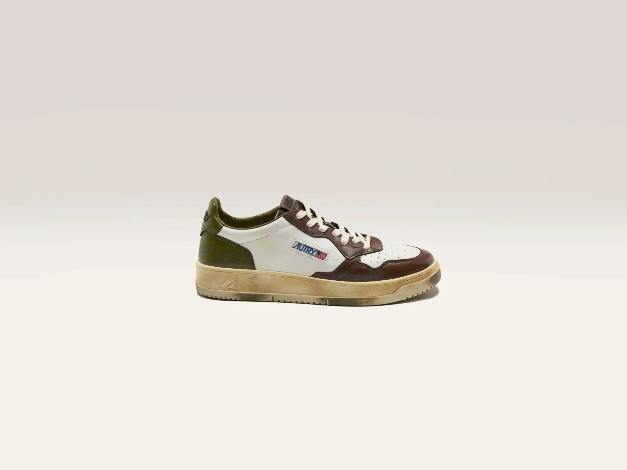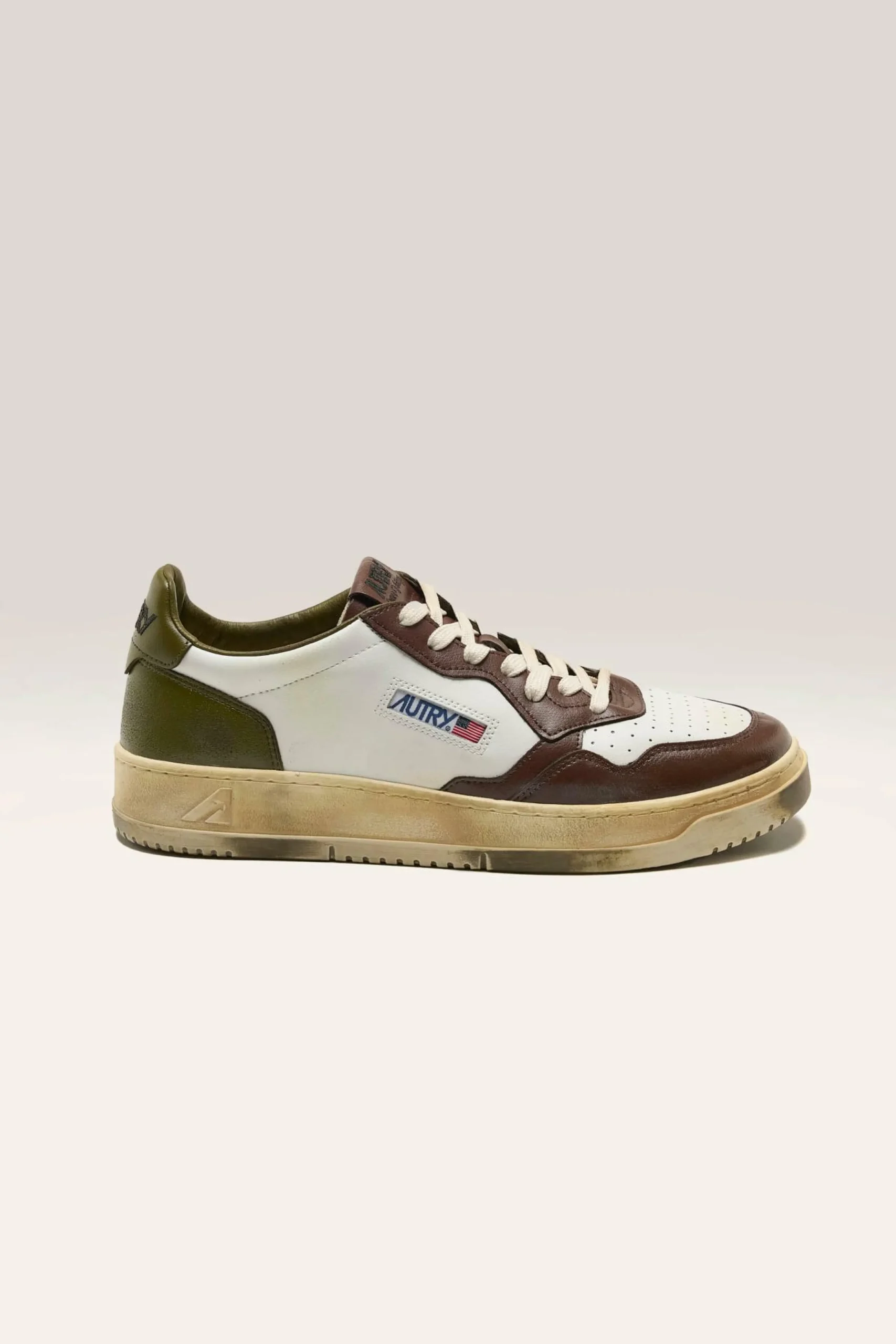 Les sneakers Autry Medalist Low Super Vintage présentent une tige en cuir avec un traitement artisanal dans les tons vert khaki et marron.