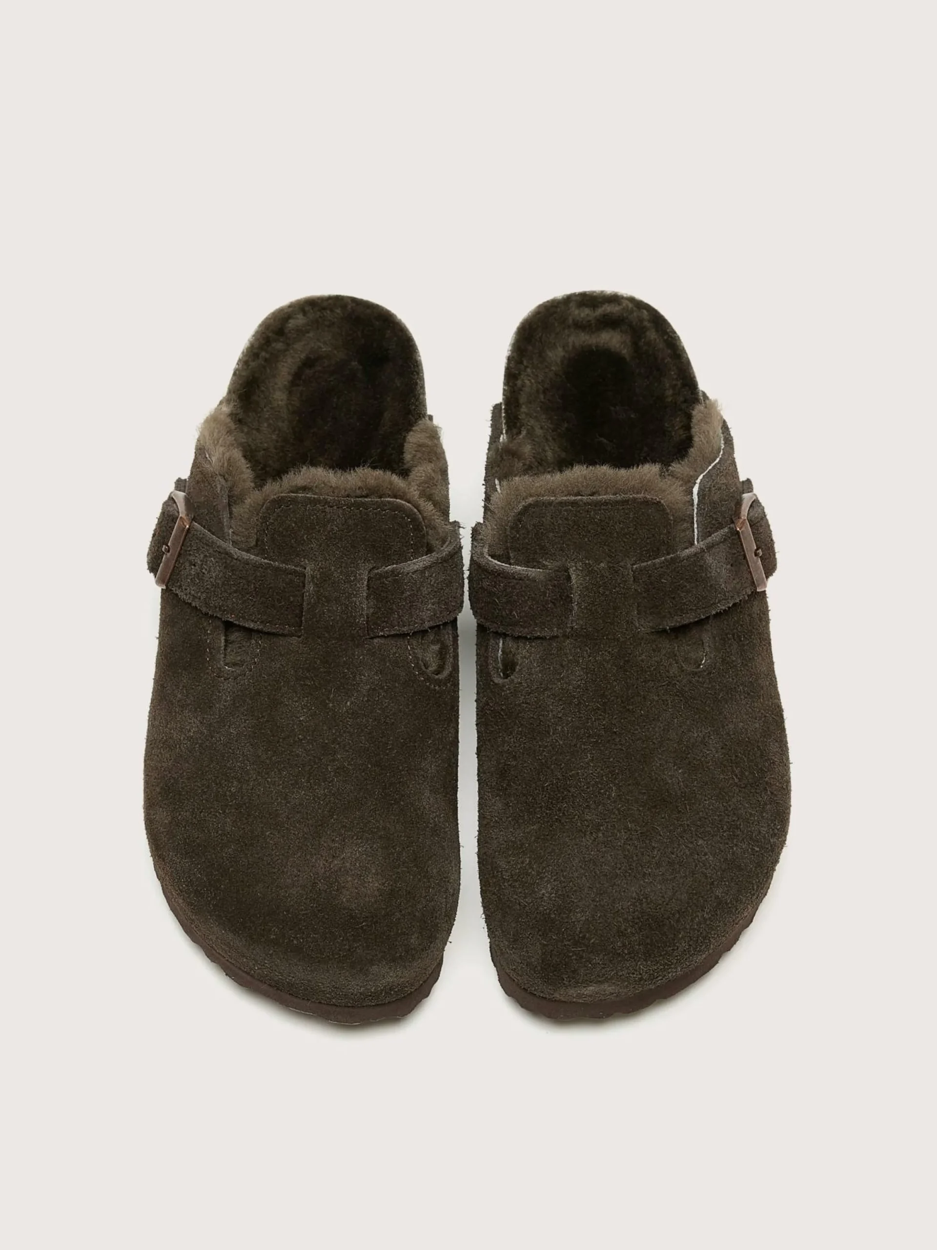 Les sabots fourrés Birkenstock Boston Shearling présentent un dessus en suède de qualité supérieure doublée de fourrure et une semelle doublée également de fourrure.