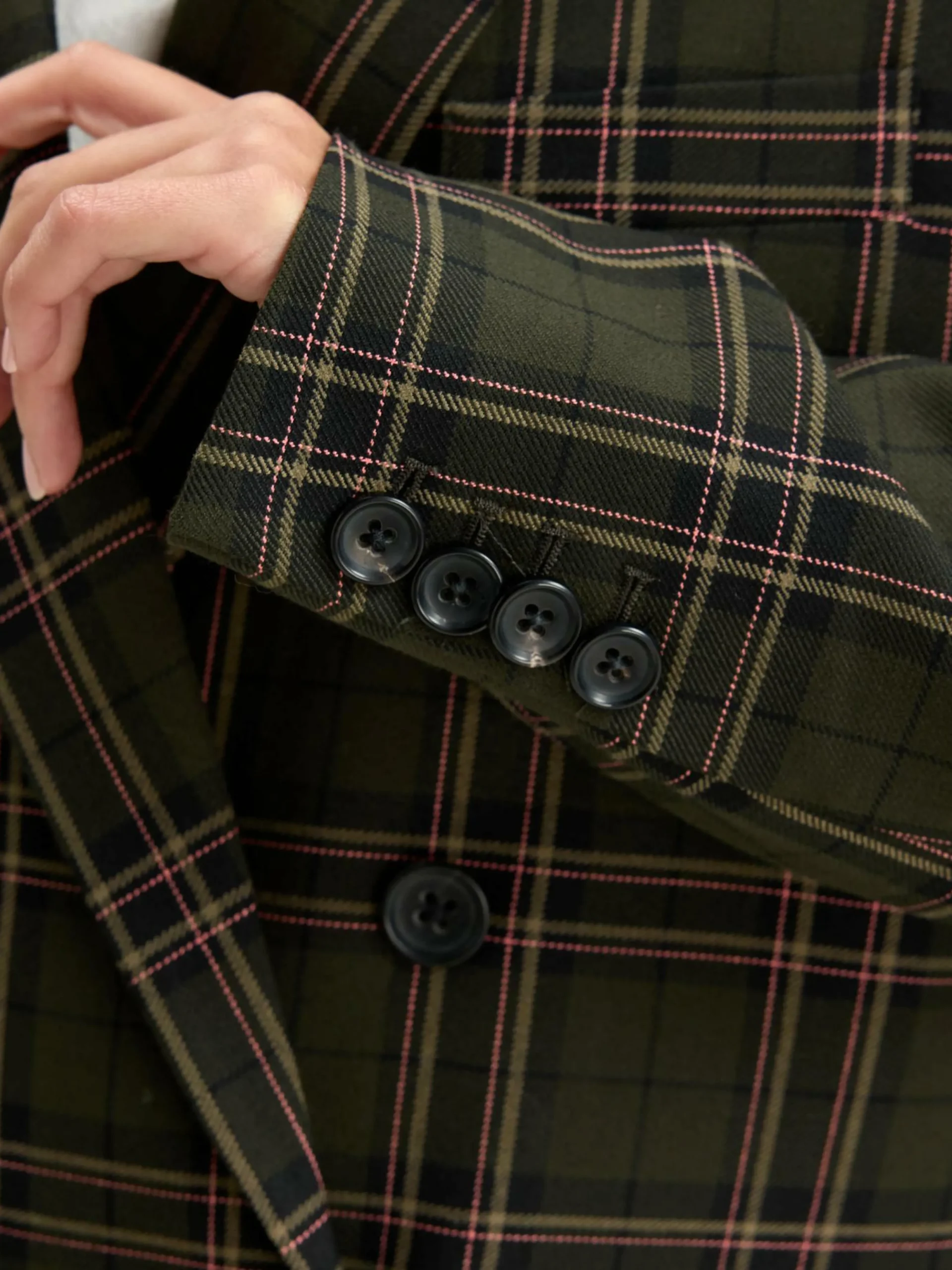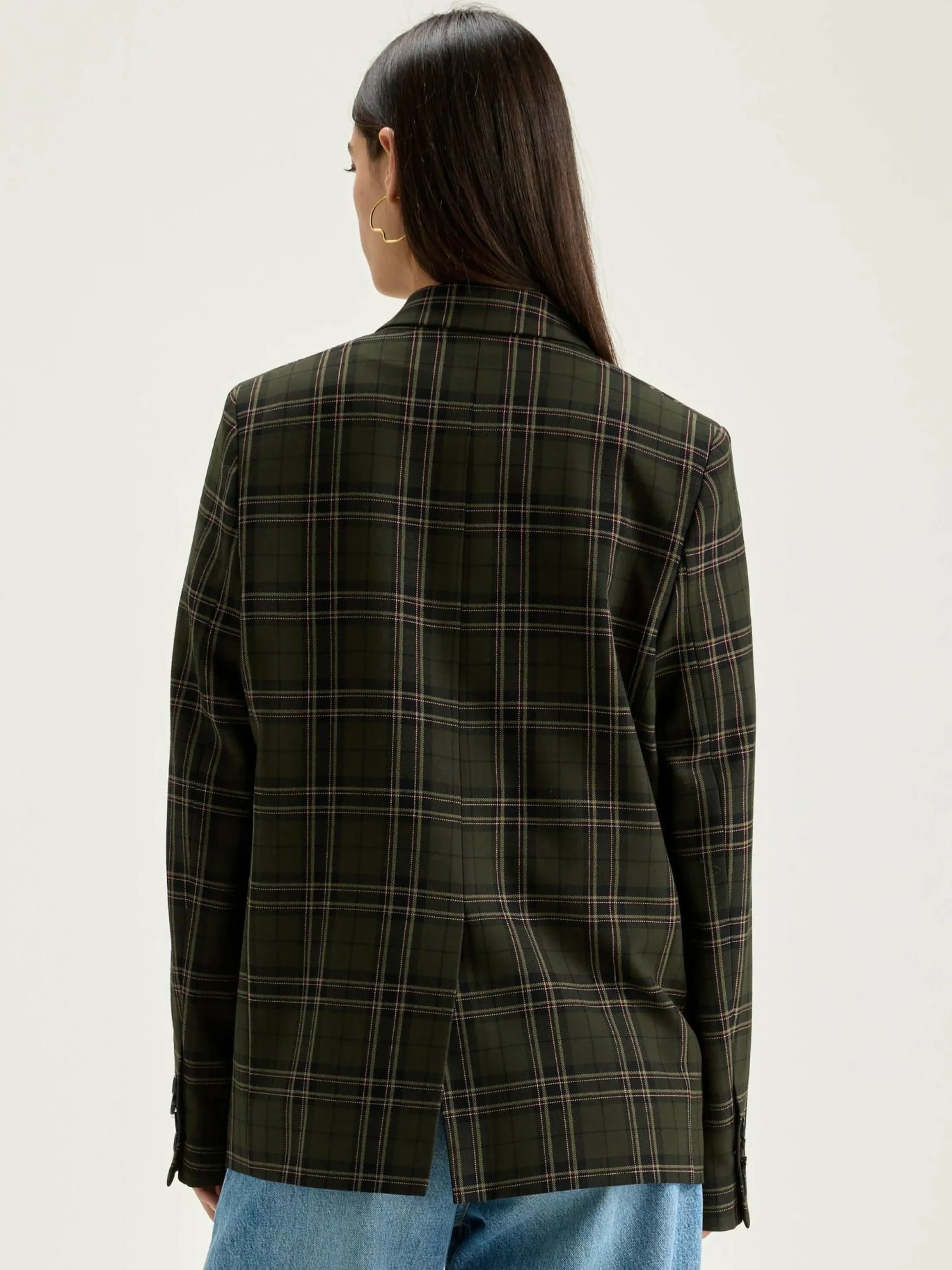 Blazer croisé à carreaux, de couleur kaki, coupe droite et oversize.