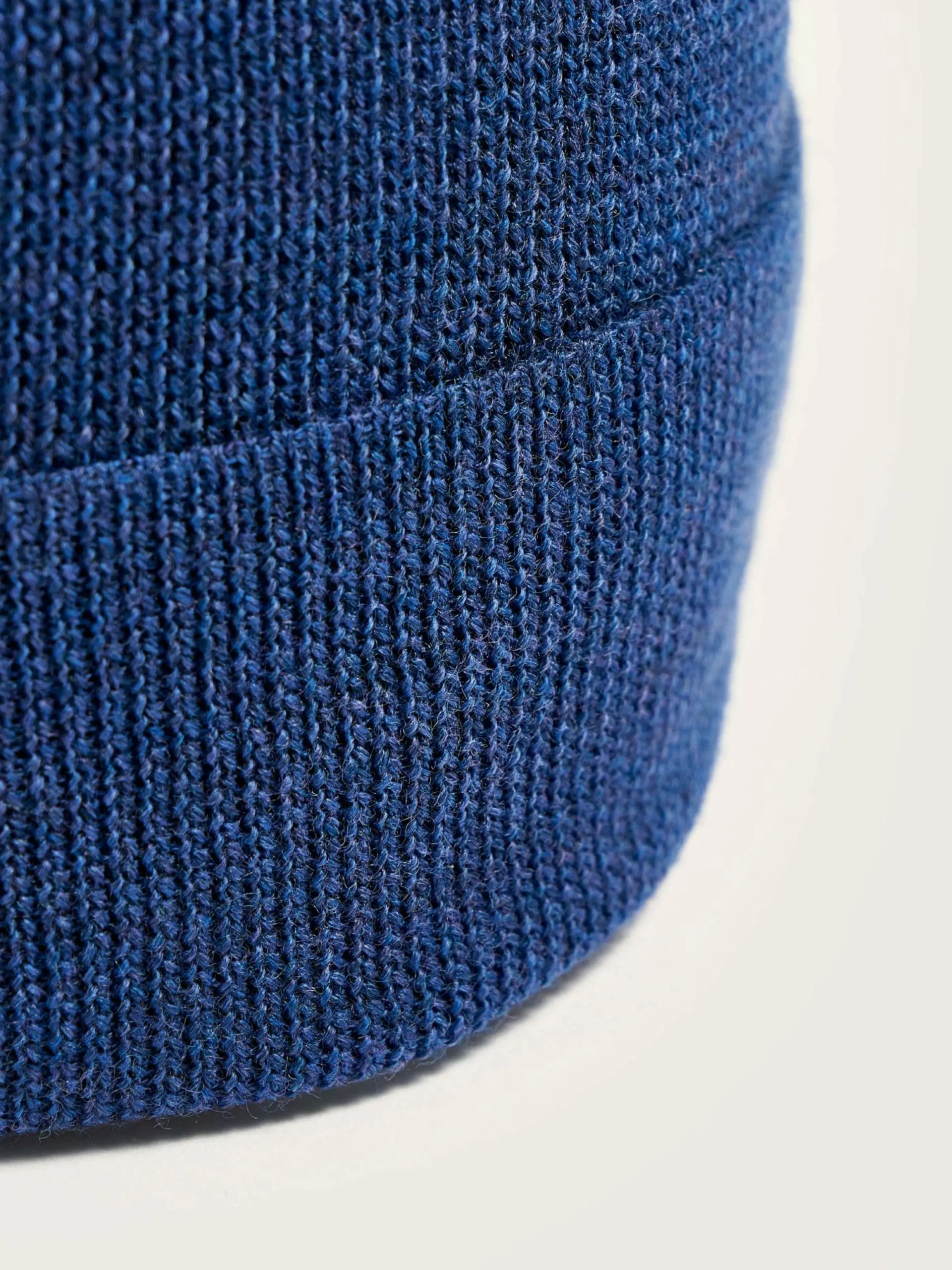 Bonnet côtelé classique en laine mérinos superfine bleu mélangé.