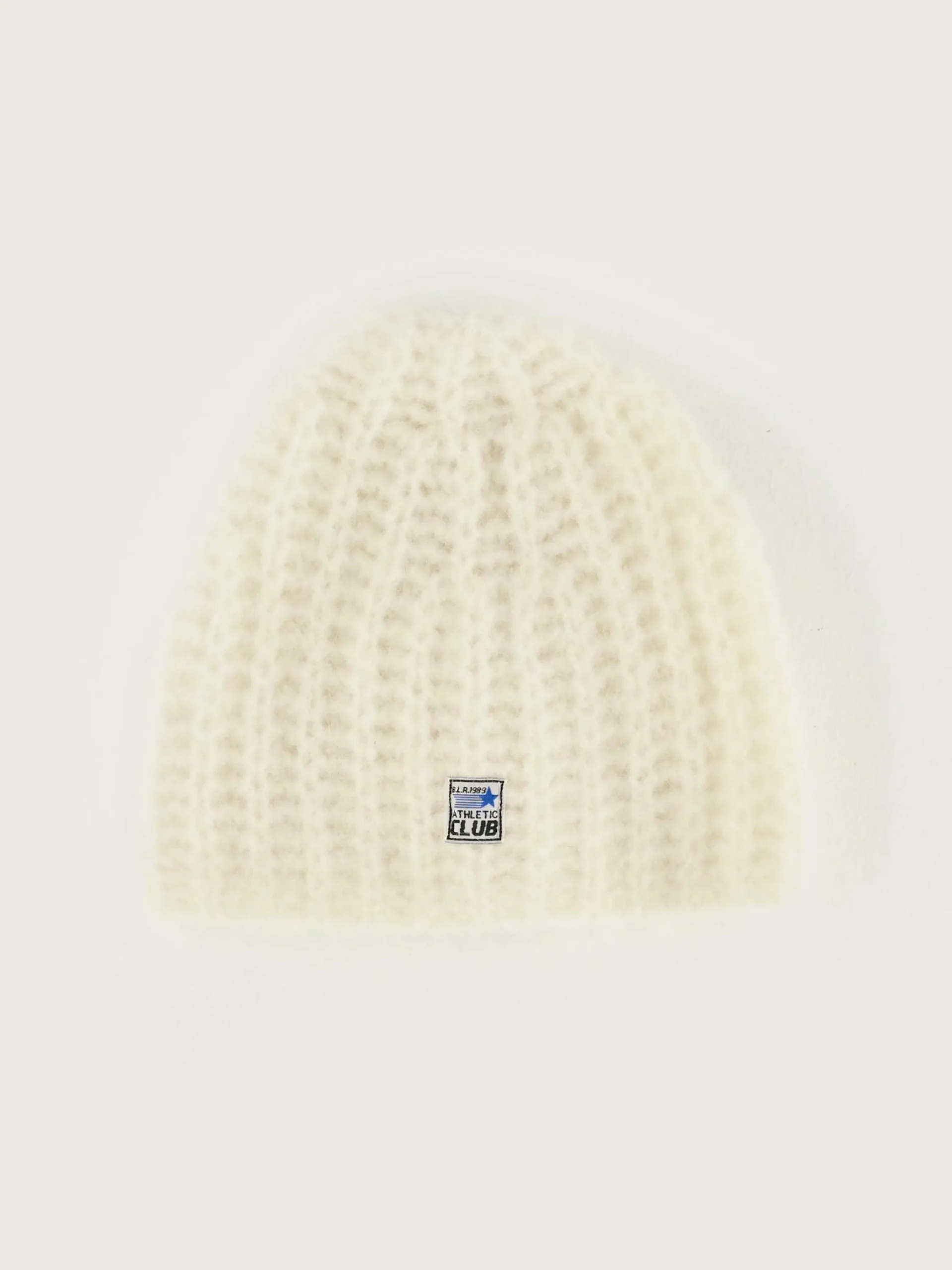Bonnet en tricot écru avec étiquette « BLR Athletic Club ».