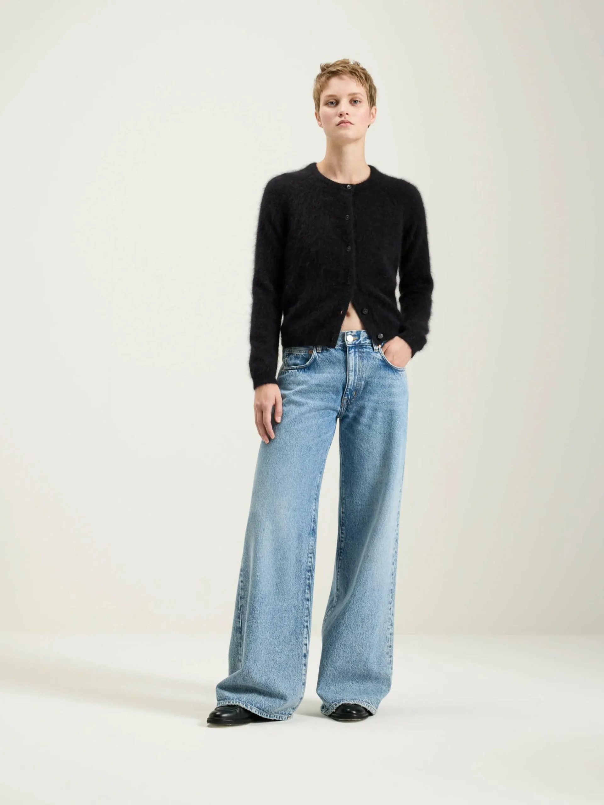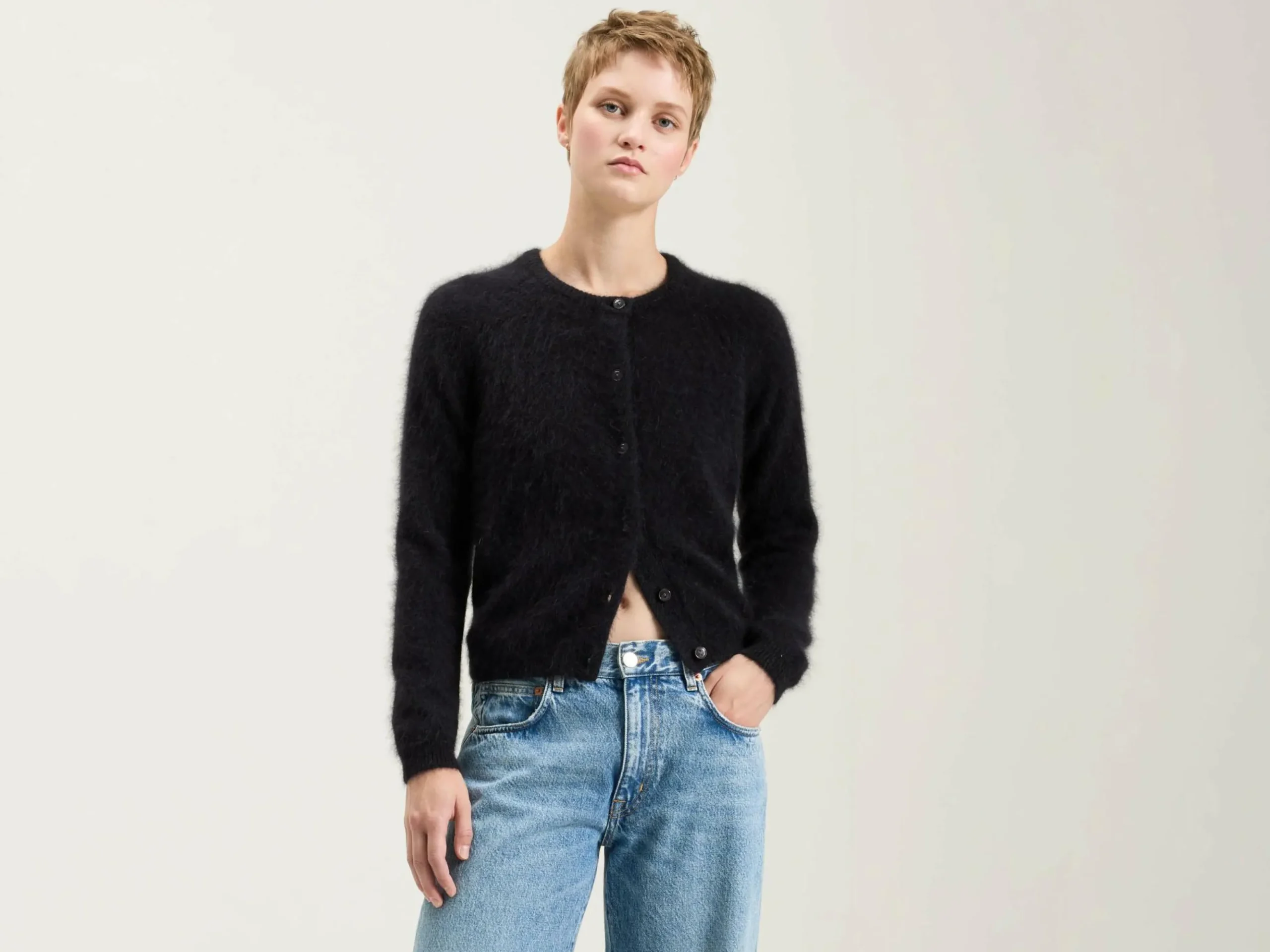 Cardigan classique noir à col rond et manches raglan en mélange d’angora.