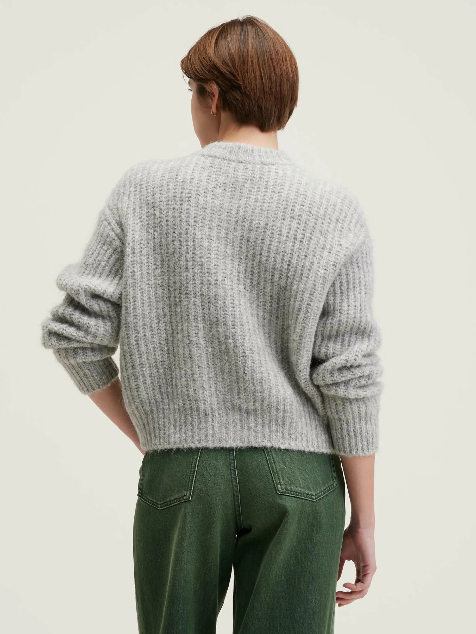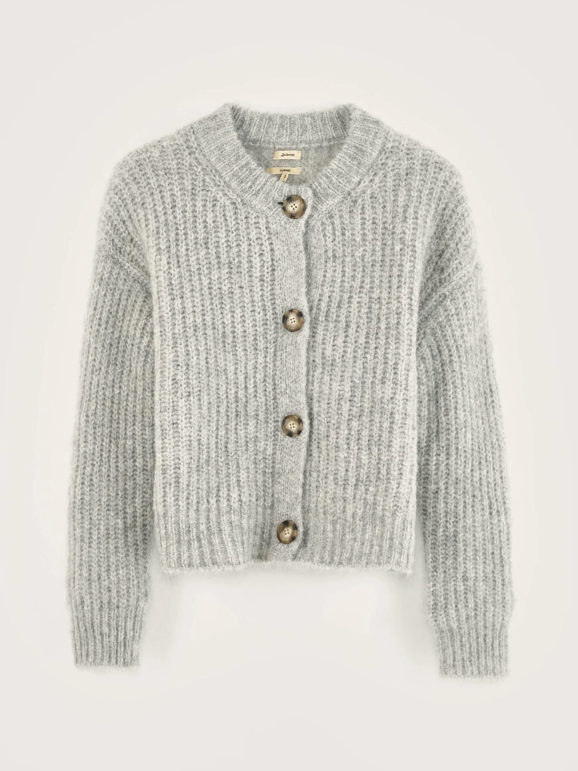 Cardigan classique en maille côtelée gris clair avec des boutons en corozo.