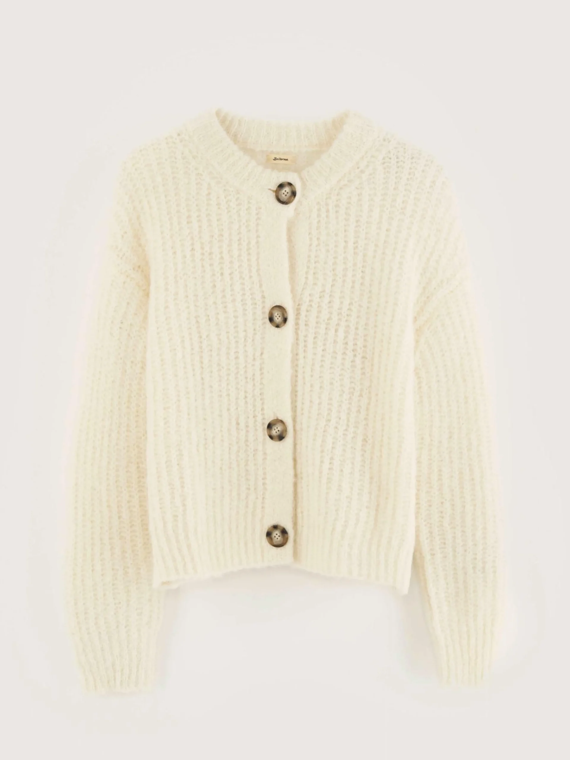 Cardigan classique en maille côtelée coloris whisper et bouton en corozo.