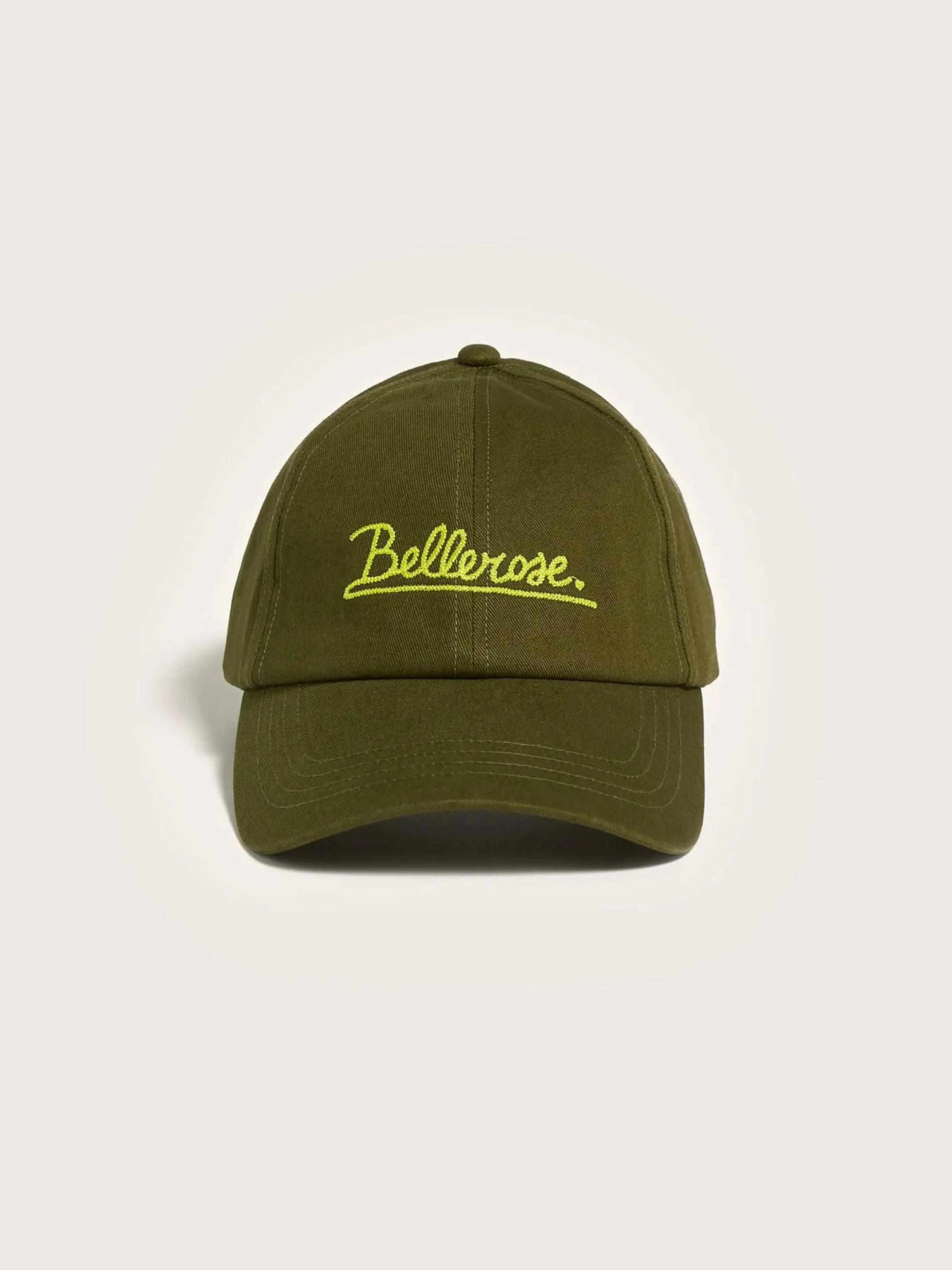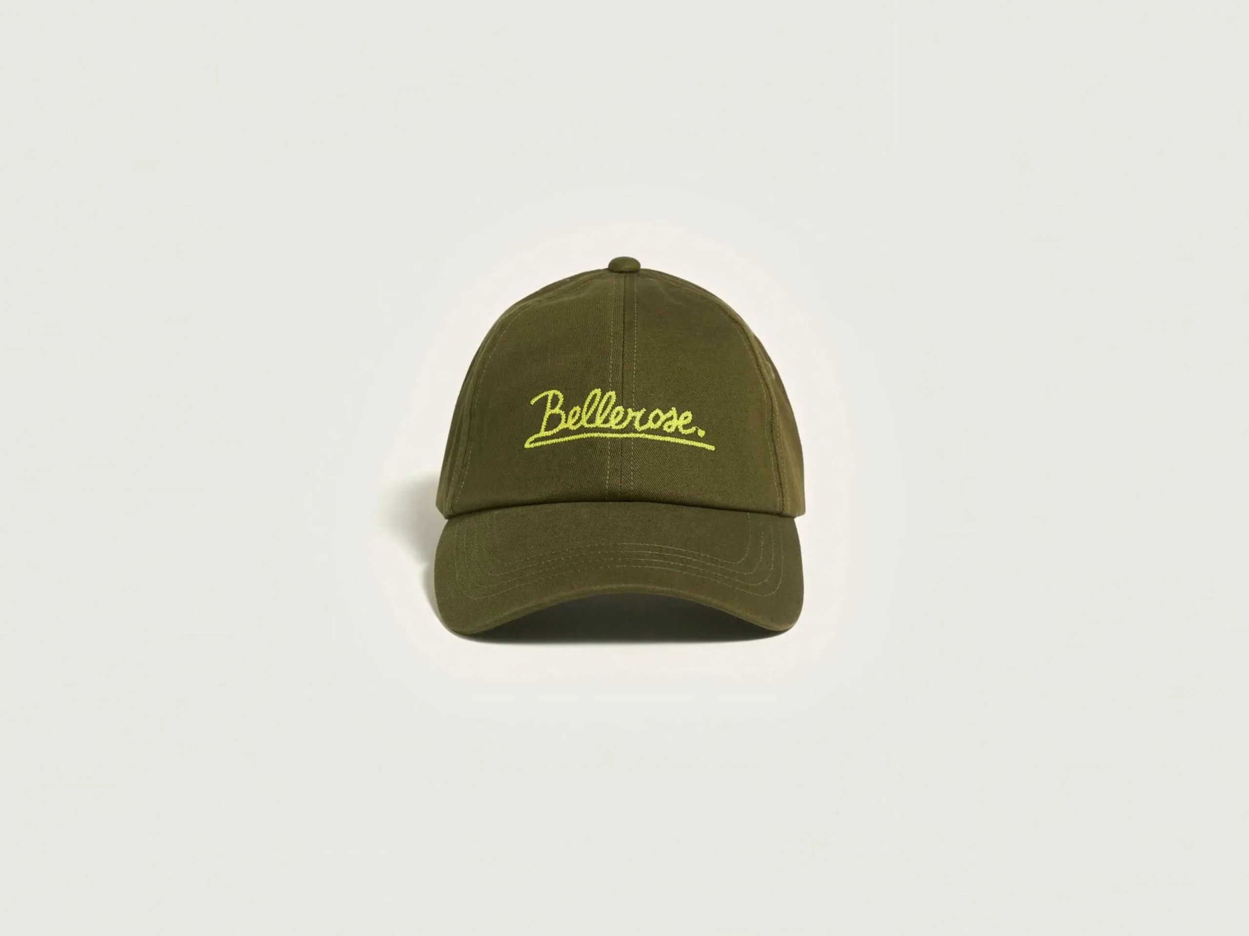 Casquette classique à 6 panneaux en coton kaki avec broderie Bellerose jaune à l’avant.