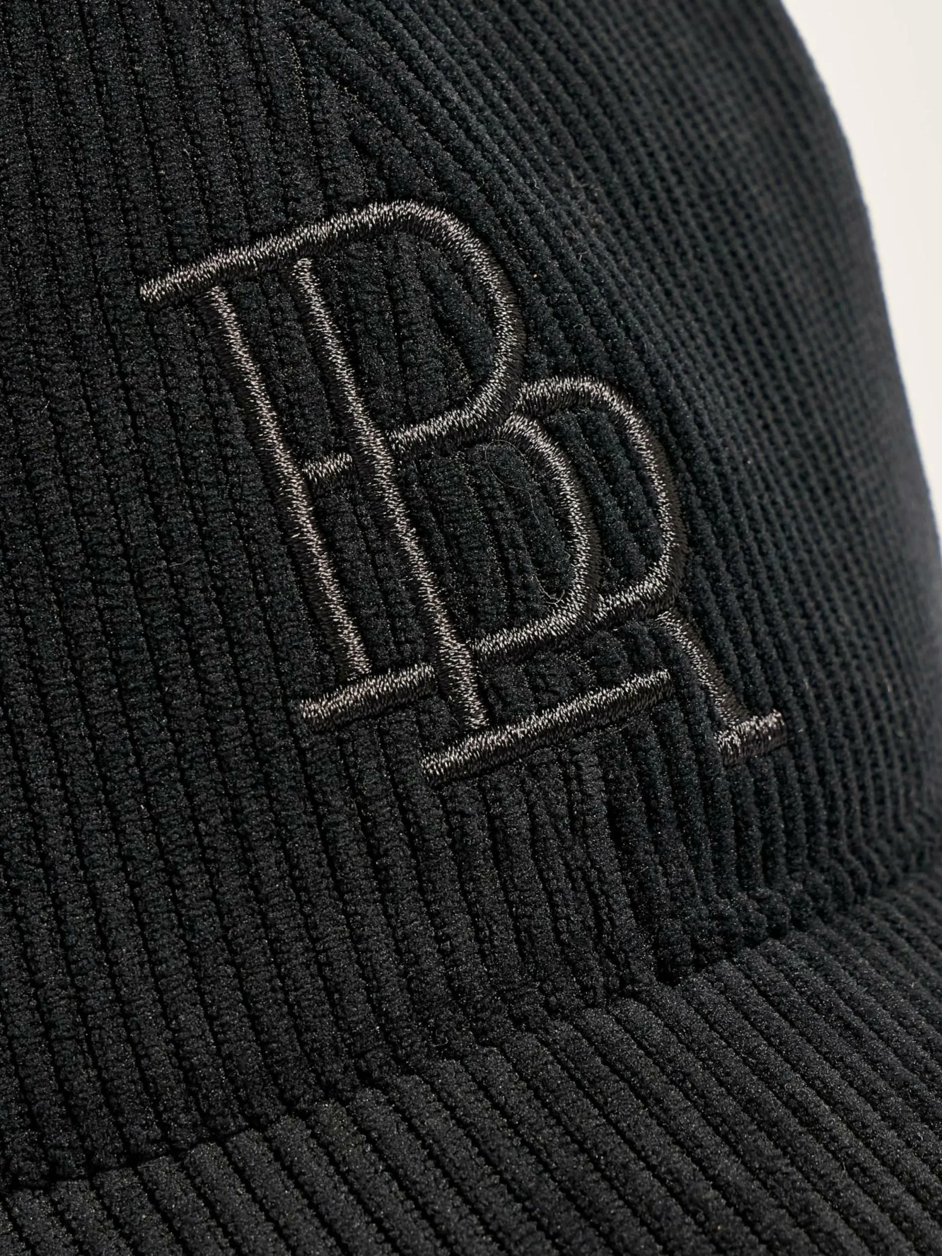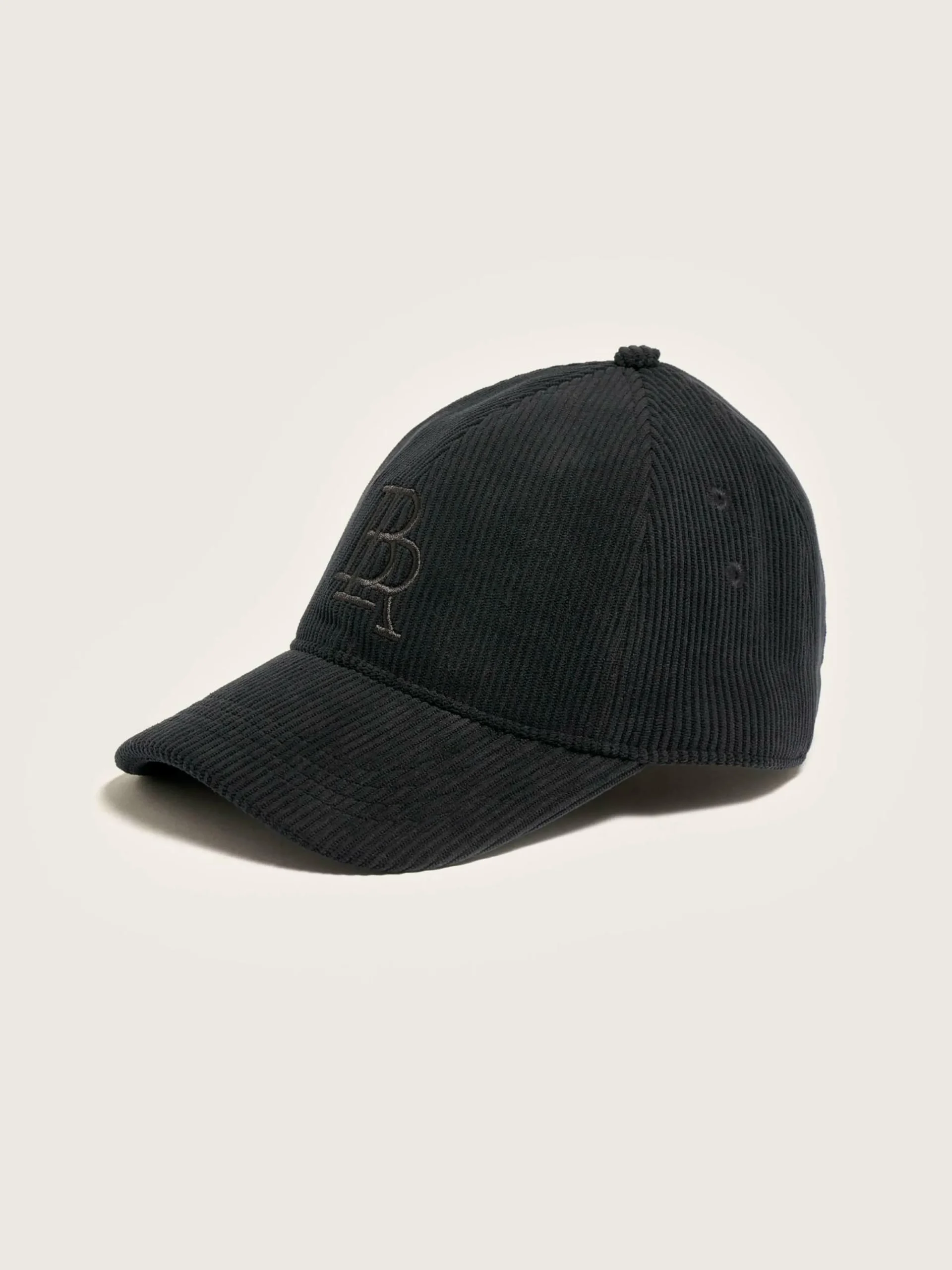 Casquette en velours côtelé noir avec broderie BLR sur le devant.