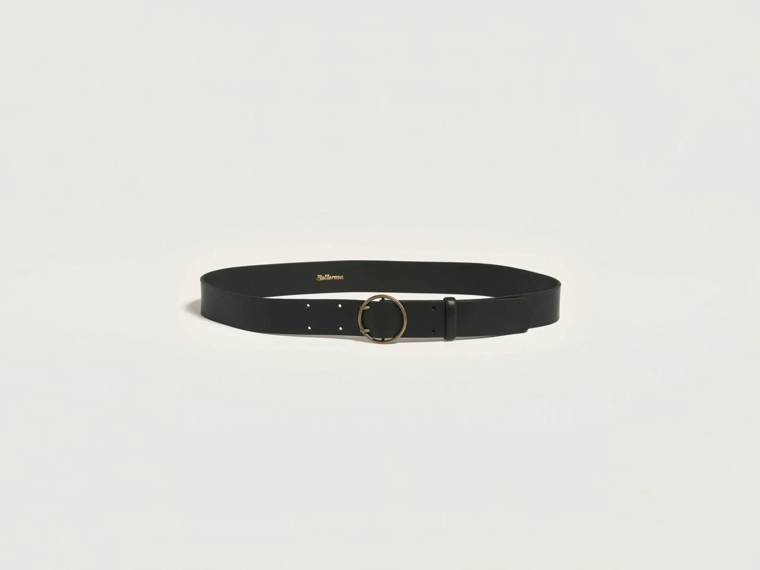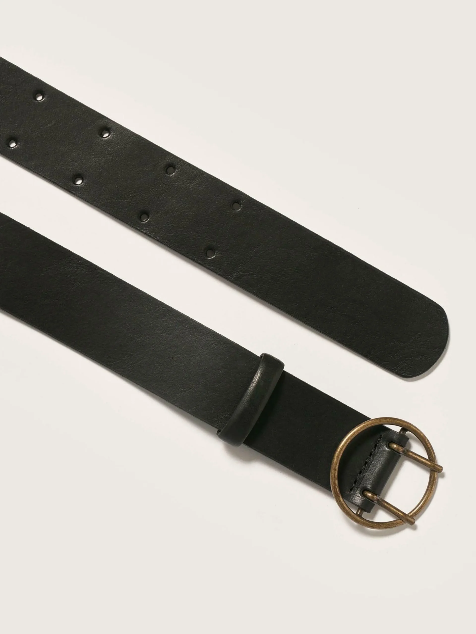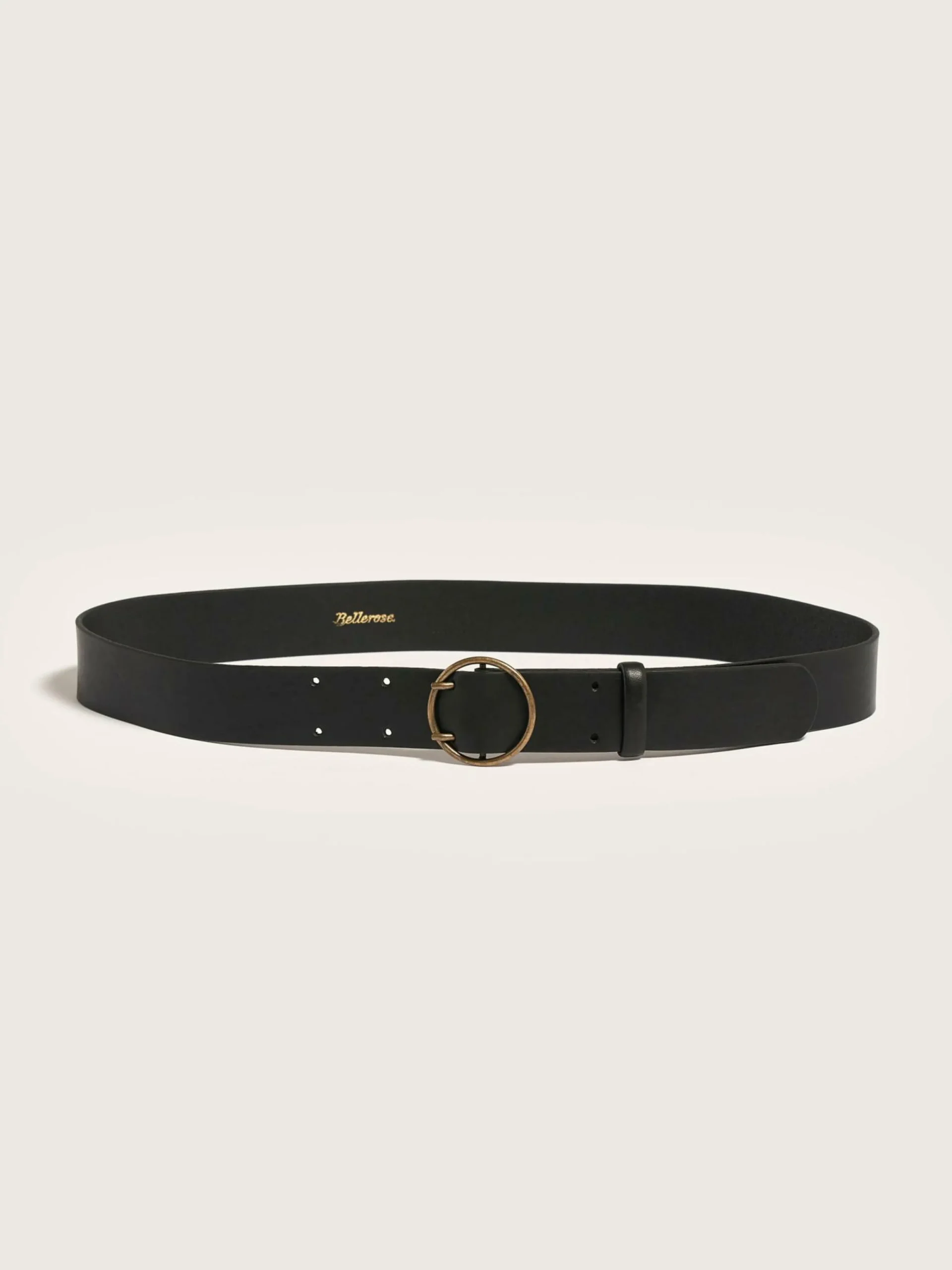 Ceinture classique en cuir lisse noir avec boucle circulaire en laiton vieilli.
