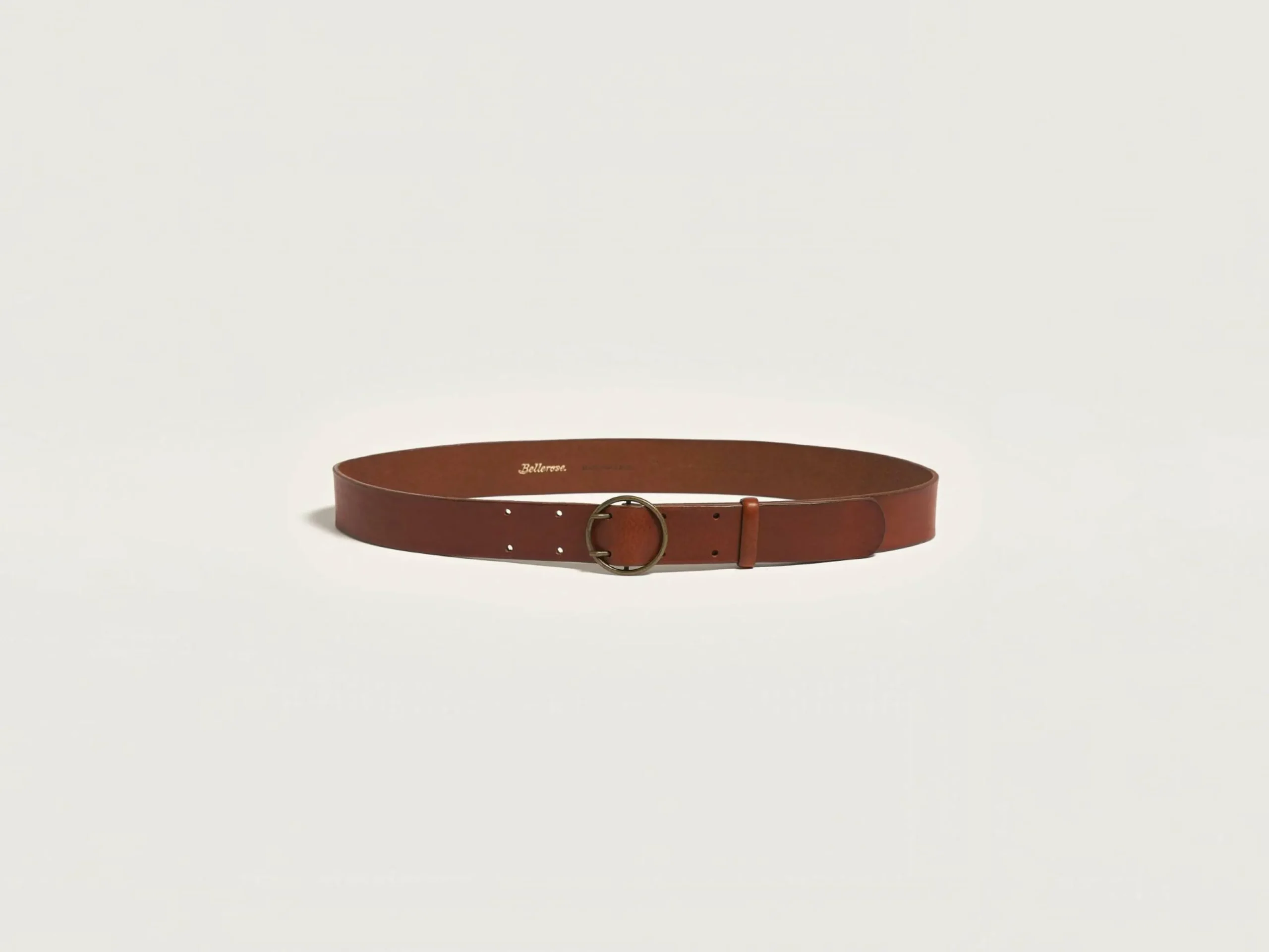 Ceinture classique en cuir lisse cognac avec boucle circulaire en laiton vieilli.