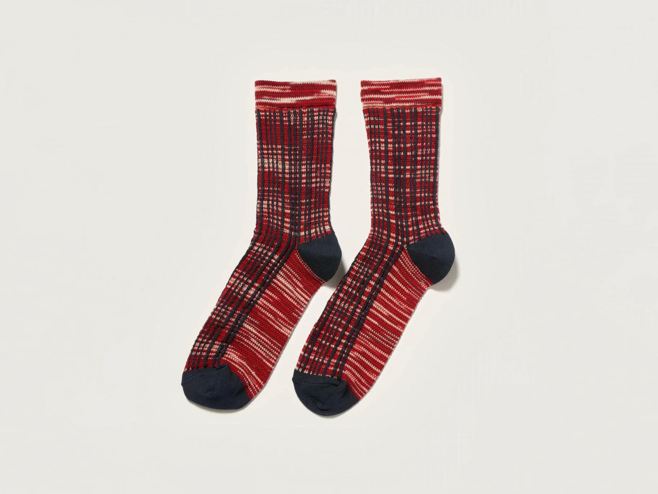 Chaussettes classiques avec des détails contrastés rouges et texturés bleu marine.