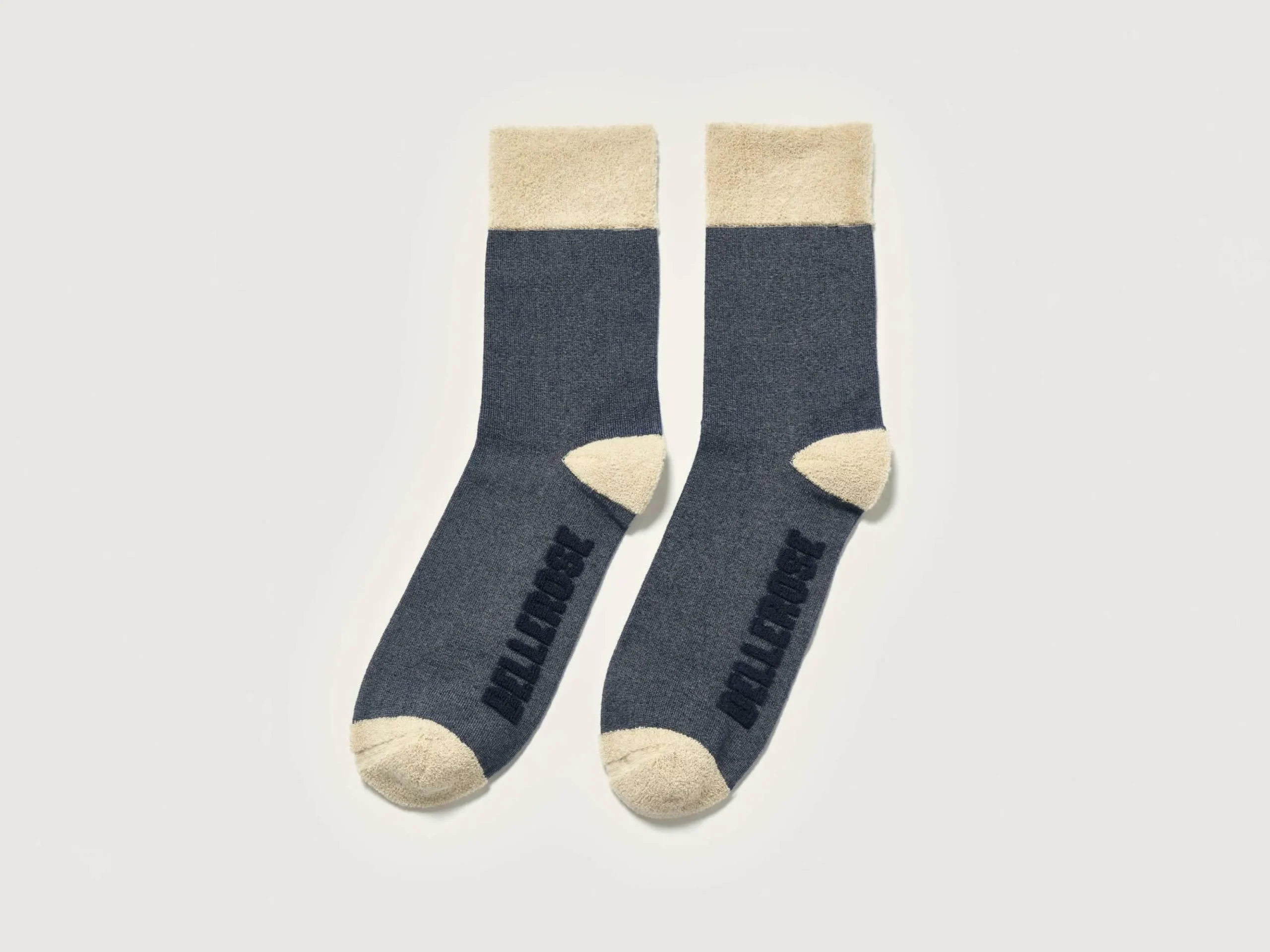 Chaussettes classiques bleues avec signature Bellerose en maille éponge sur la semelle.