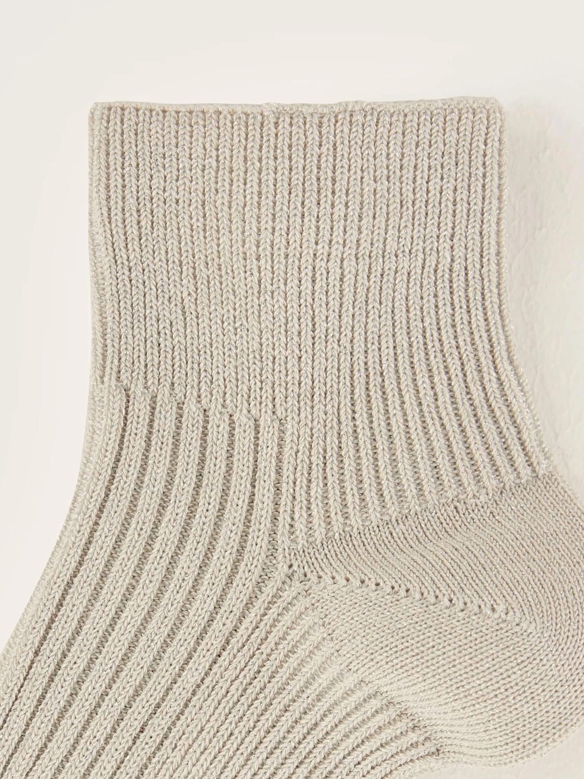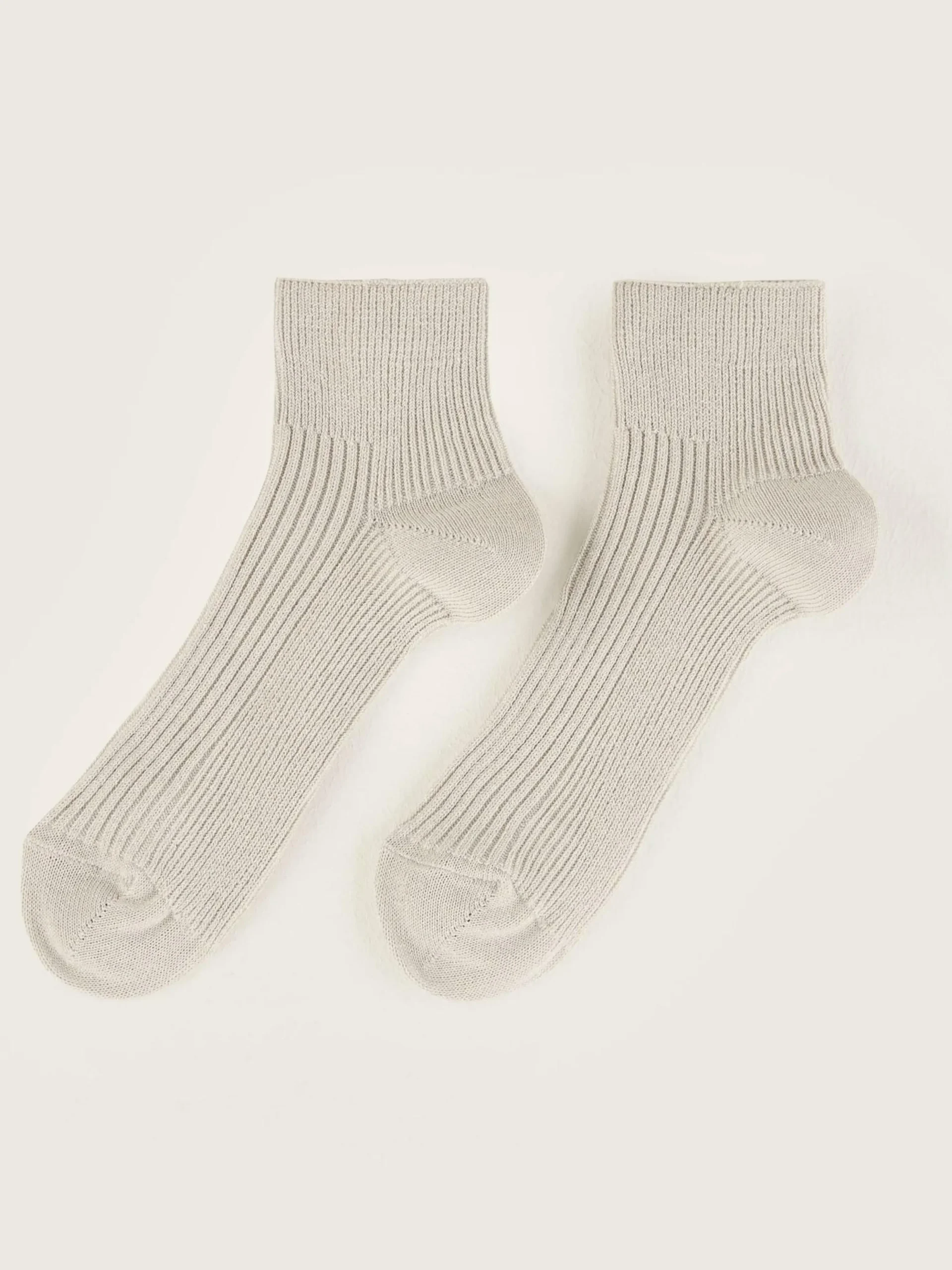 Chaussettes courtes en maille côtelée gris clair avec un fini lurex.