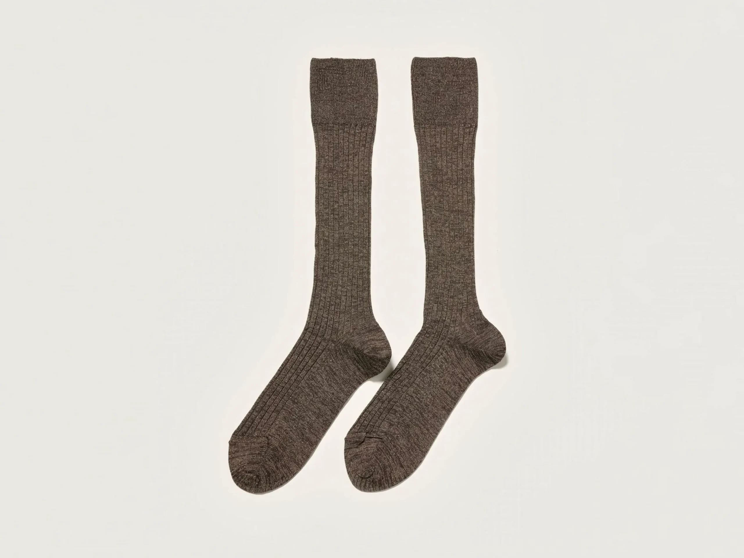 Chaussettes montantes en maille côtelée couleur marron et fil lurex.