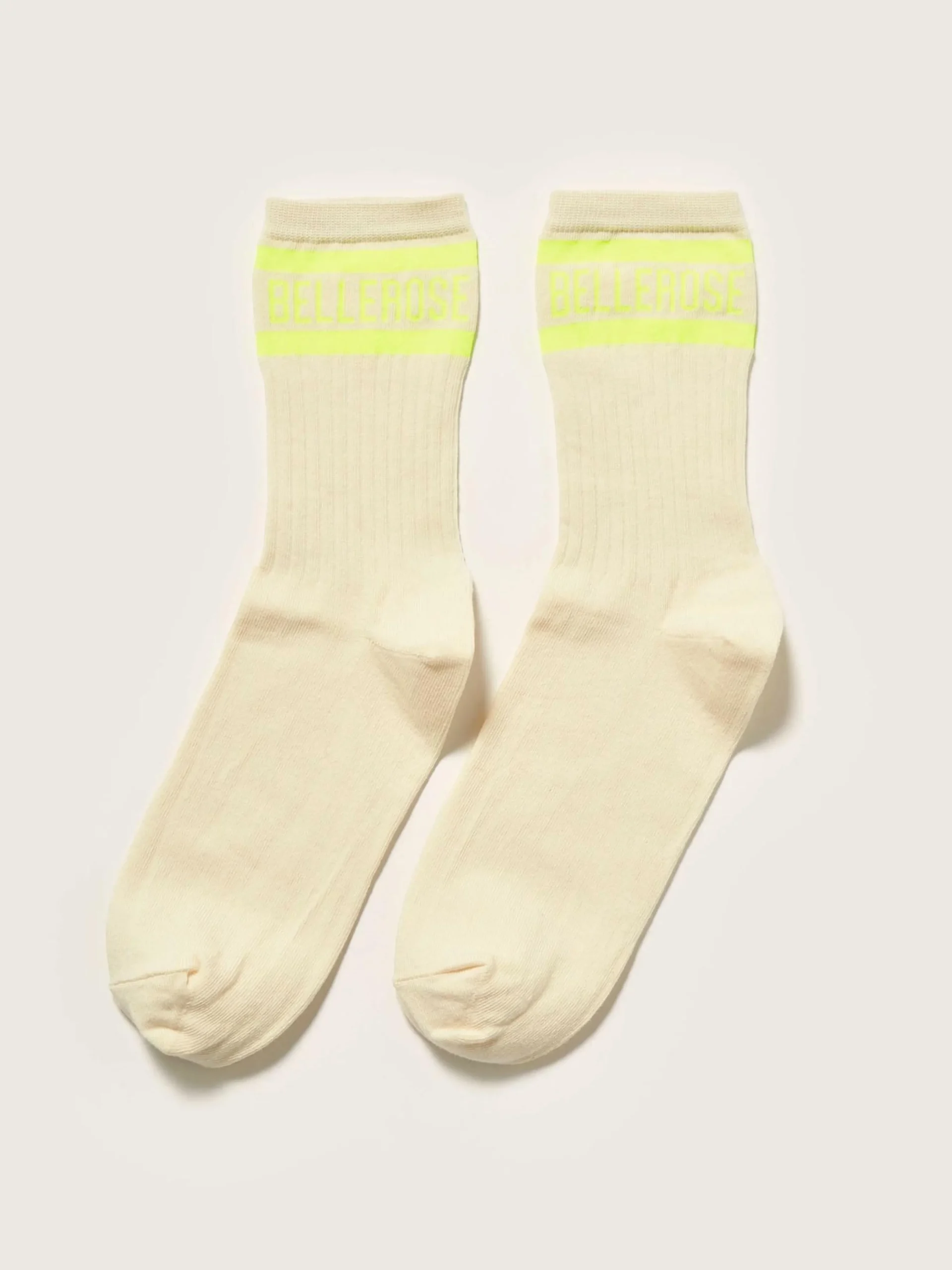 Chaussettes classiques blanc ivoire avec le logo Bellerose jaune sur la cheville.