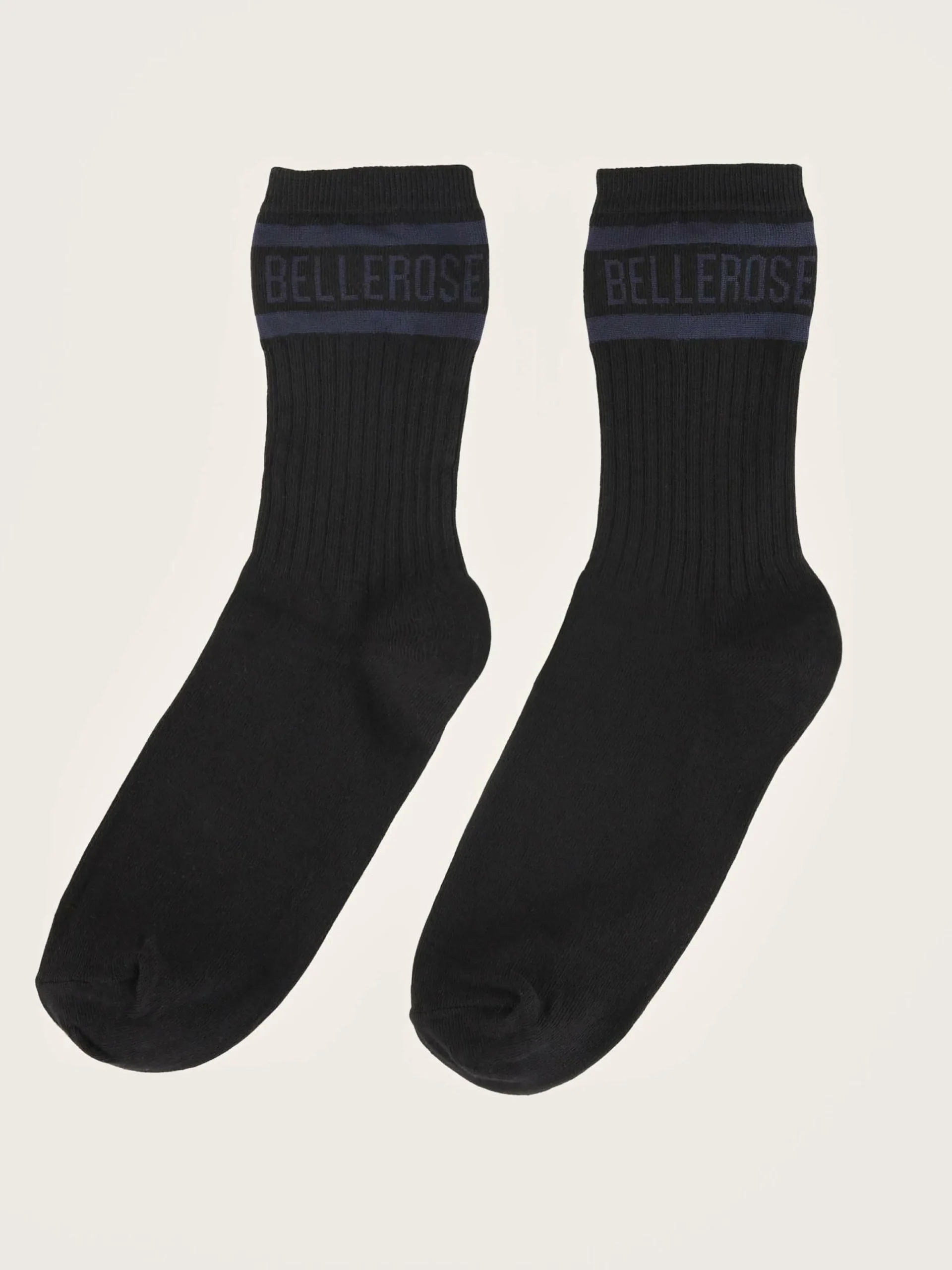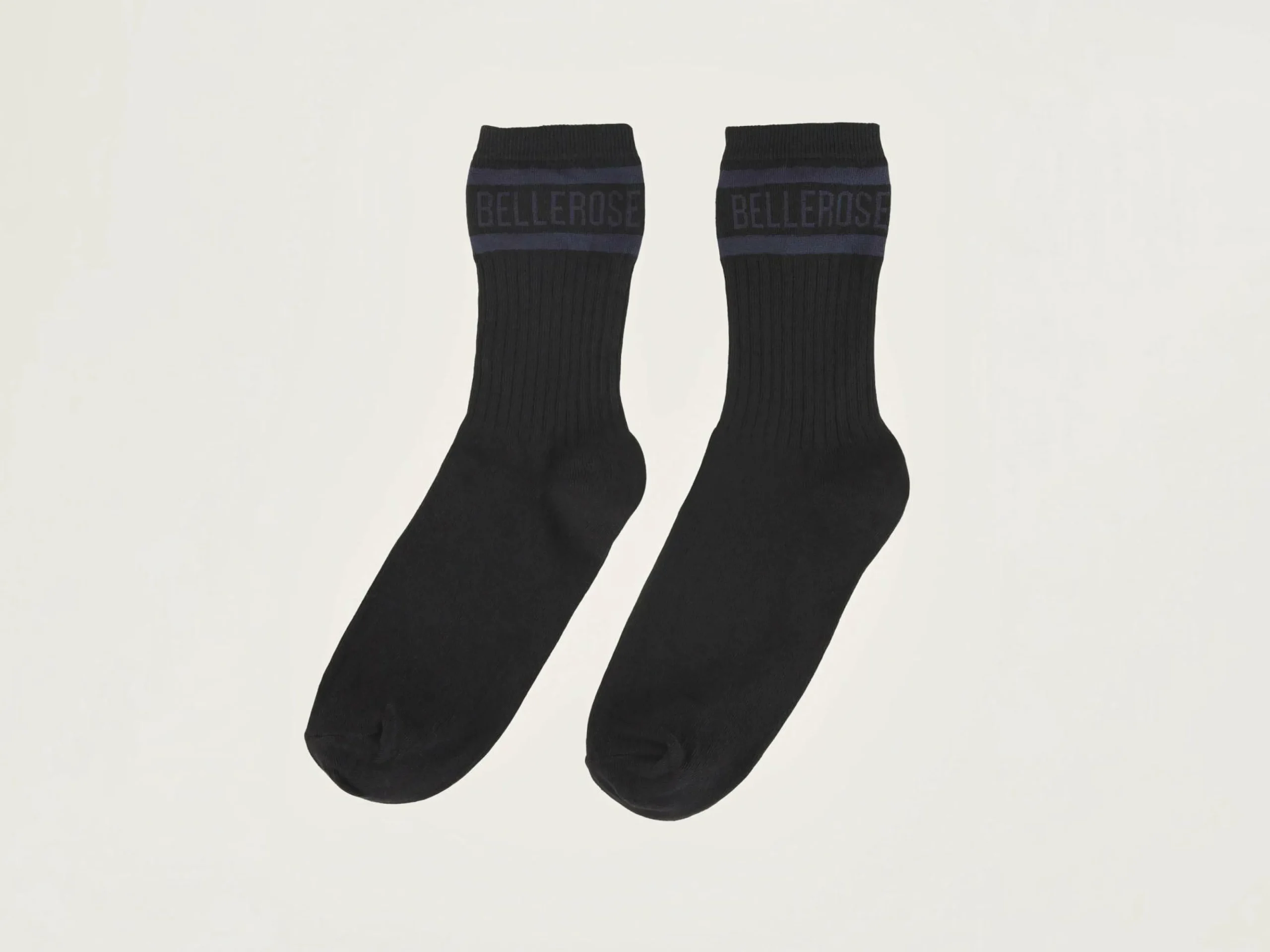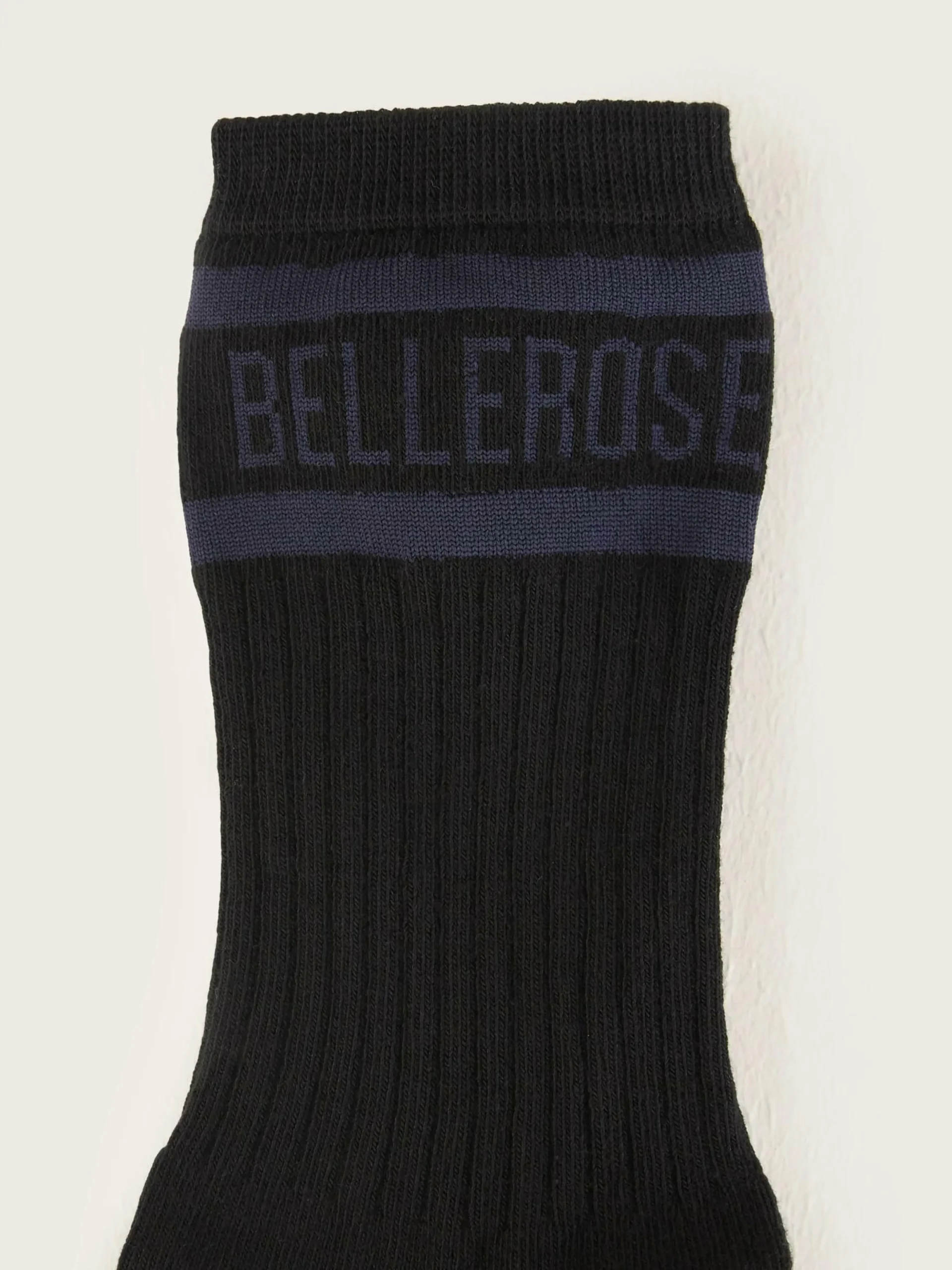 Chaussettes classiques en noir avec logo Bellerose en bleu sur la cheville.