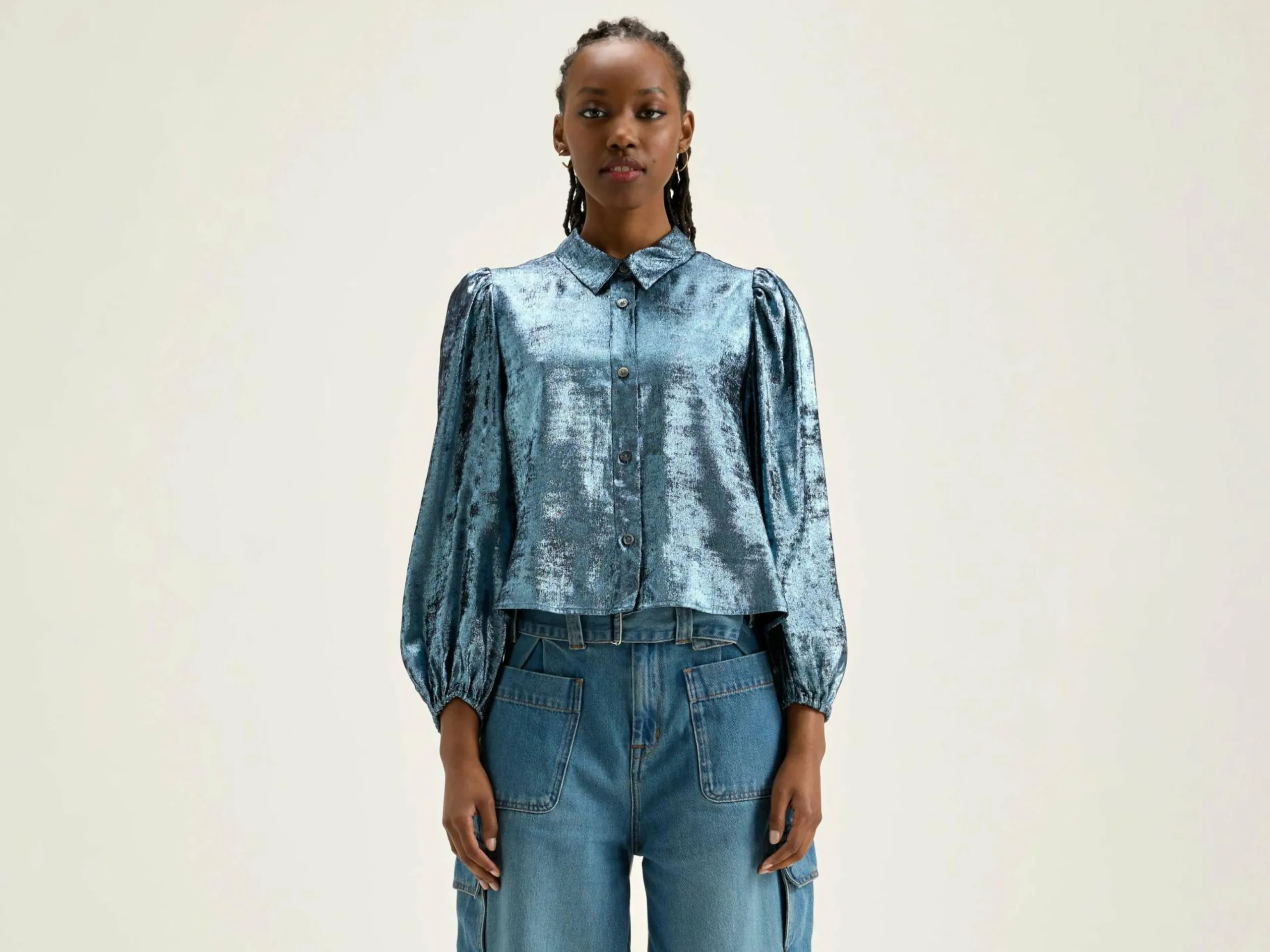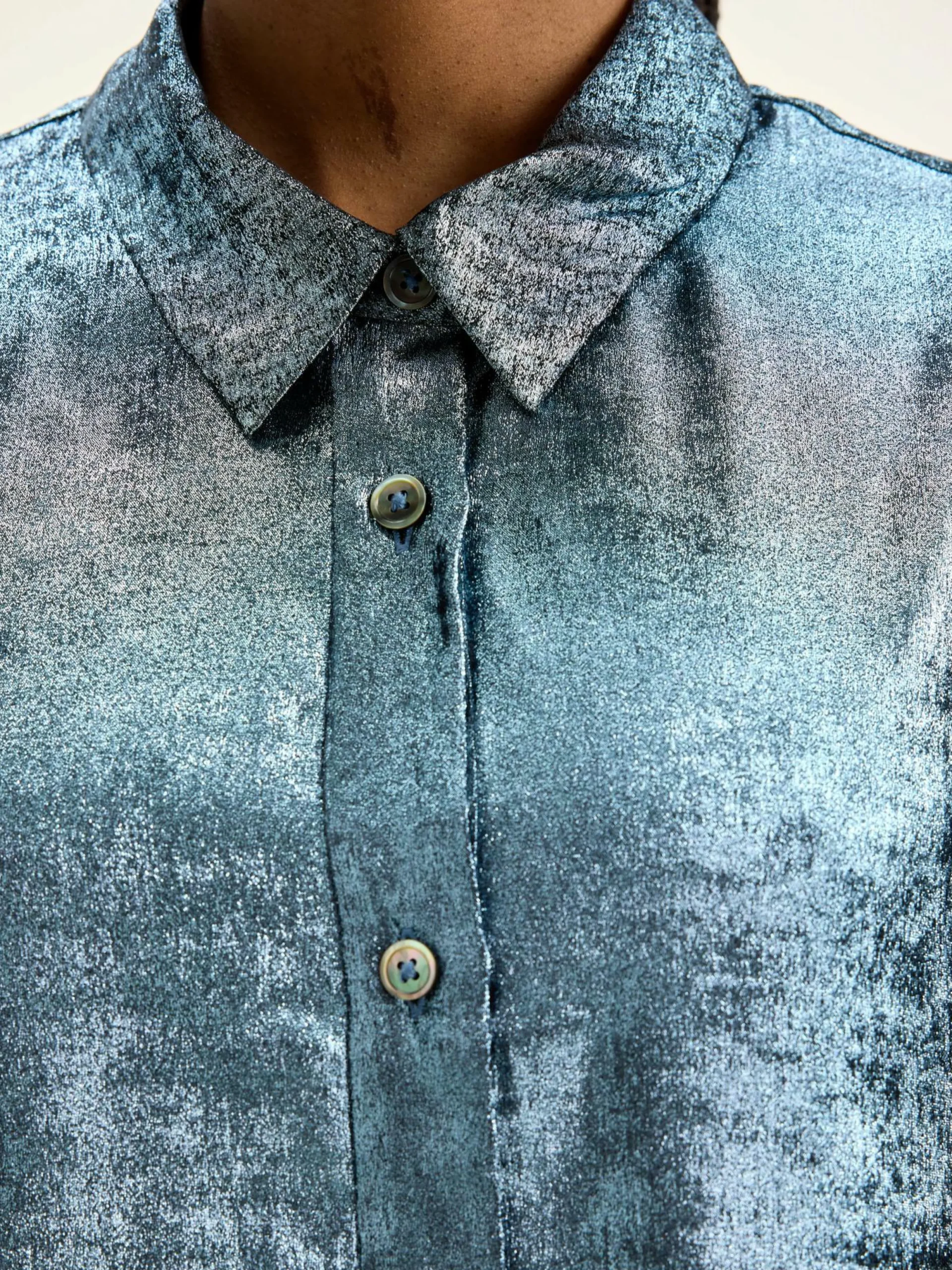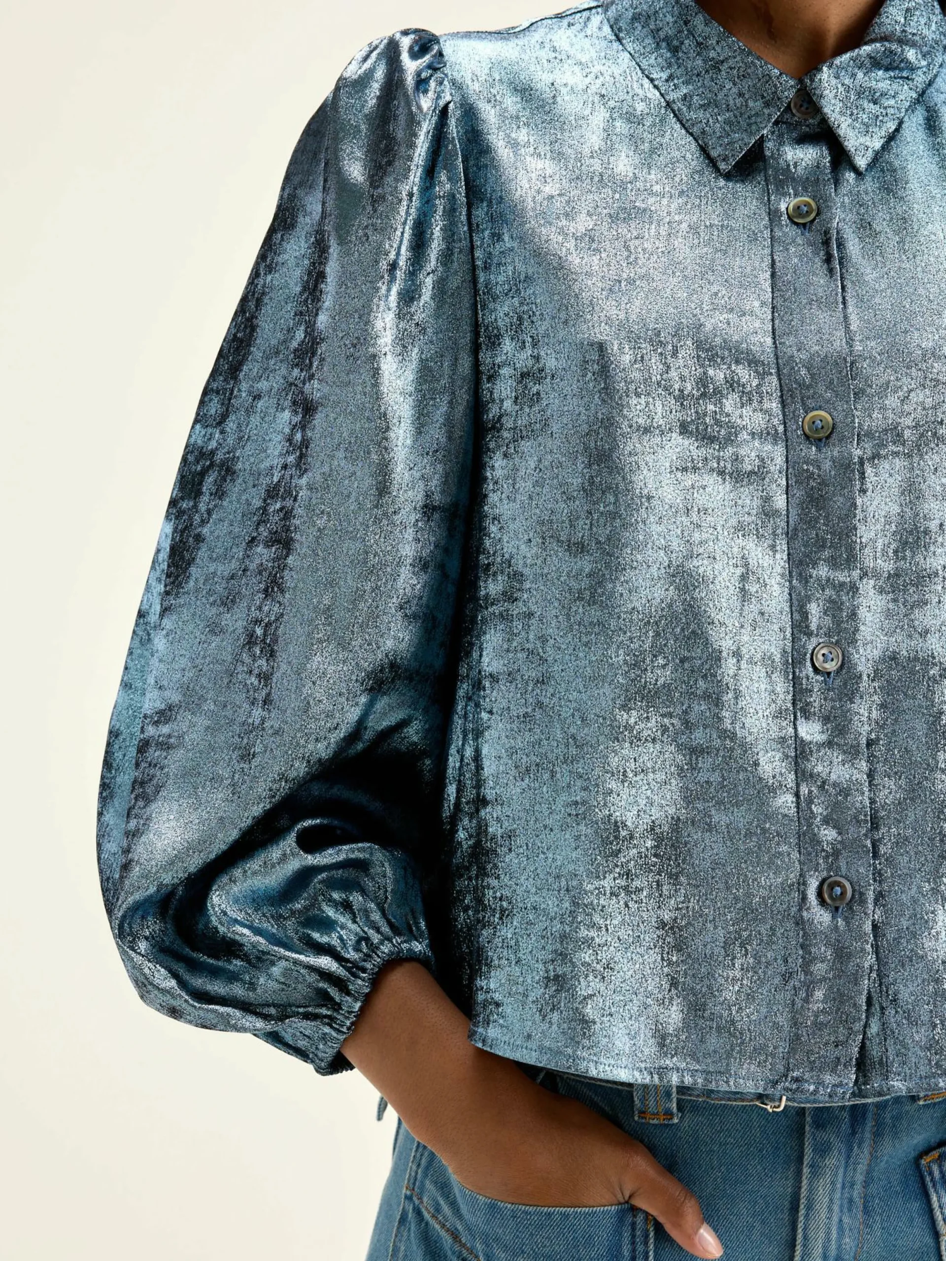Blouse classique à manches bouffantes en tissu brillant argenté façon lamé.