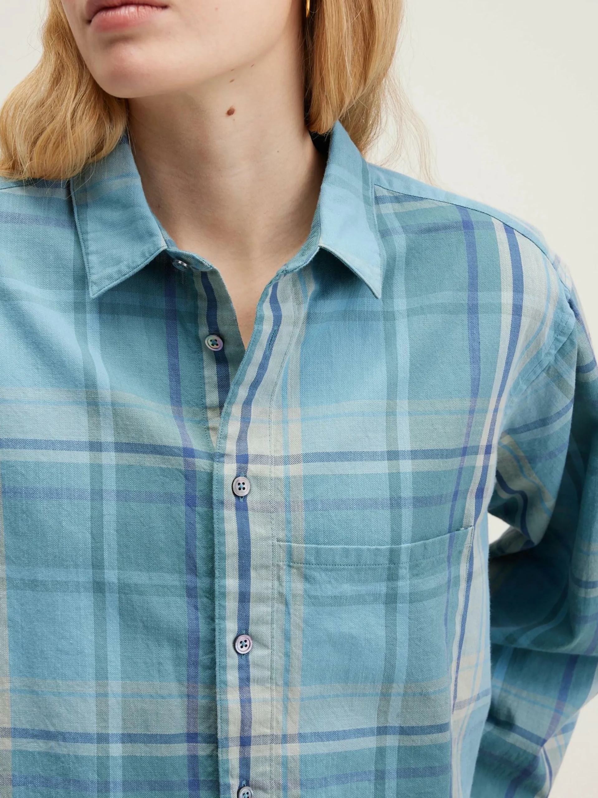 Chemise oversize en toile de coton bleu à carreaux.