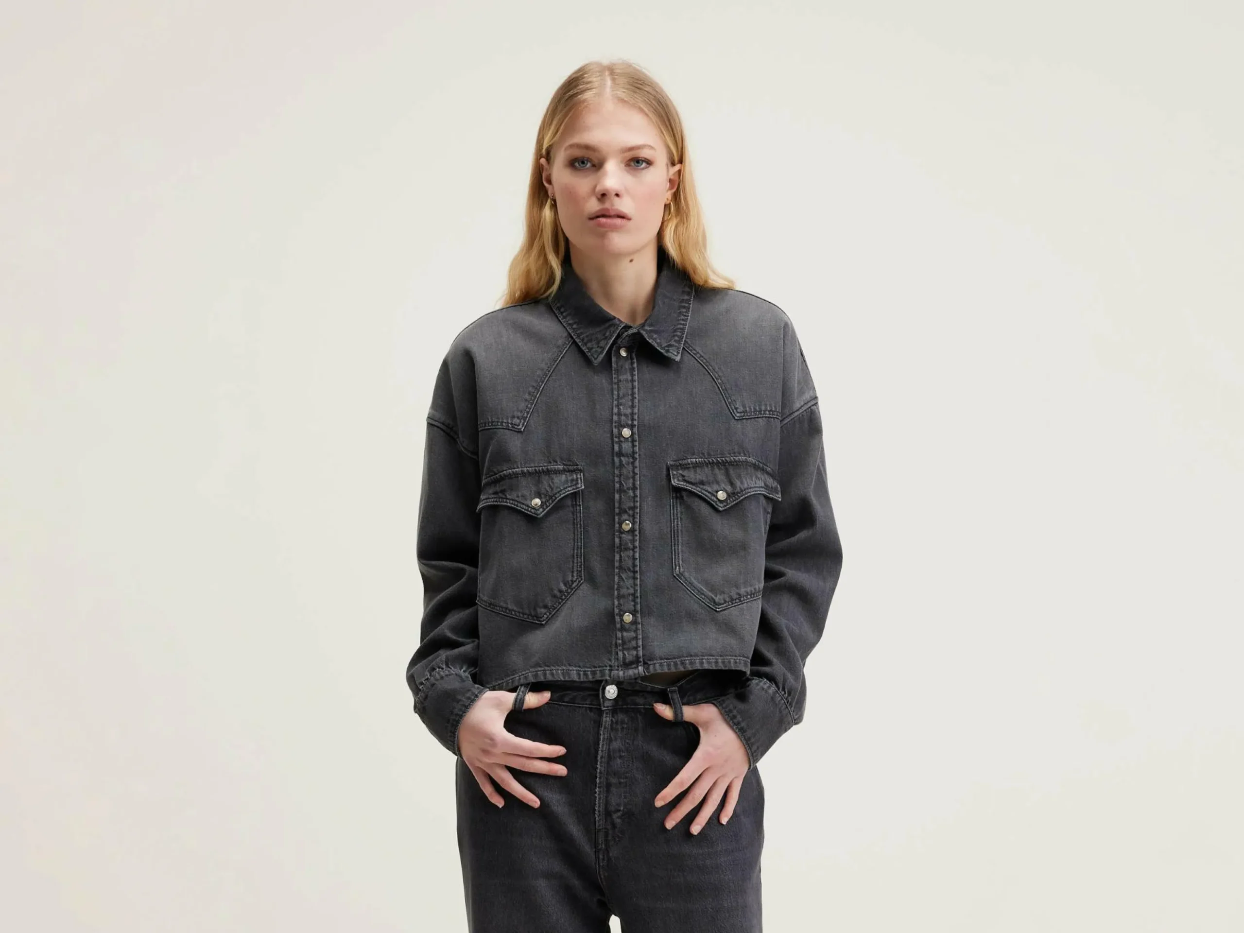 Chemise d’inspiration western, oversize et cropped, en denim de coton noir usé.