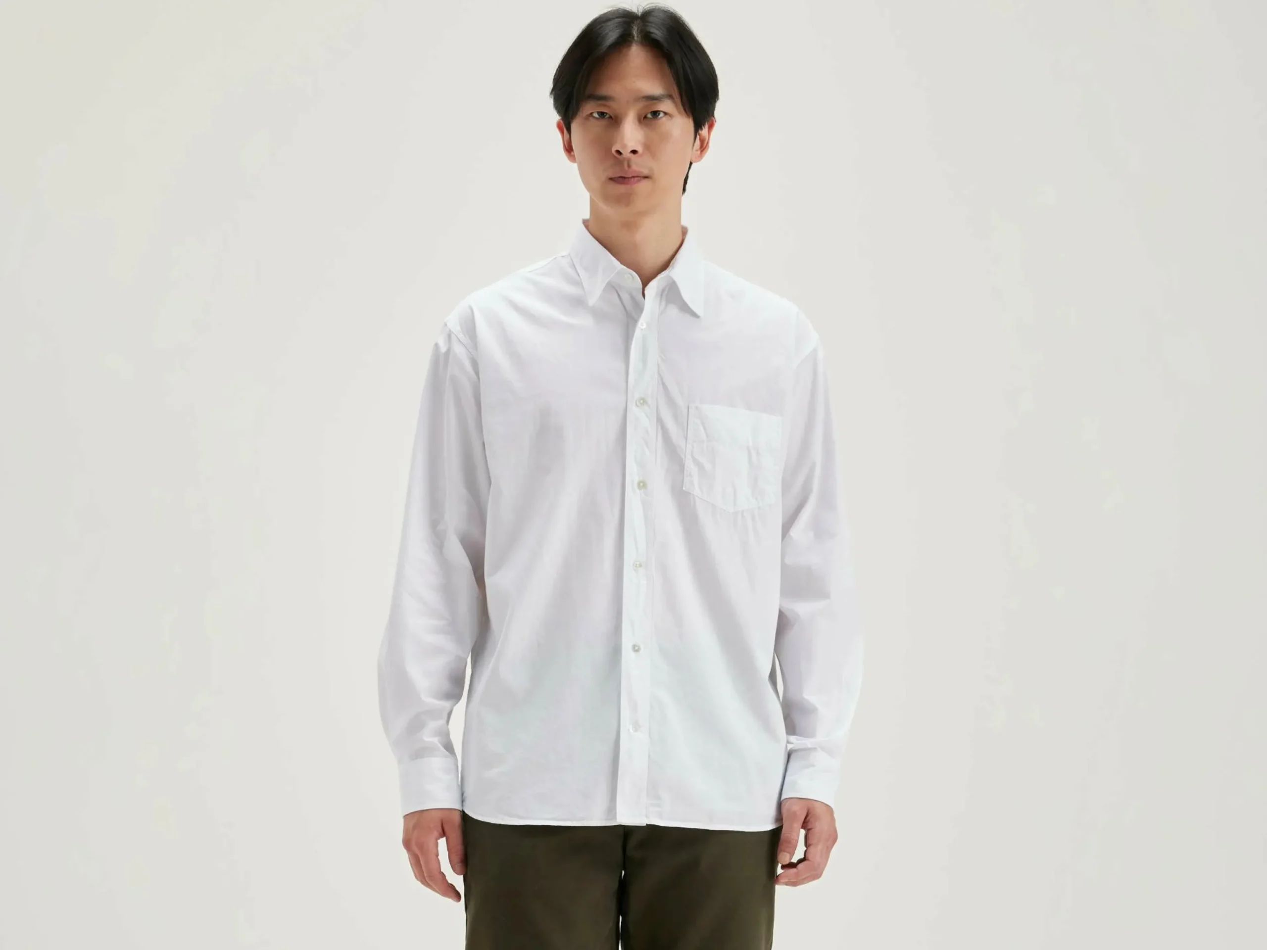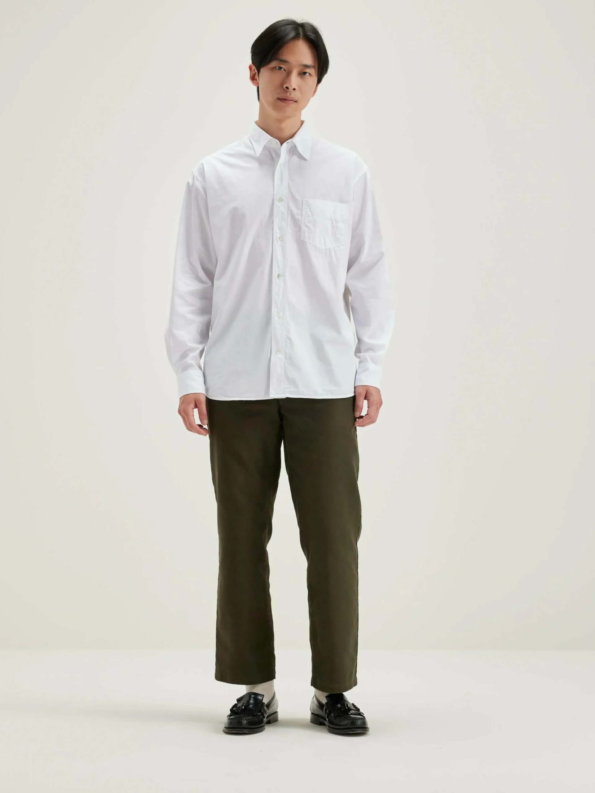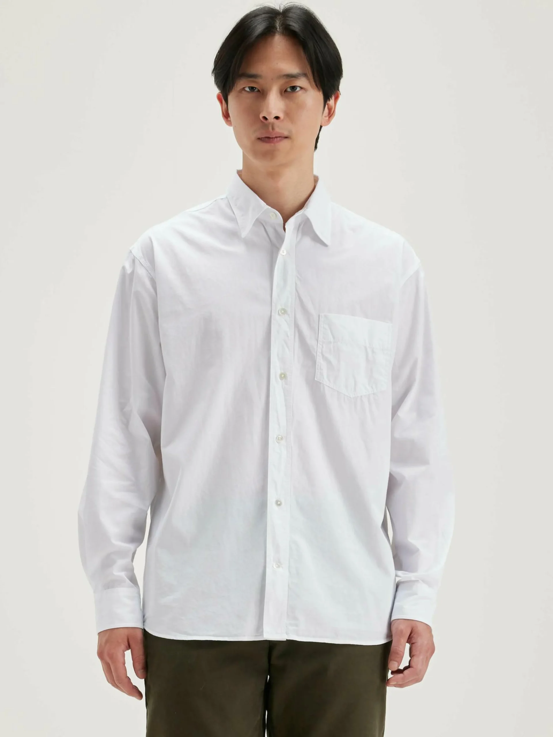 Chemise en coton blanc, coupe décontractée.