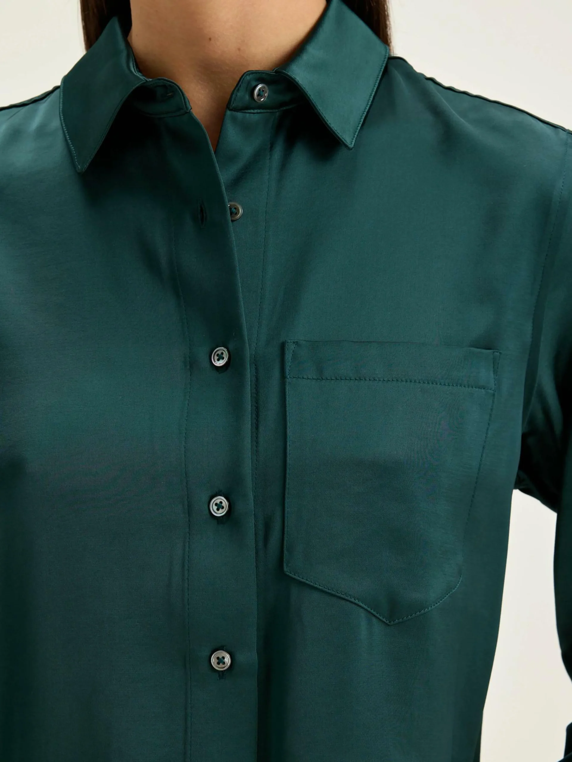 Chemise à coupe longue et droite en viscose couleur vert foncé.
