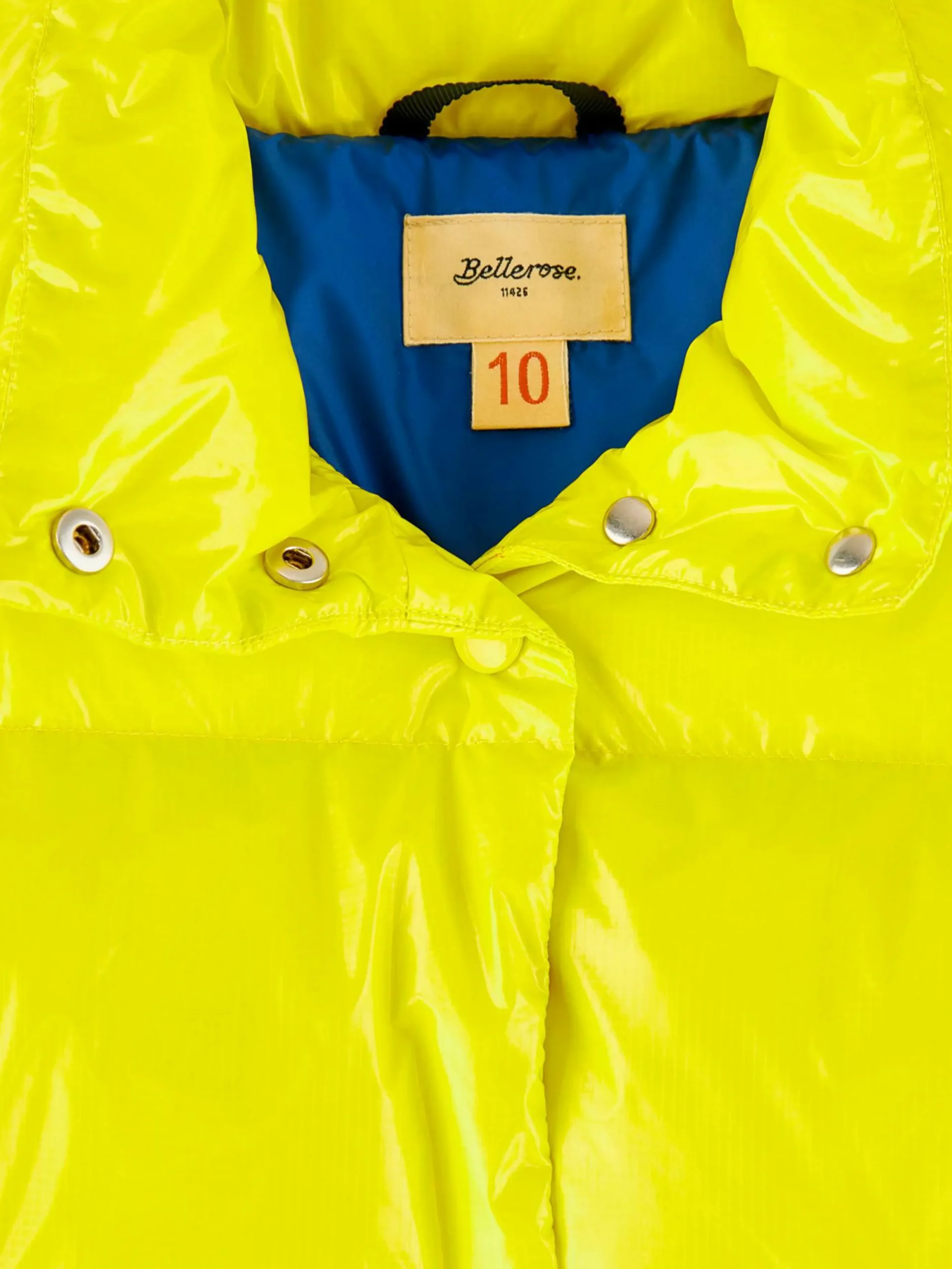 Doudoune jaune fluo avec zip avant et boutons-pression dans le bas permettant d’ajuster la longueur d’une coupe classique à une coupe courte.