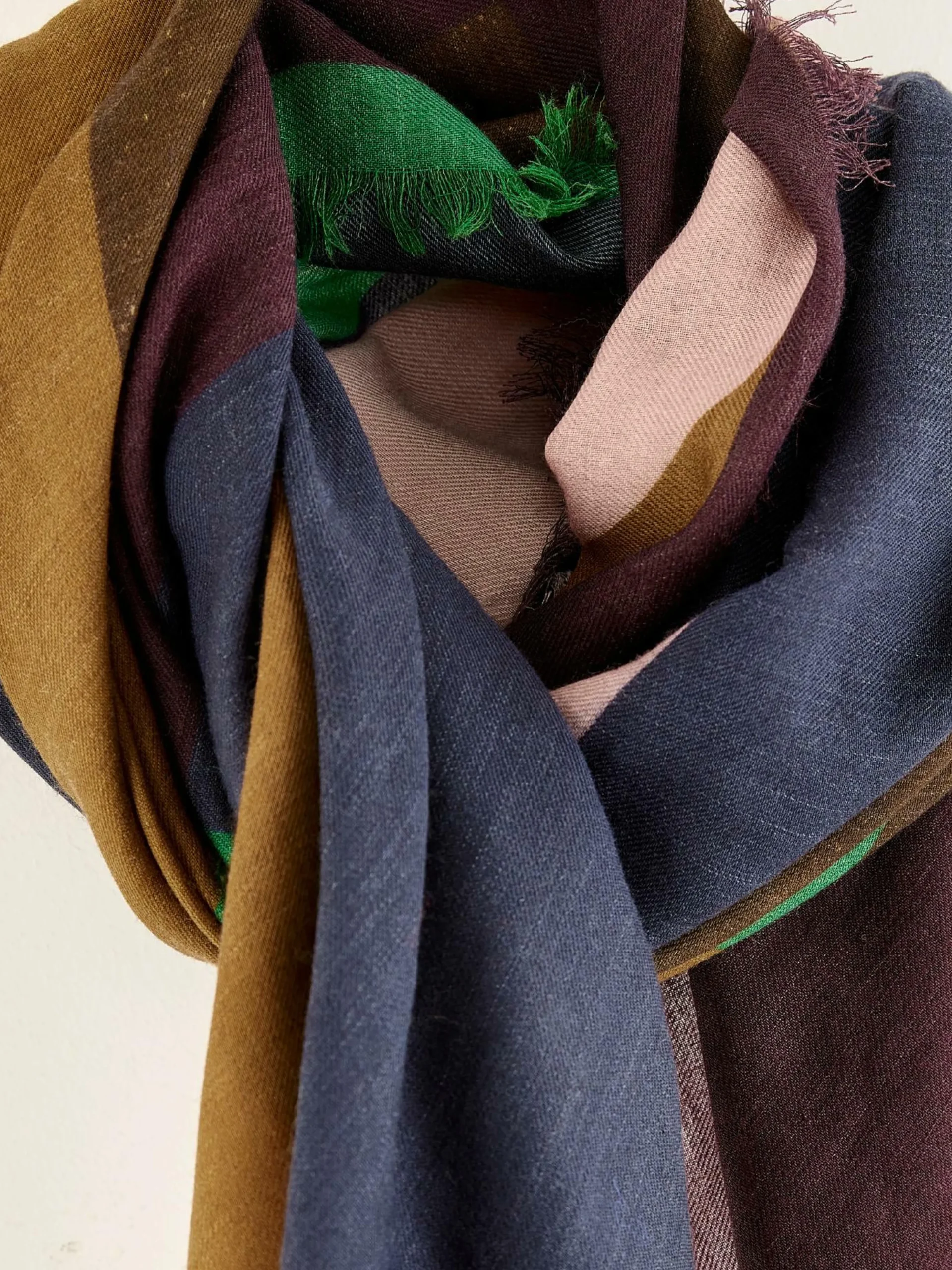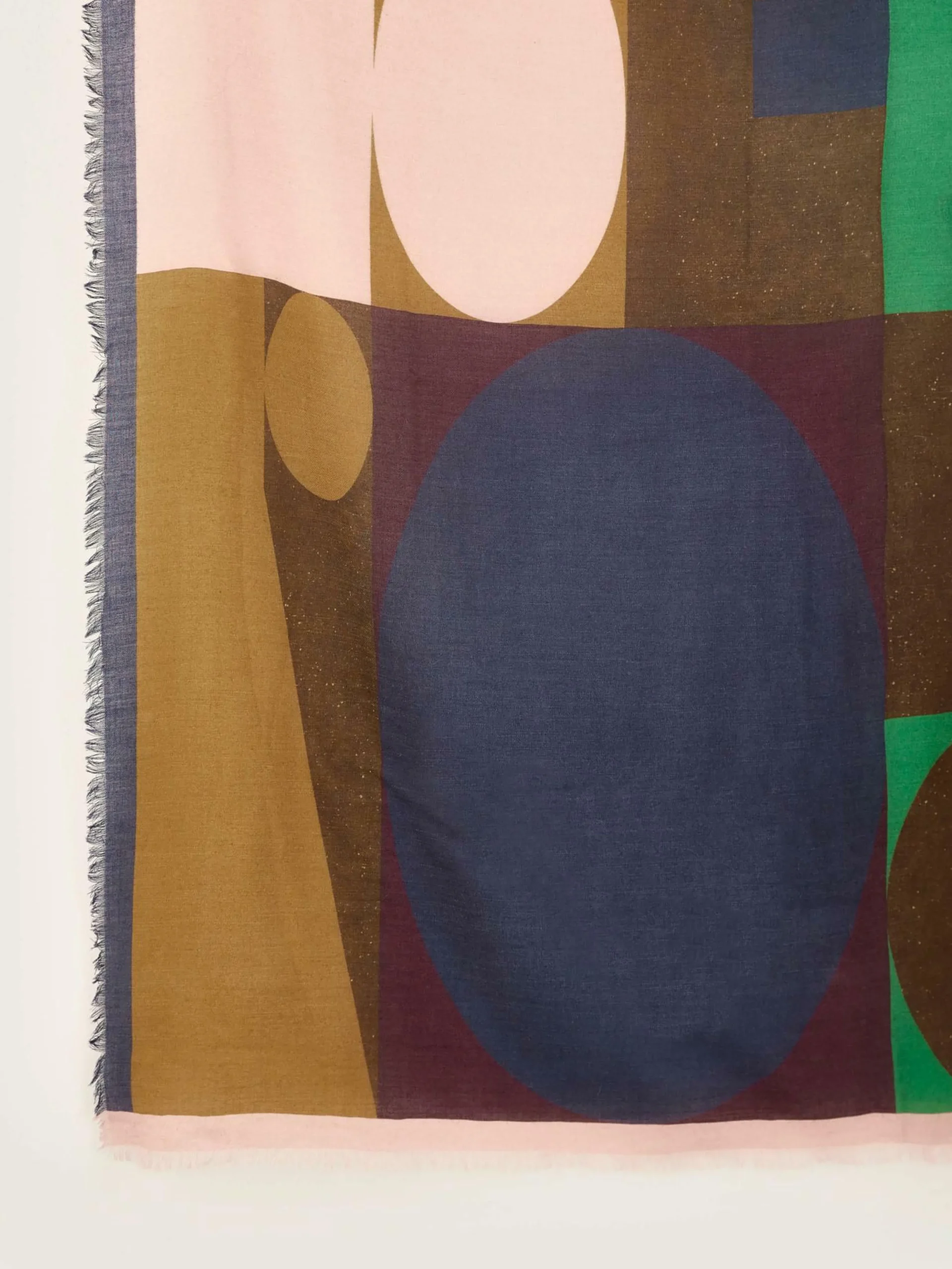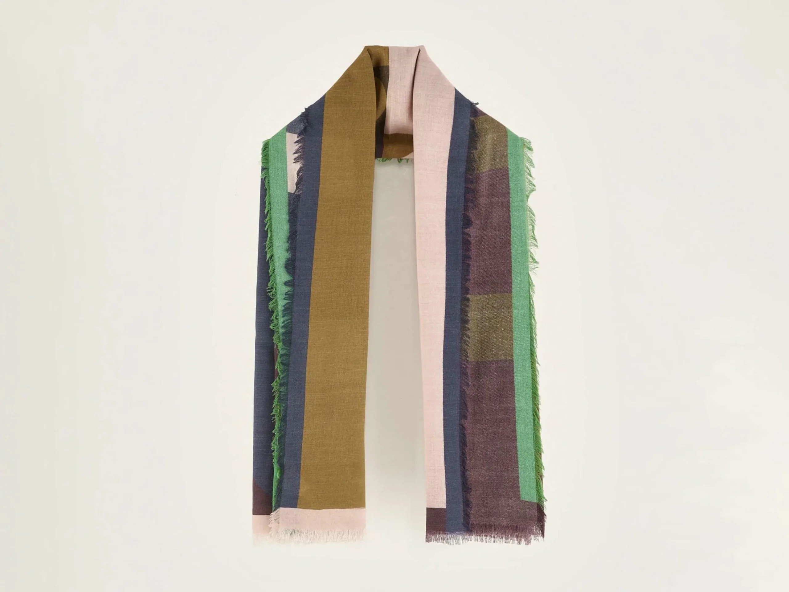 Écharpe carrée logotypée avec lettres multicolores et fond moucheté.
