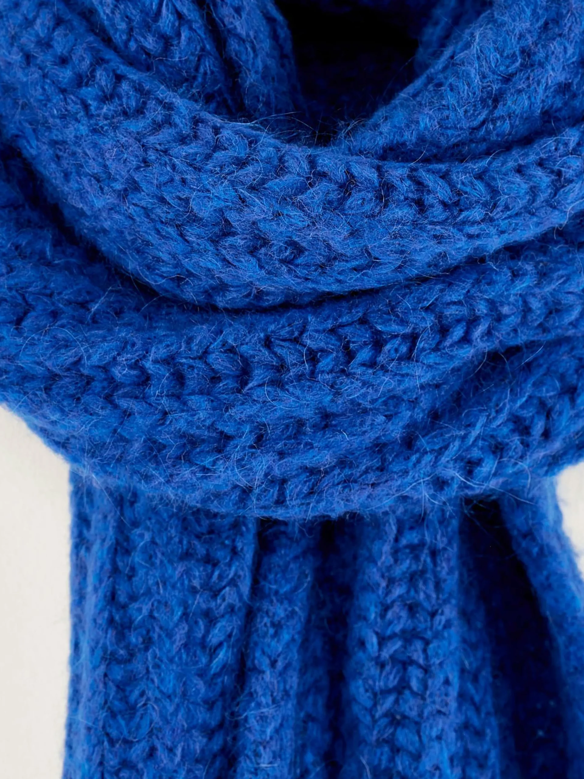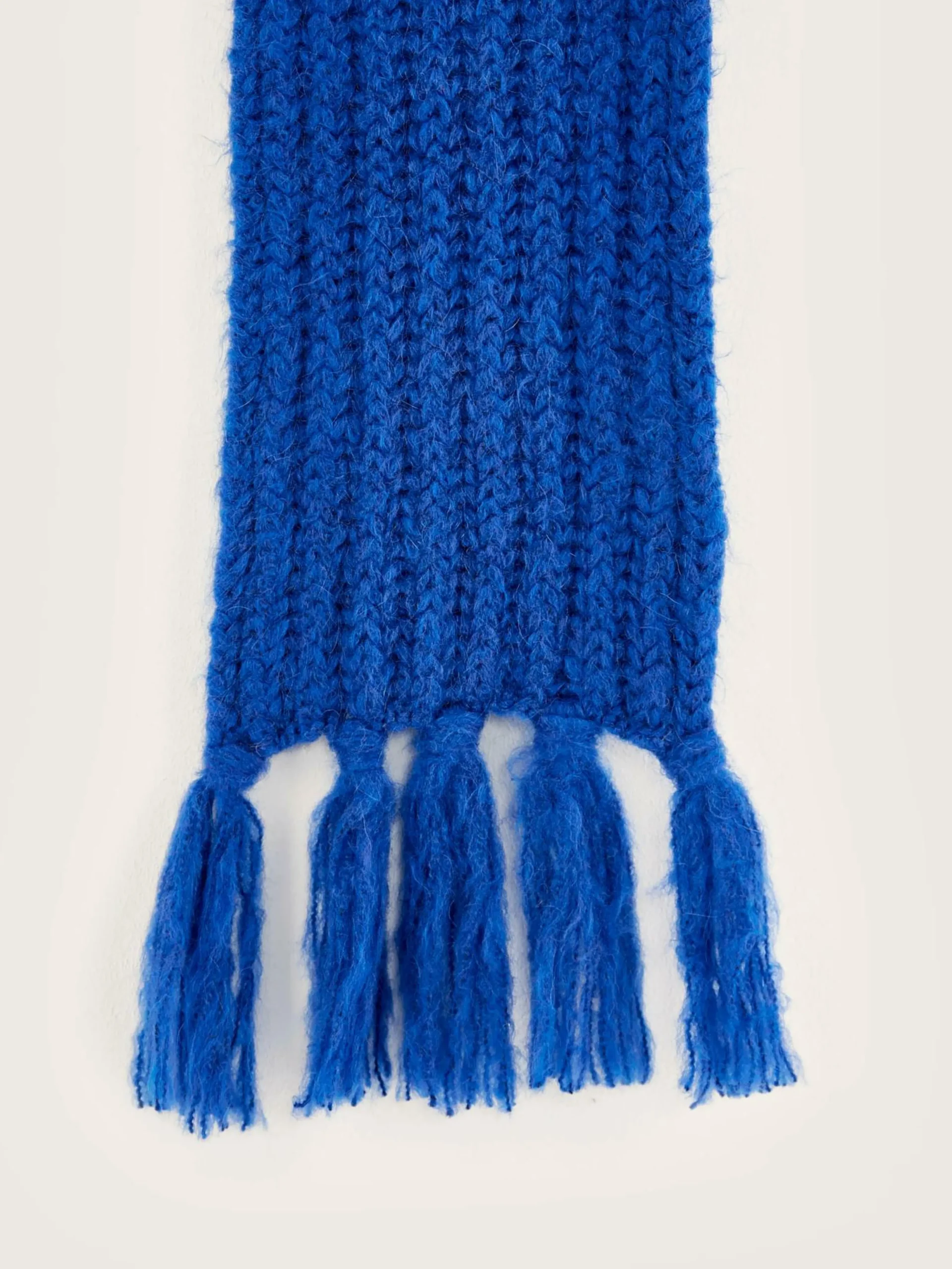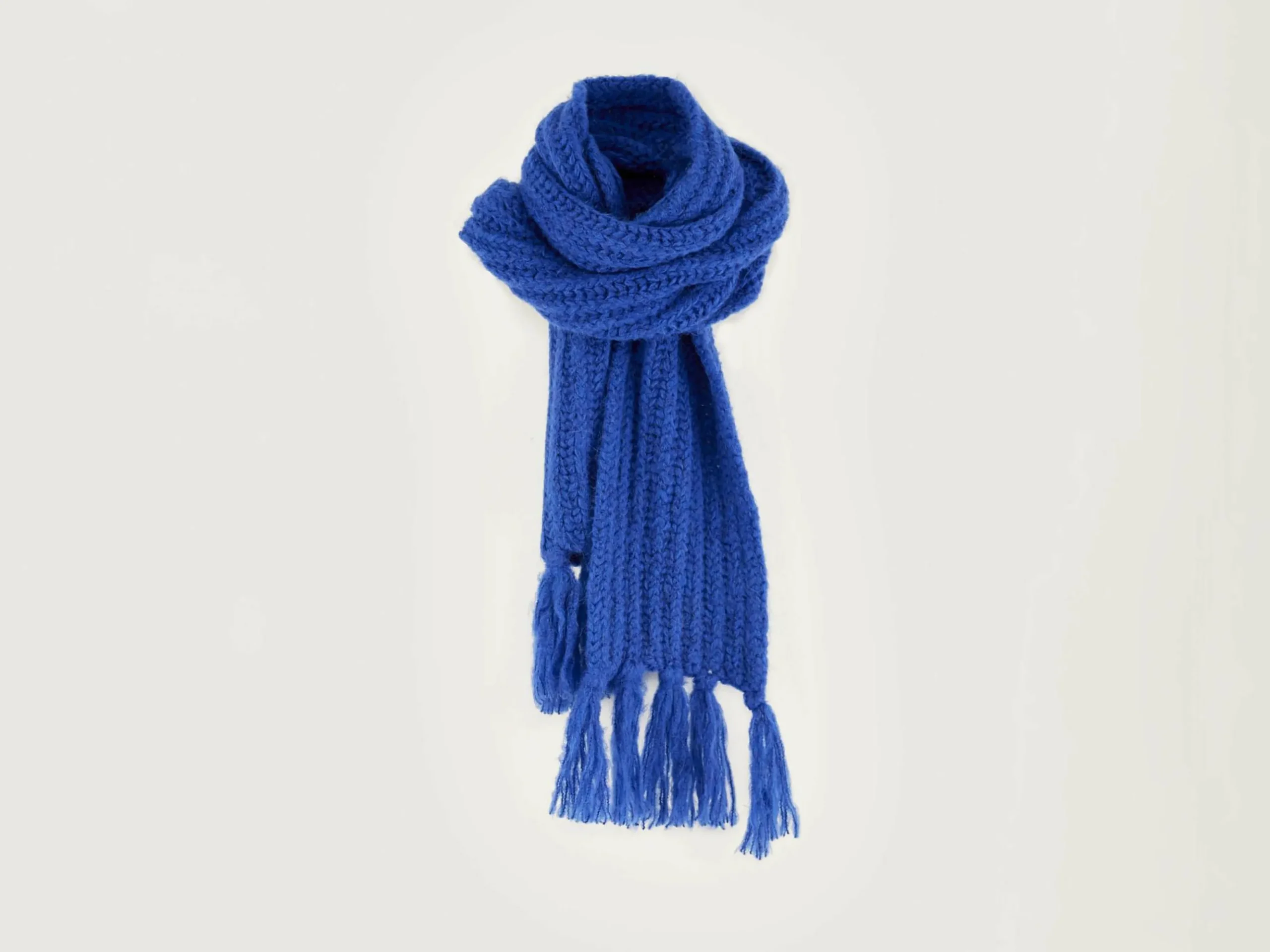 Longue écharpe de couleur bleu Klein en maille côtelée avec franges.