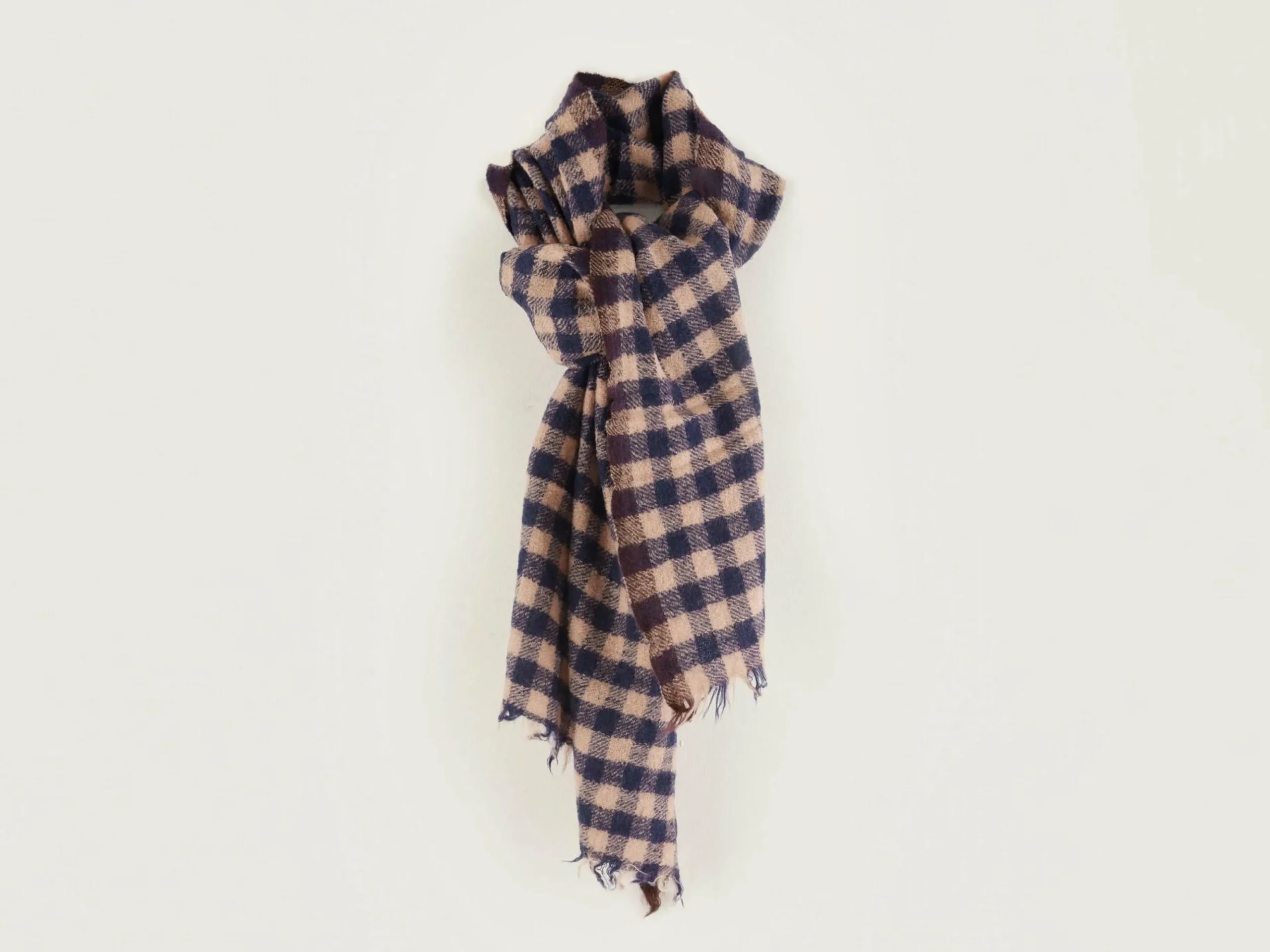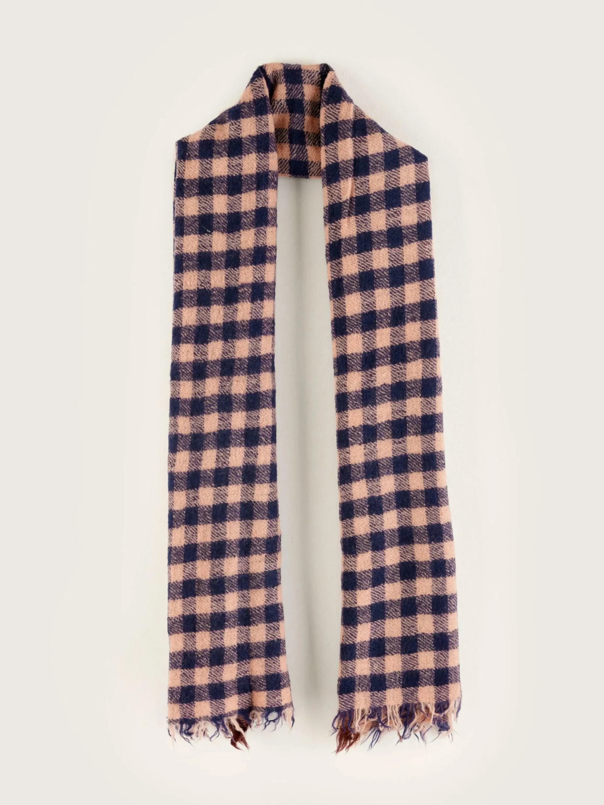 Écharpe à carreaux roses en laine tissée.
