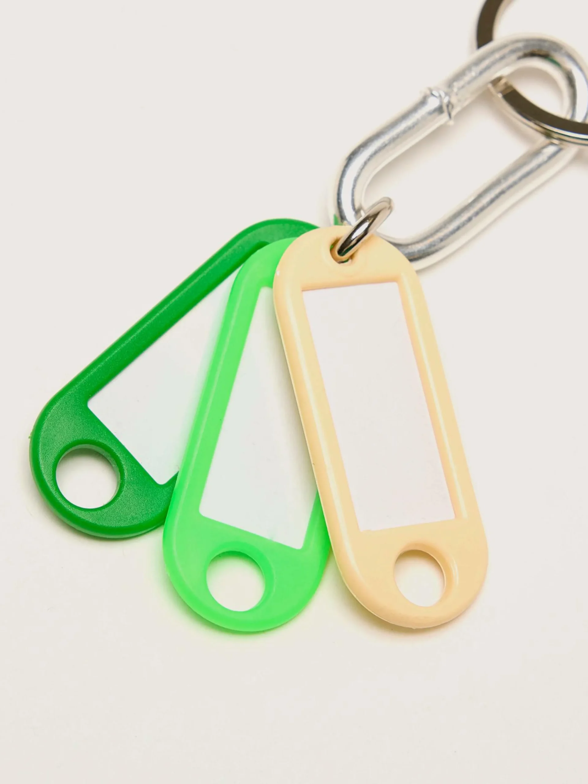 Gardez vos clés organisées avec le porte-clés Etiketten d’Ina Seifart, composé d’étiquettes en plastique avec des étiquettes vierges et un anneau plaqué argent.