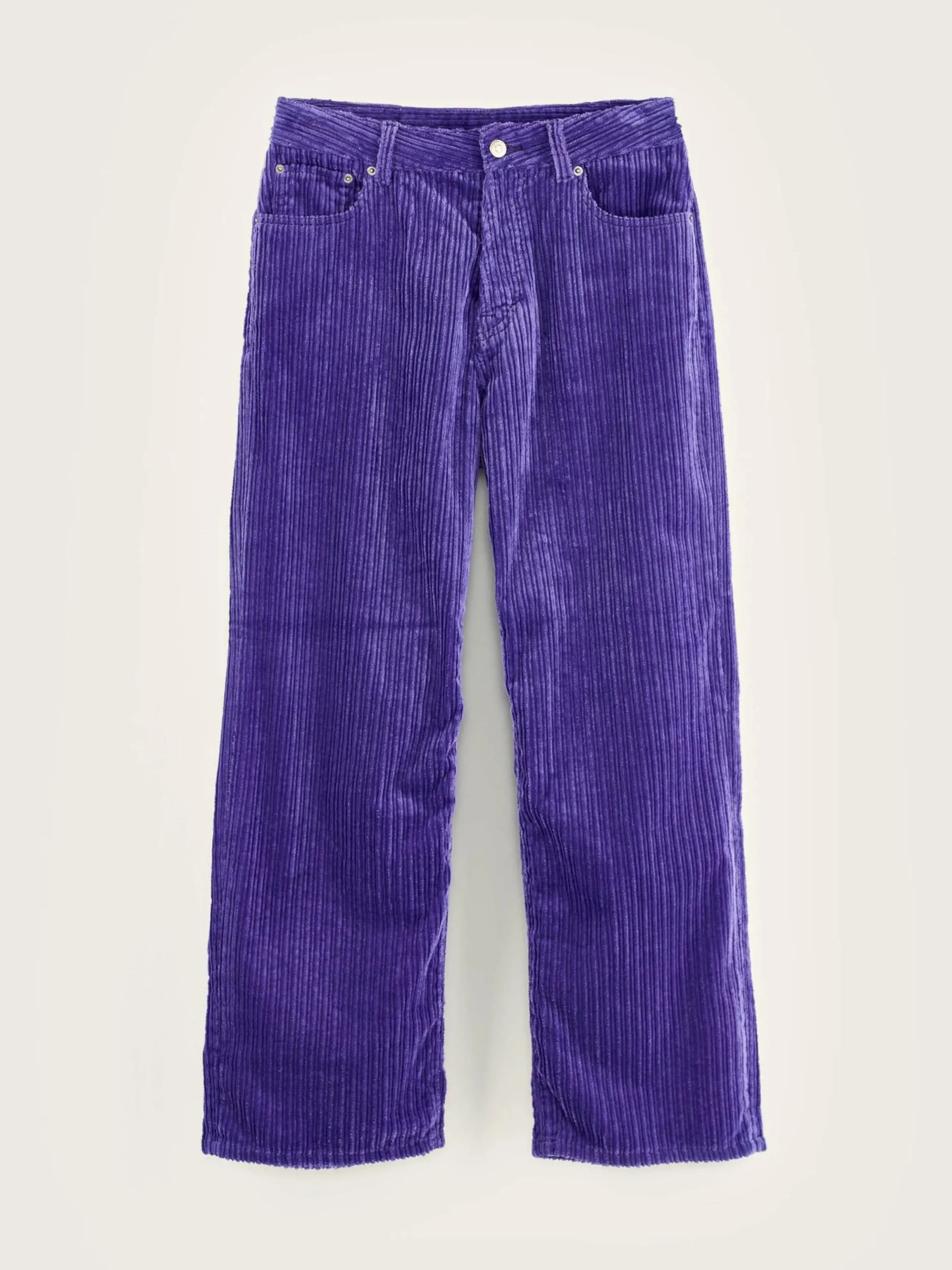 Jean taille normale et jambe large, fabriqué en velours violet à larges côtes.