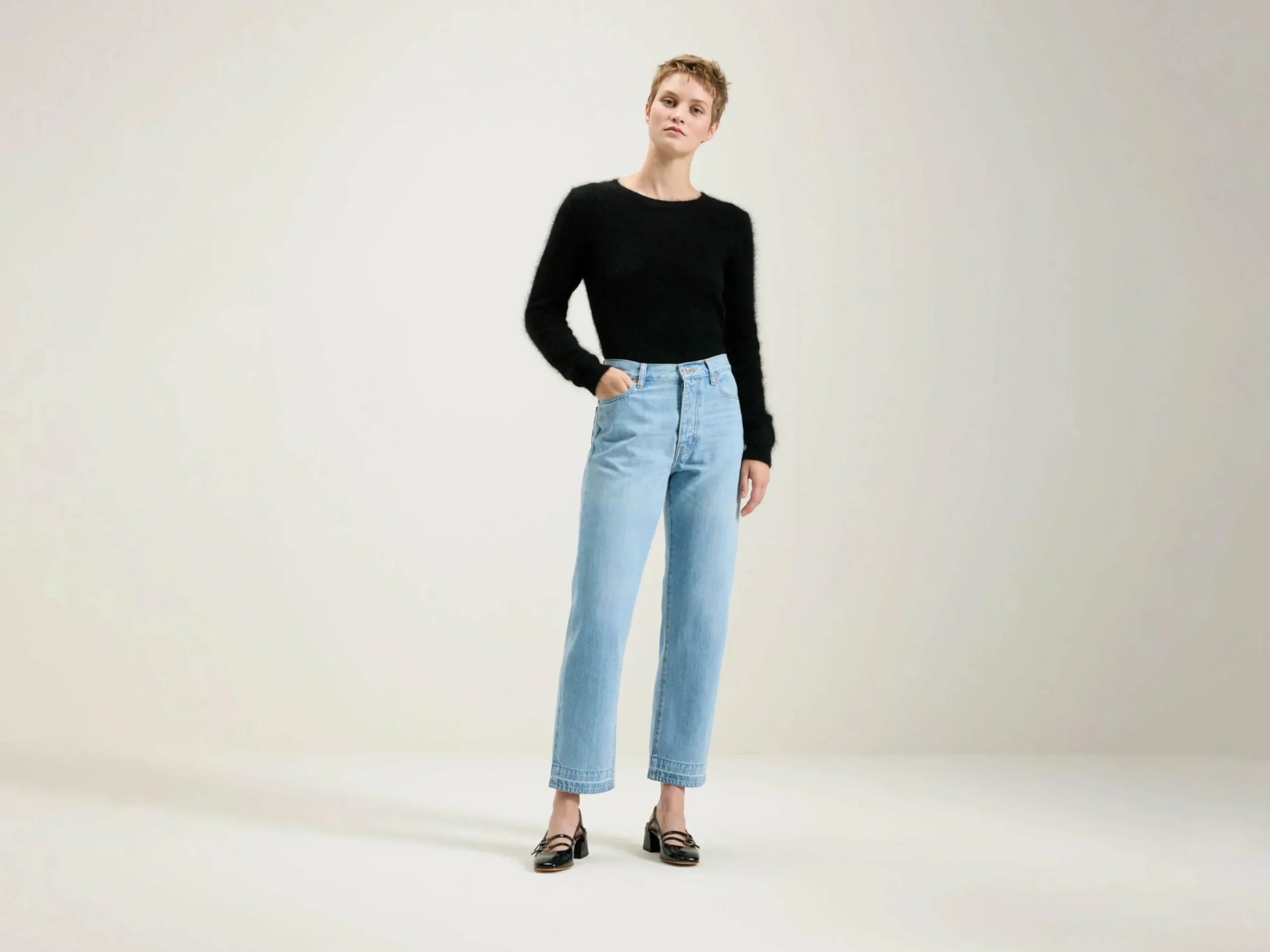 Jean régulier taille haute en denim de coton bleu clair usé.