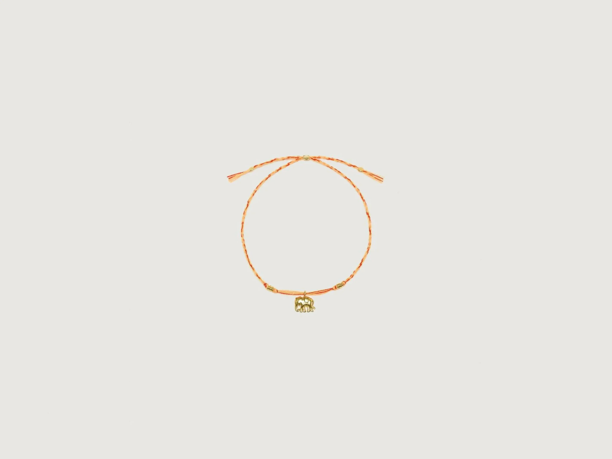 Le bracelet Ellie est un tressage ajustable, fabriqué à la main au fil fin, et ornée d’un charm d’éléphant plaquée or.