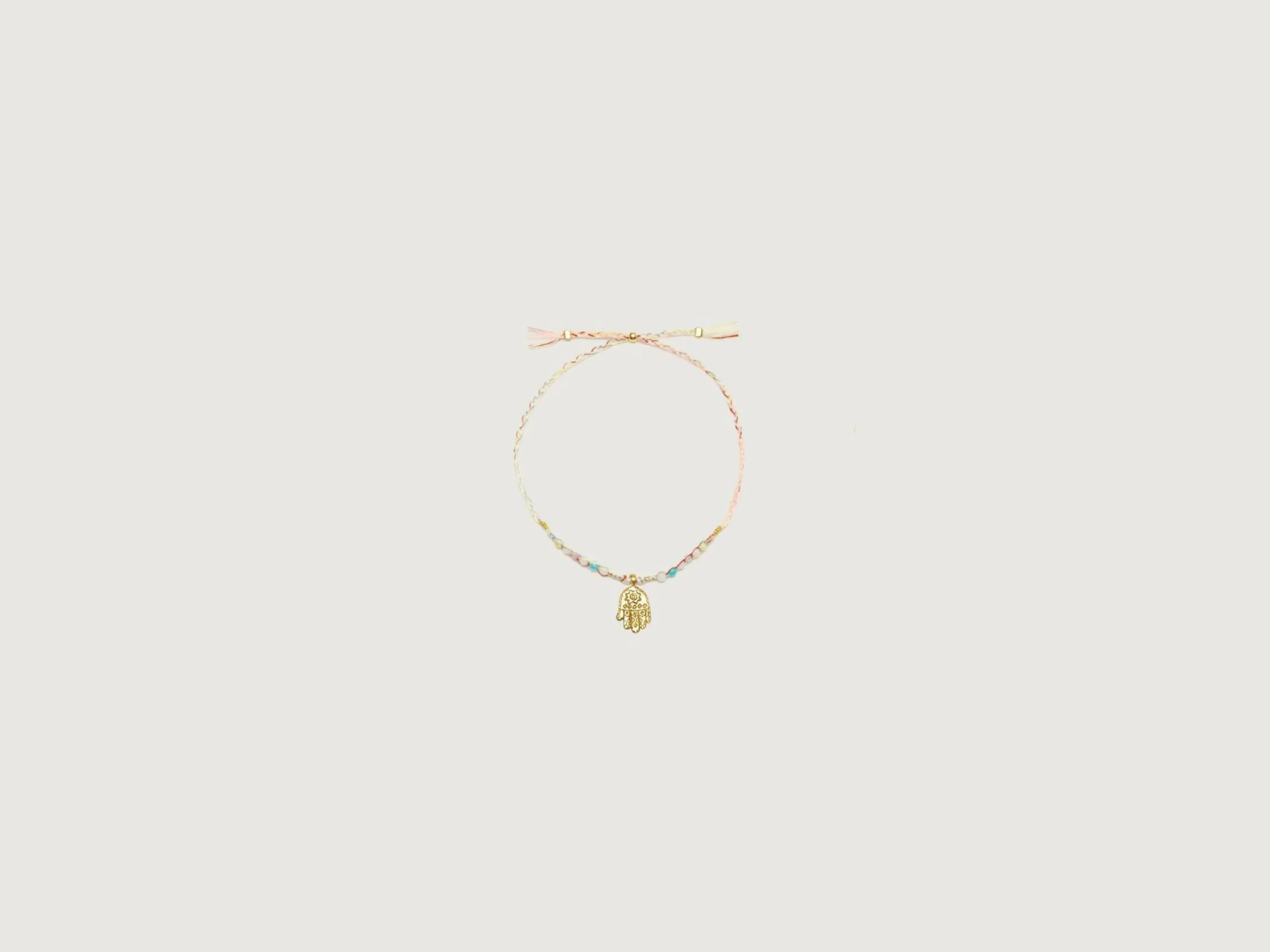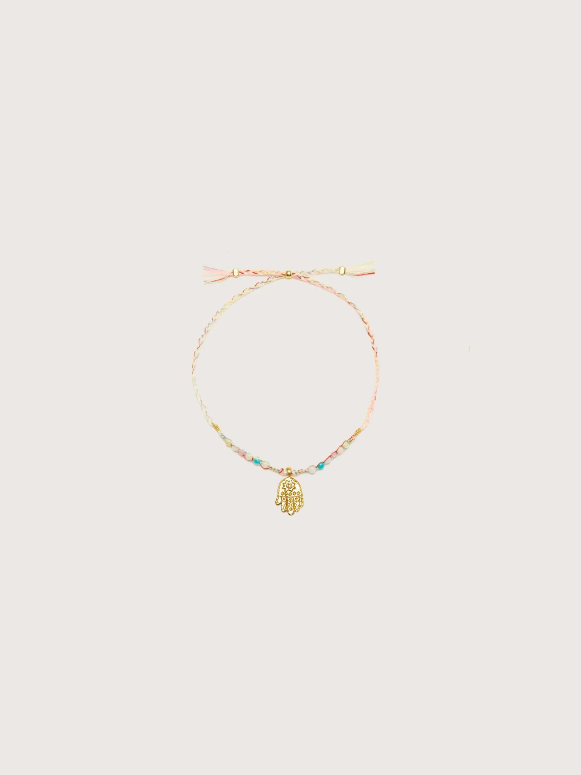 Le bracelet Hamsa est un tressage ajustable fait à la main au fil fin, orné de pierres précieuses et d’un charm plaquée or.