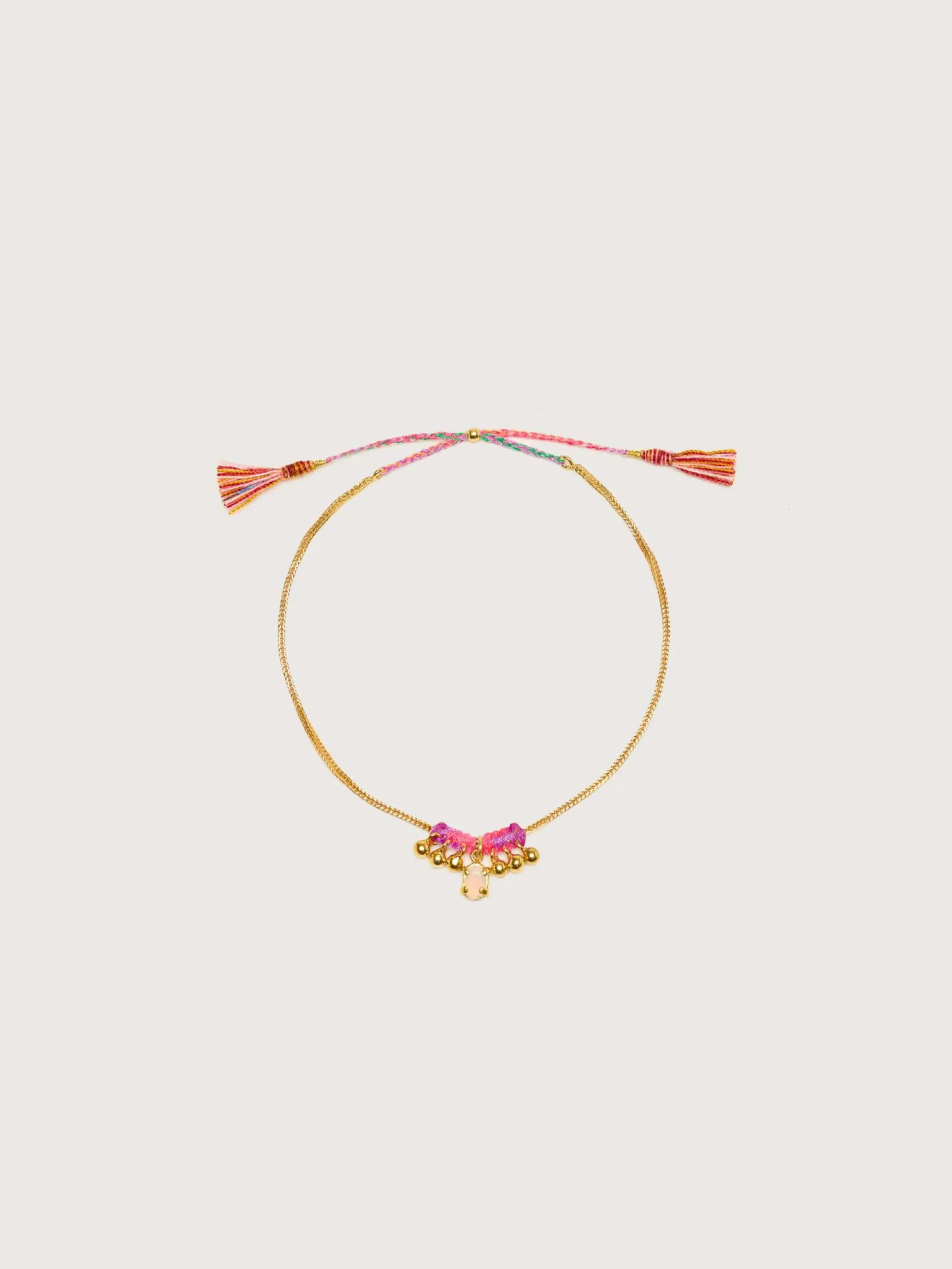 Le bracelet Saira est une chaîne ajustable en argent plaqué or ornée d’un pendentif en opale africaine dorée et de clochettes en or.