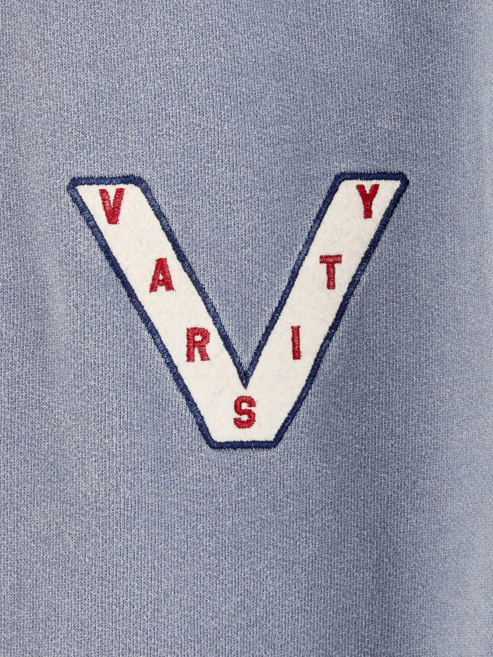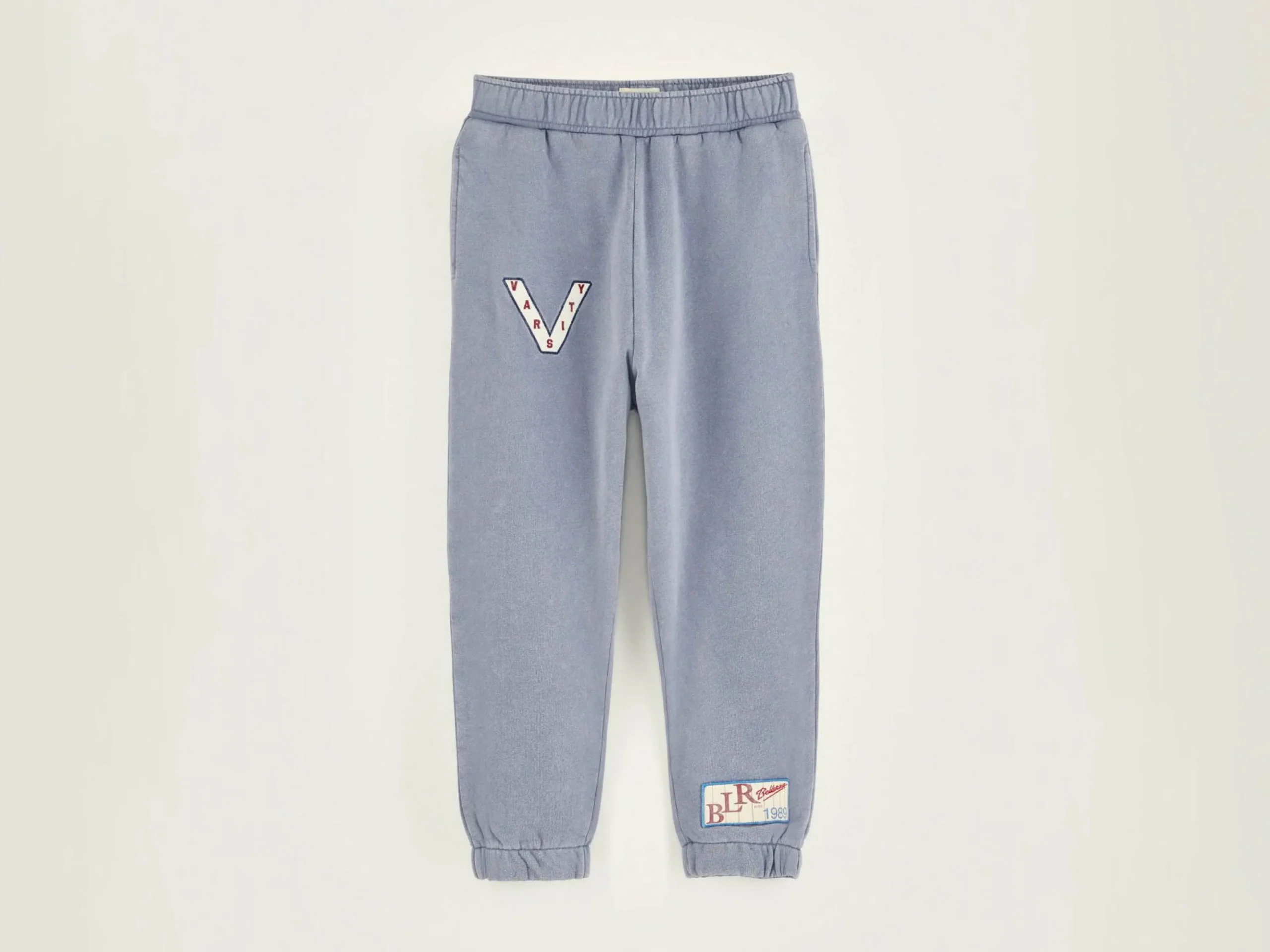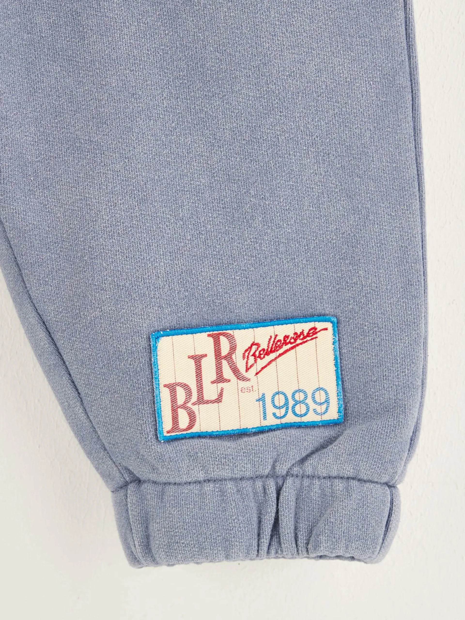 Jogging genderless et oversize en denim de coton délavage bleu clair.