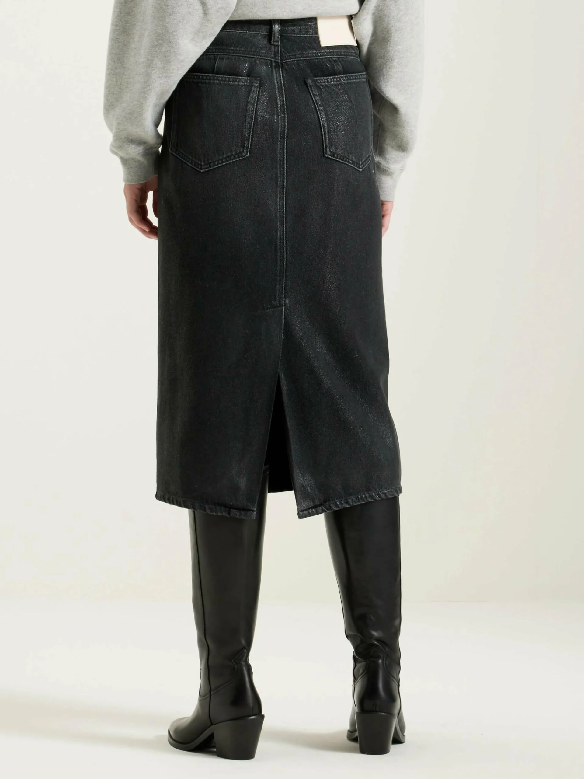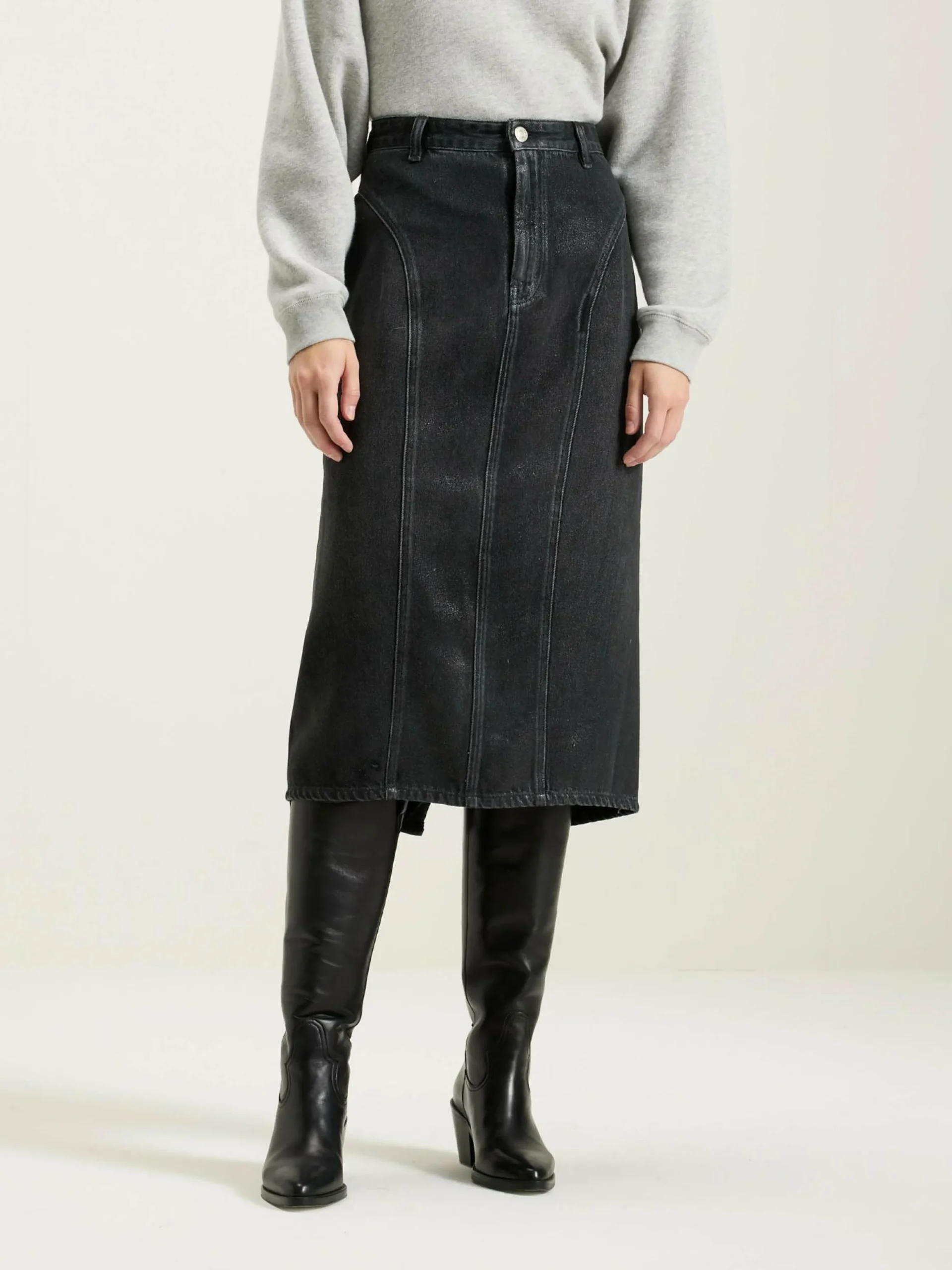 Jupe crayon taille haute, longueur midi, avec empiècements incurvés sur les côtés, fabriquée dans un denim light-used-black avec fini lustré.