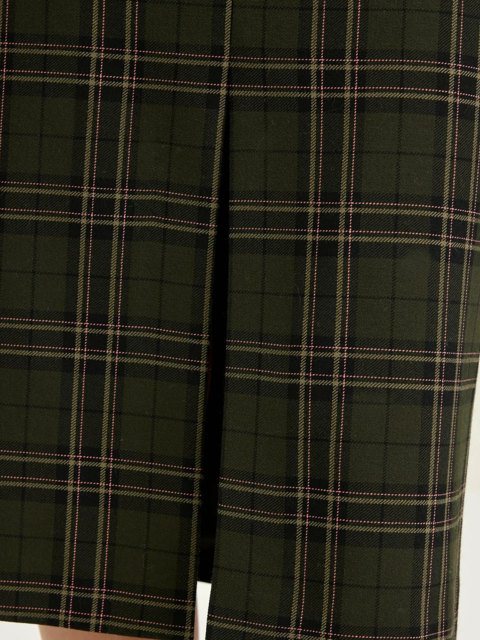 Jupe à carreaux, forme crayon et fendue sur l’avant, taille haute et poches discrètes.