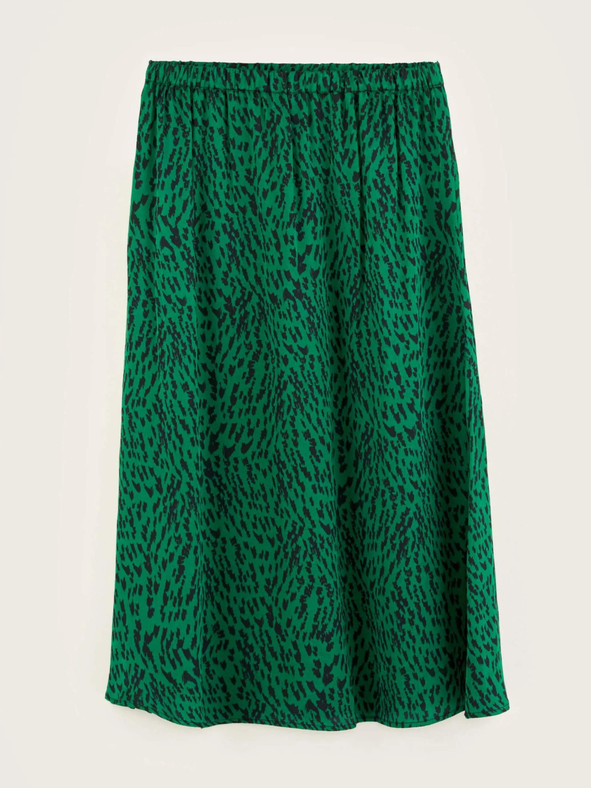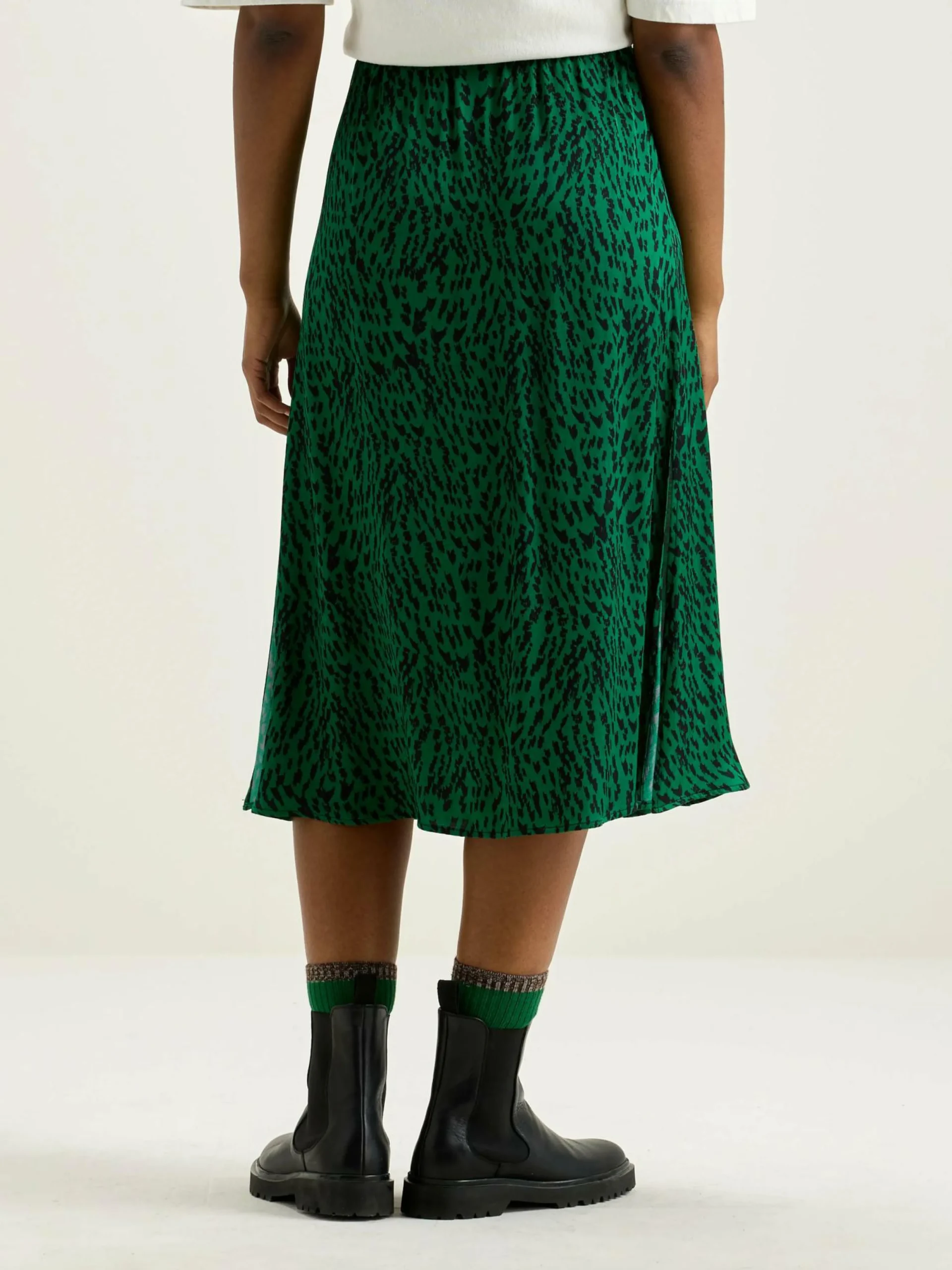Jupe midi en viscose verte imprimée léopard, taille élastique et grandes fentes côté.