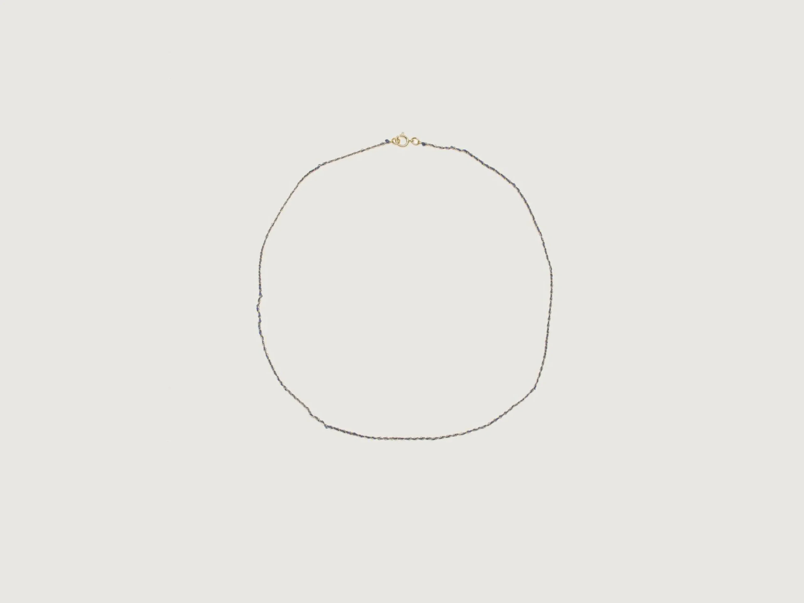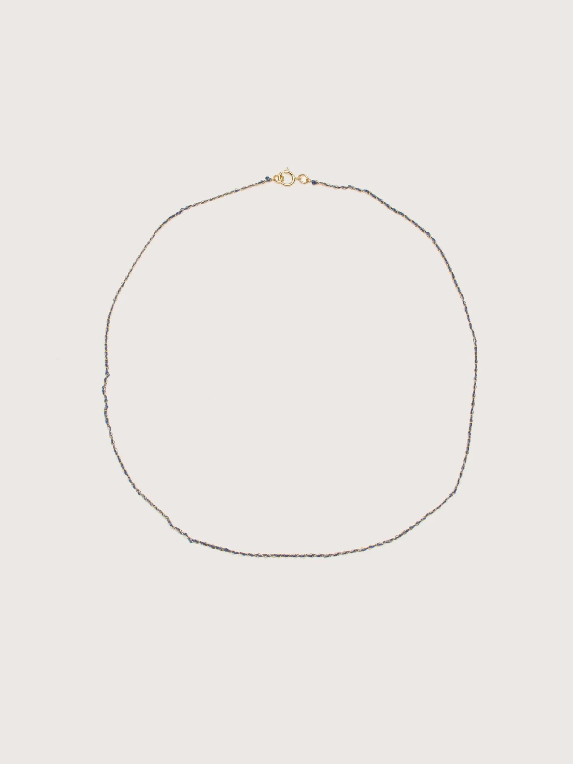 Le collier Maison Mönik Beaute est un délicat tissage de soie et de fils d’or.