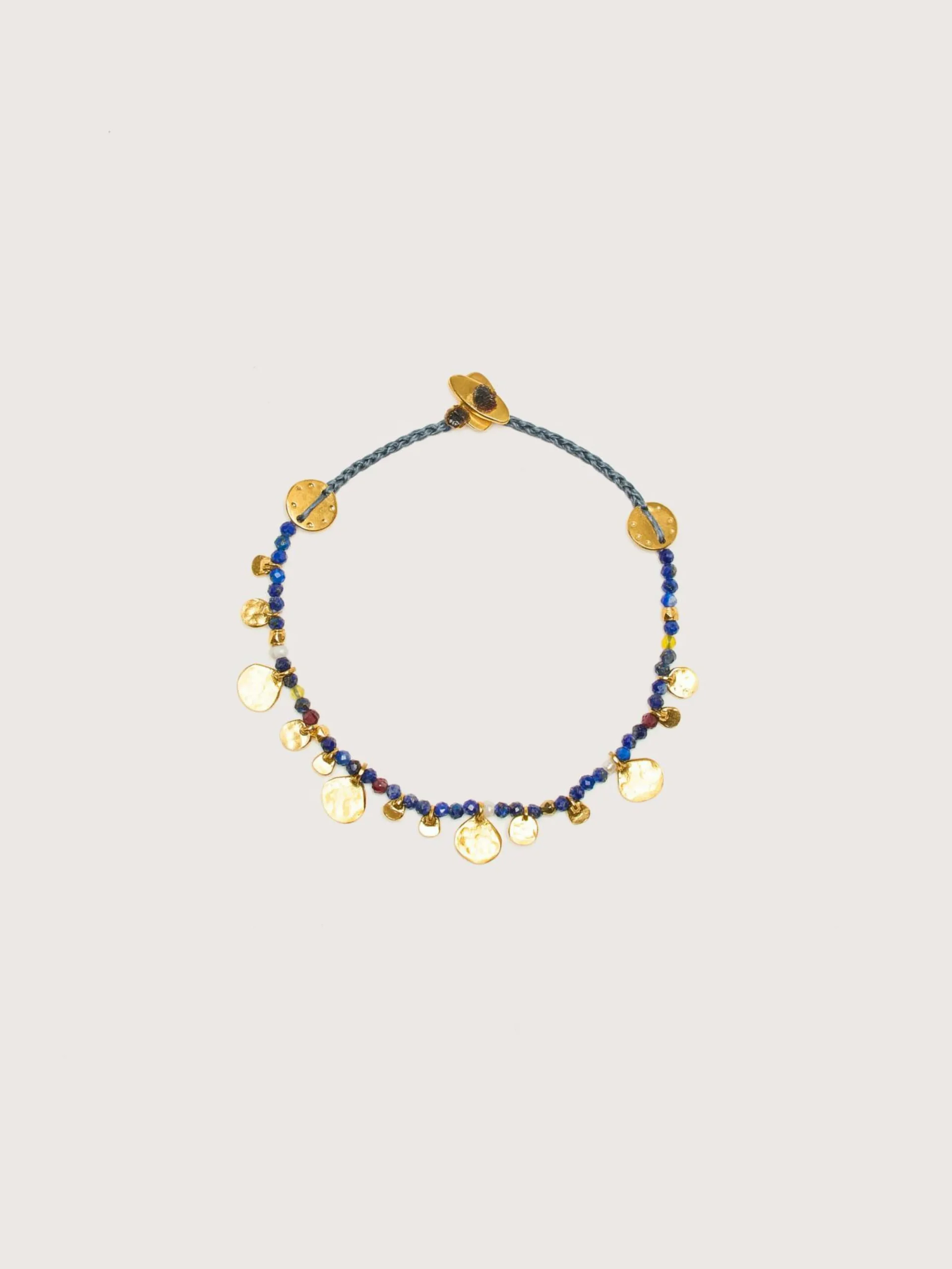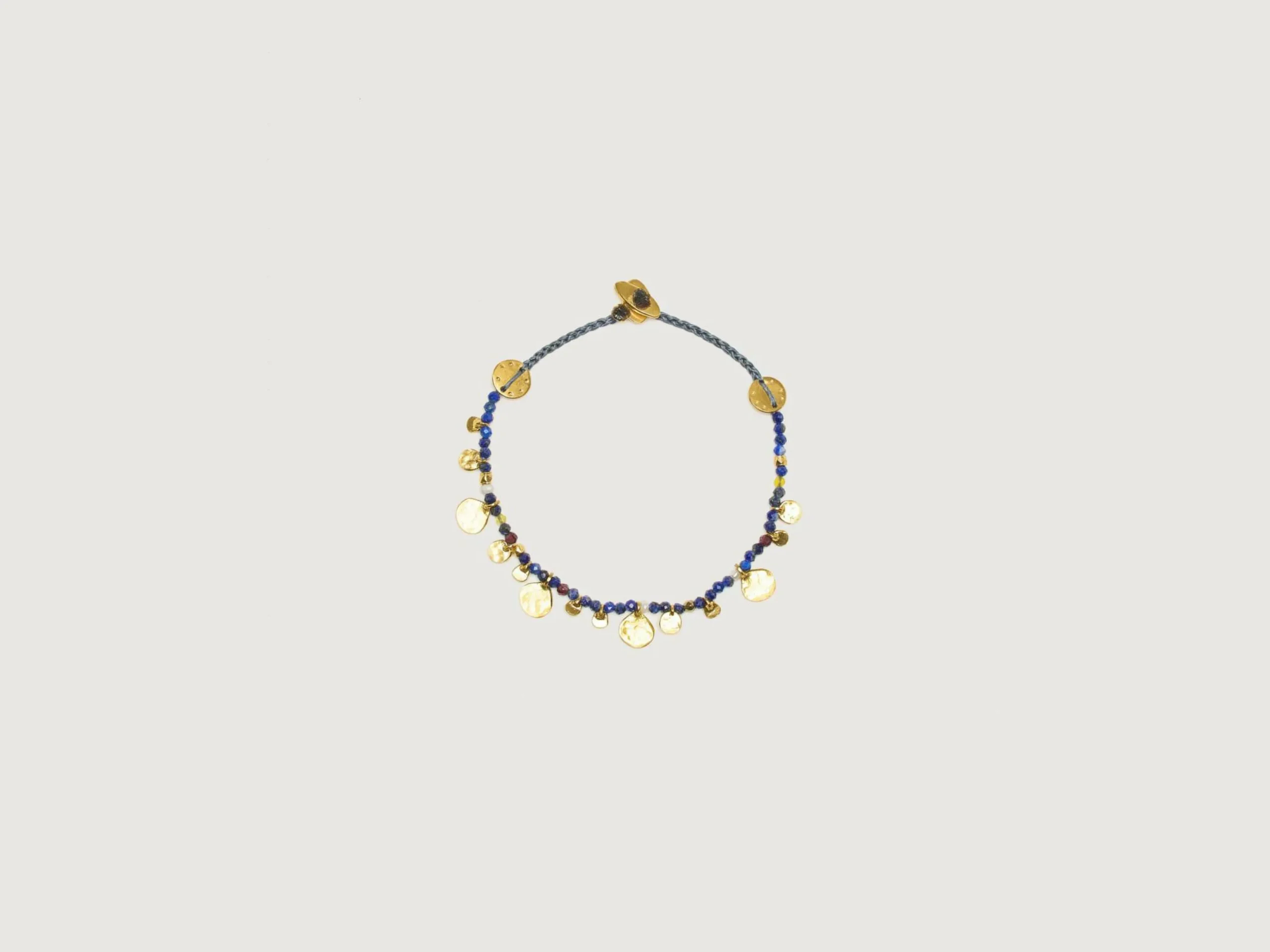 Ce bracelet de Mary Gaitani est fabriqué à la main en Grèce avec des pierres de lapis-lazuli et des breloques dorées à l’or fin (18k) sur un cordon ciré.