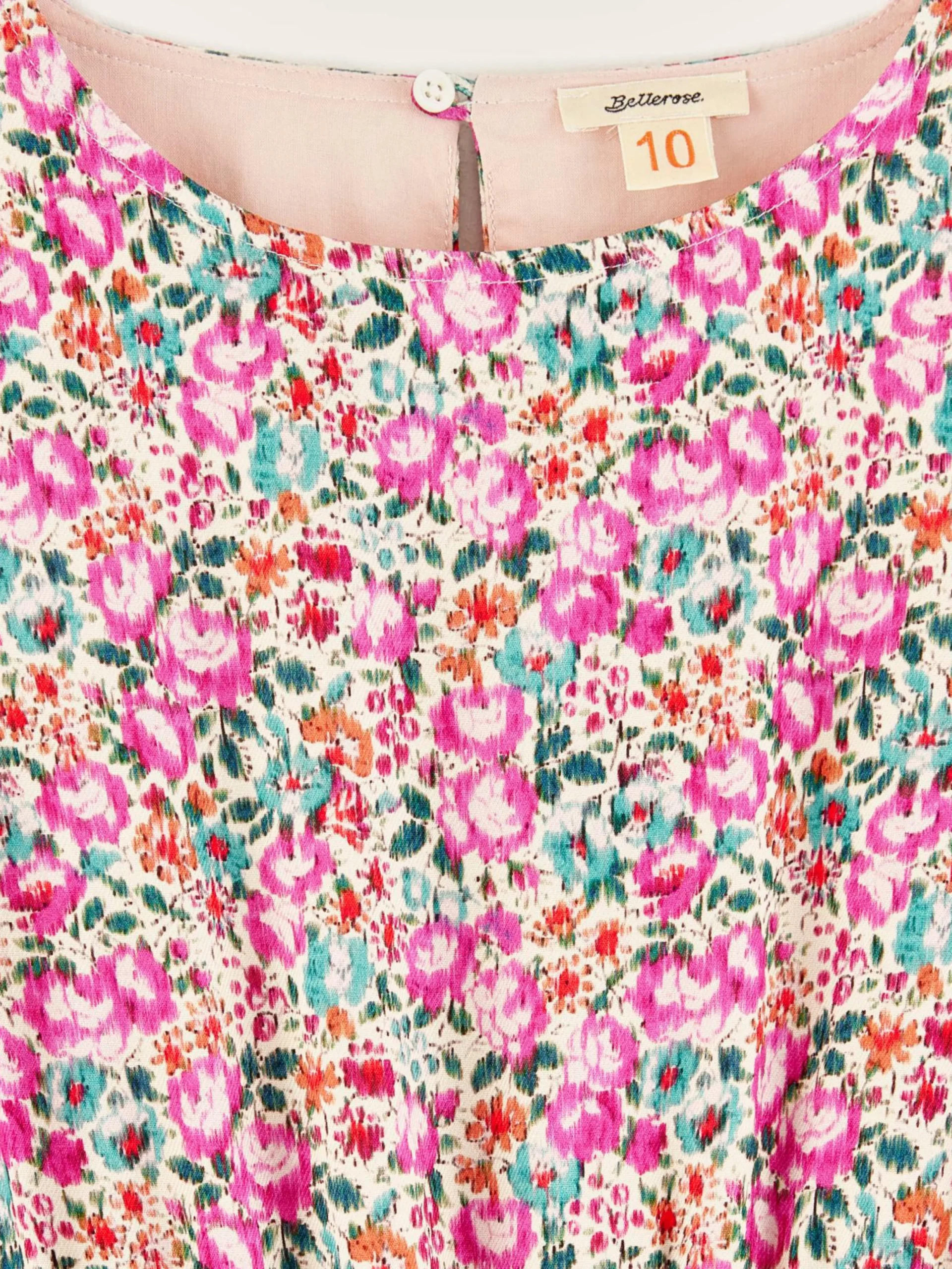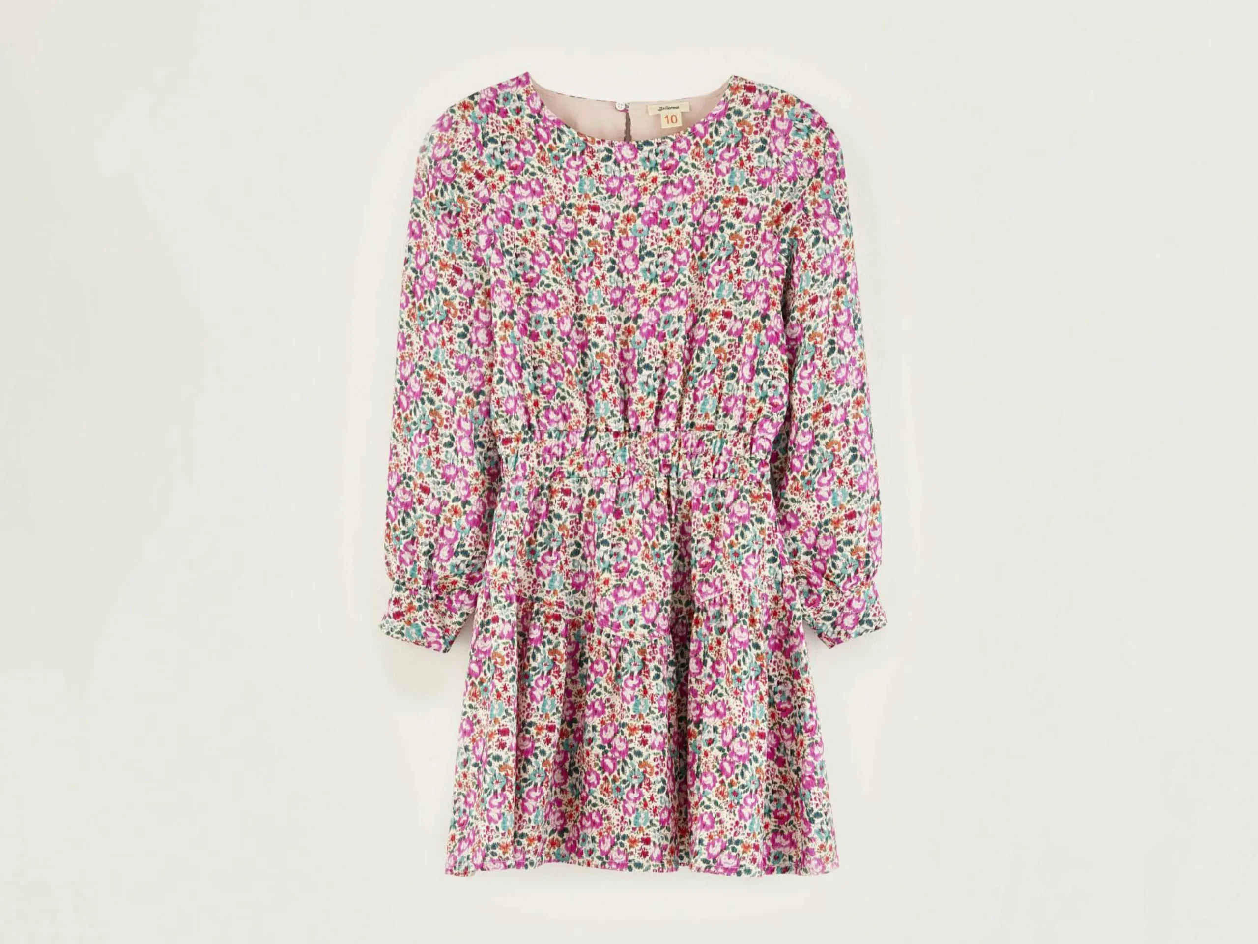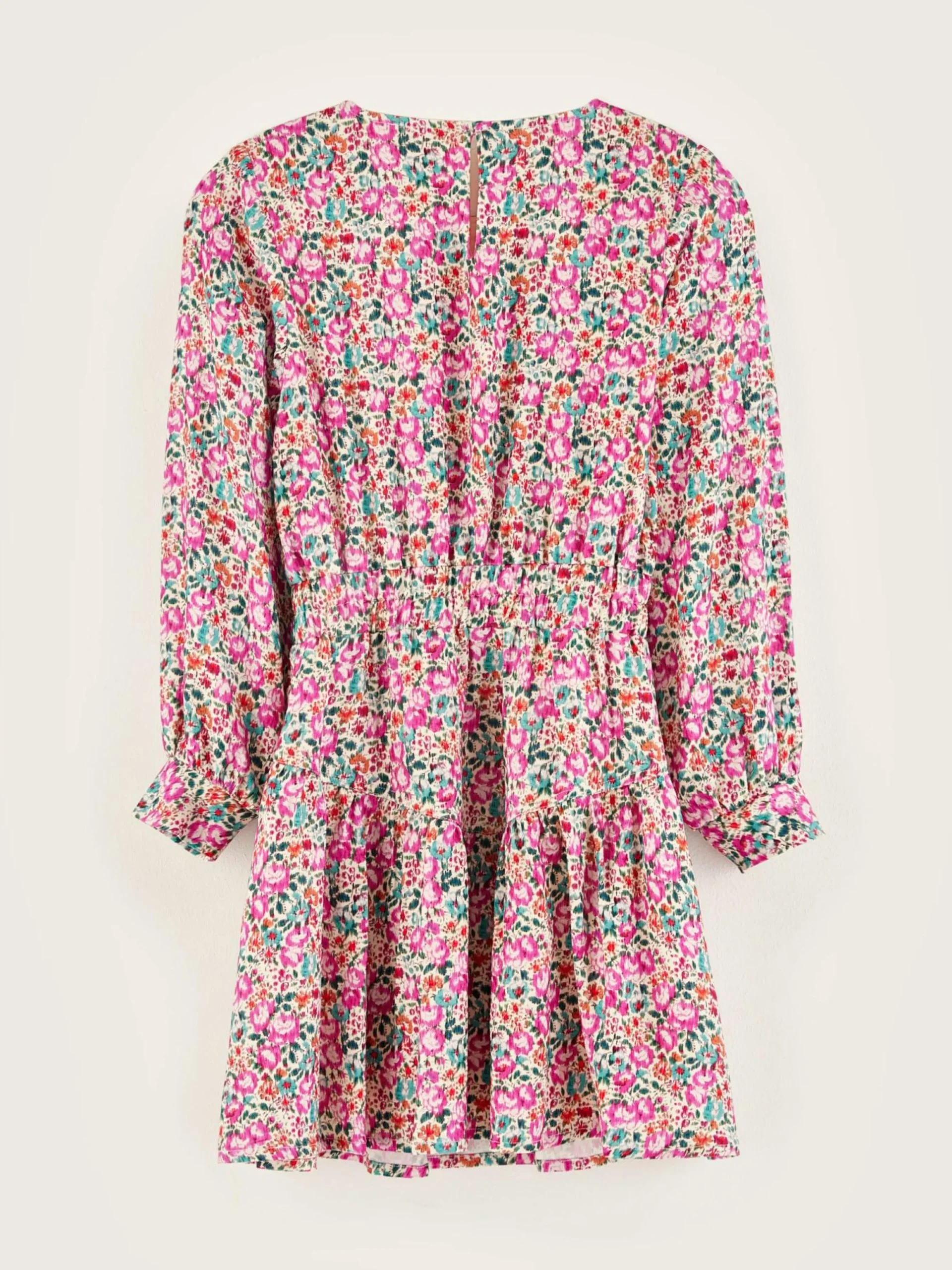 Mini robe en viscose imprimé fleuri avec taille élastiquée et détails de fronces.