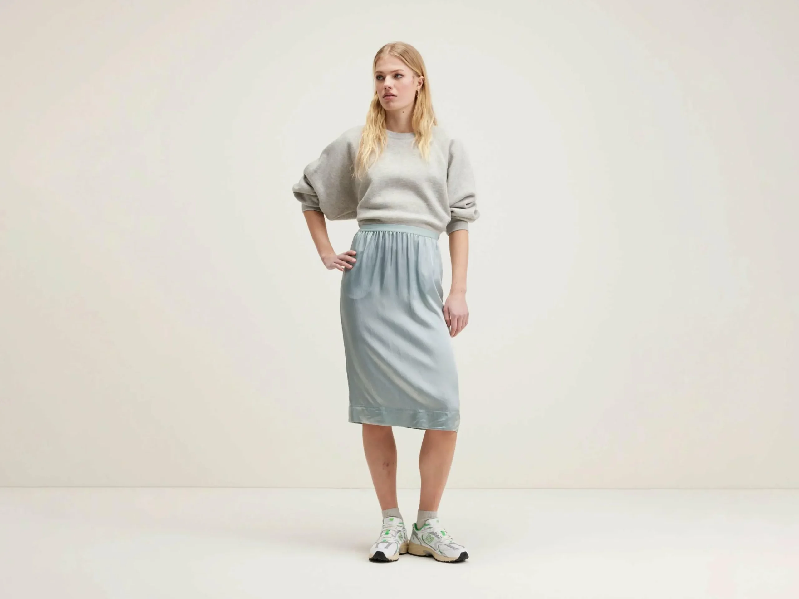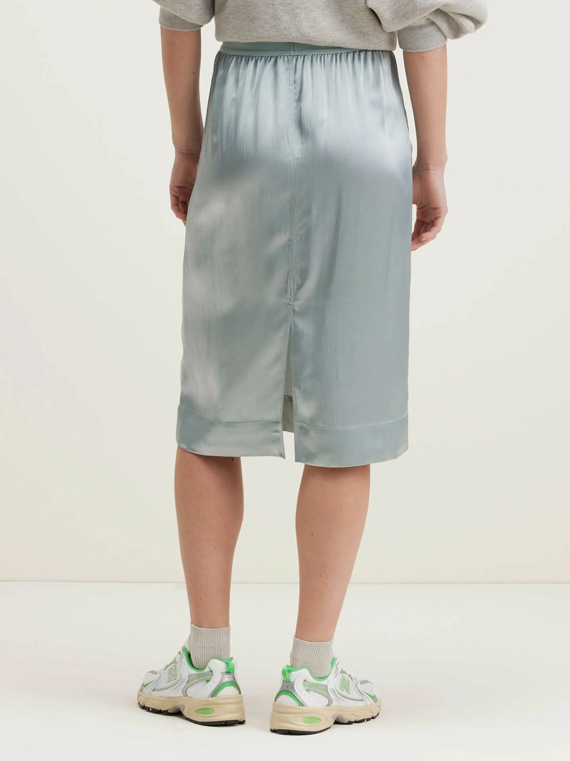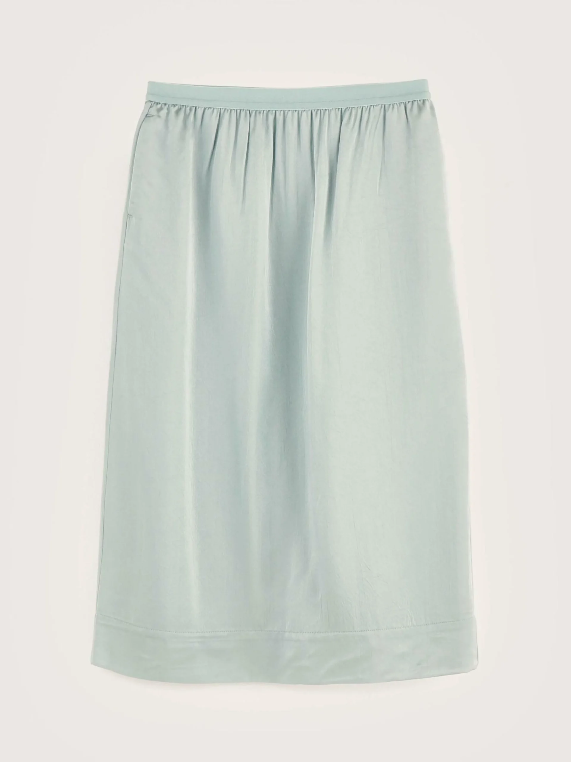 Jupe midi droite en tissu bleu clair avec un fini satiné.