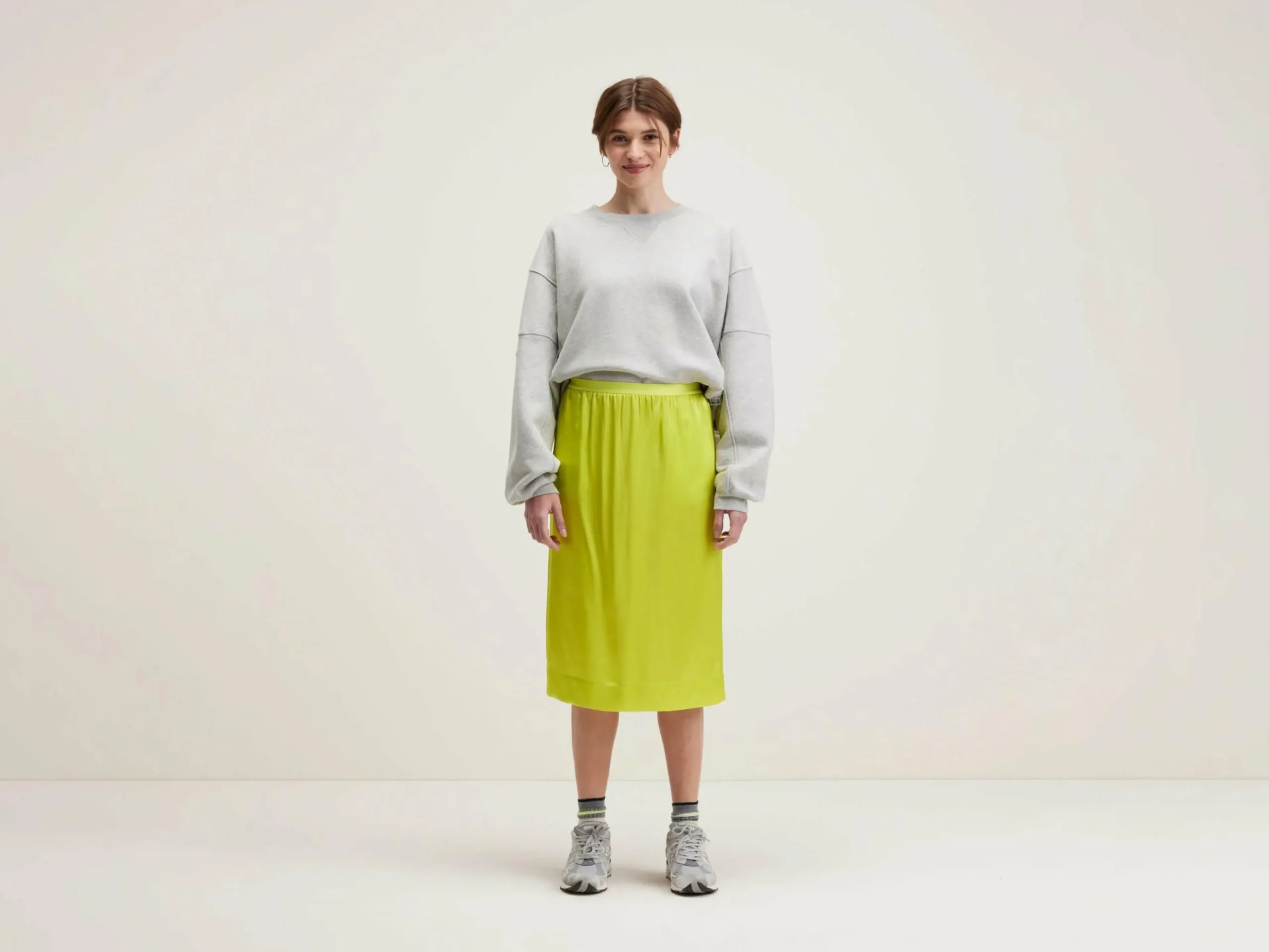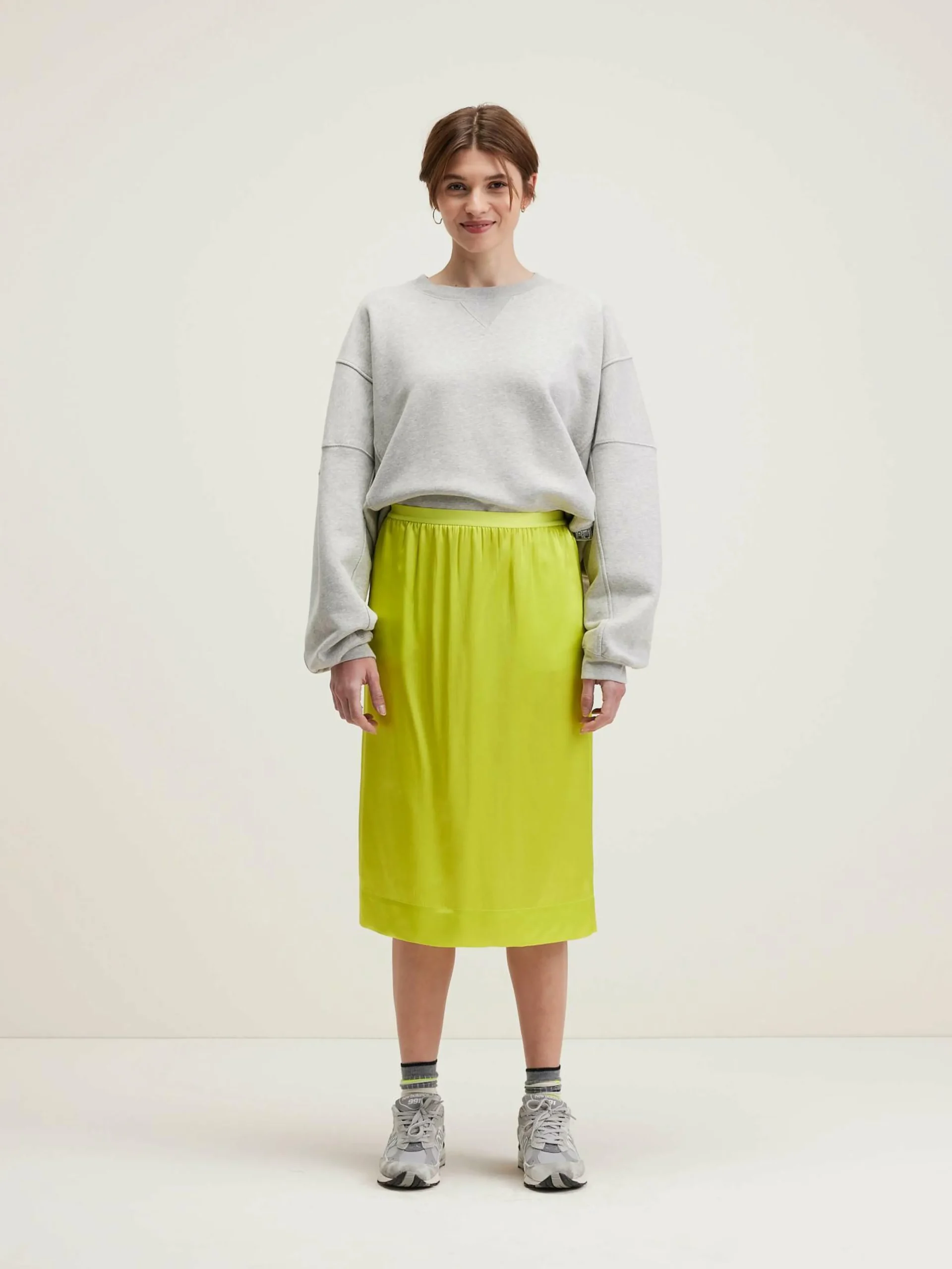 Jupe midi droite en tissu jaune avec un fini satiné.